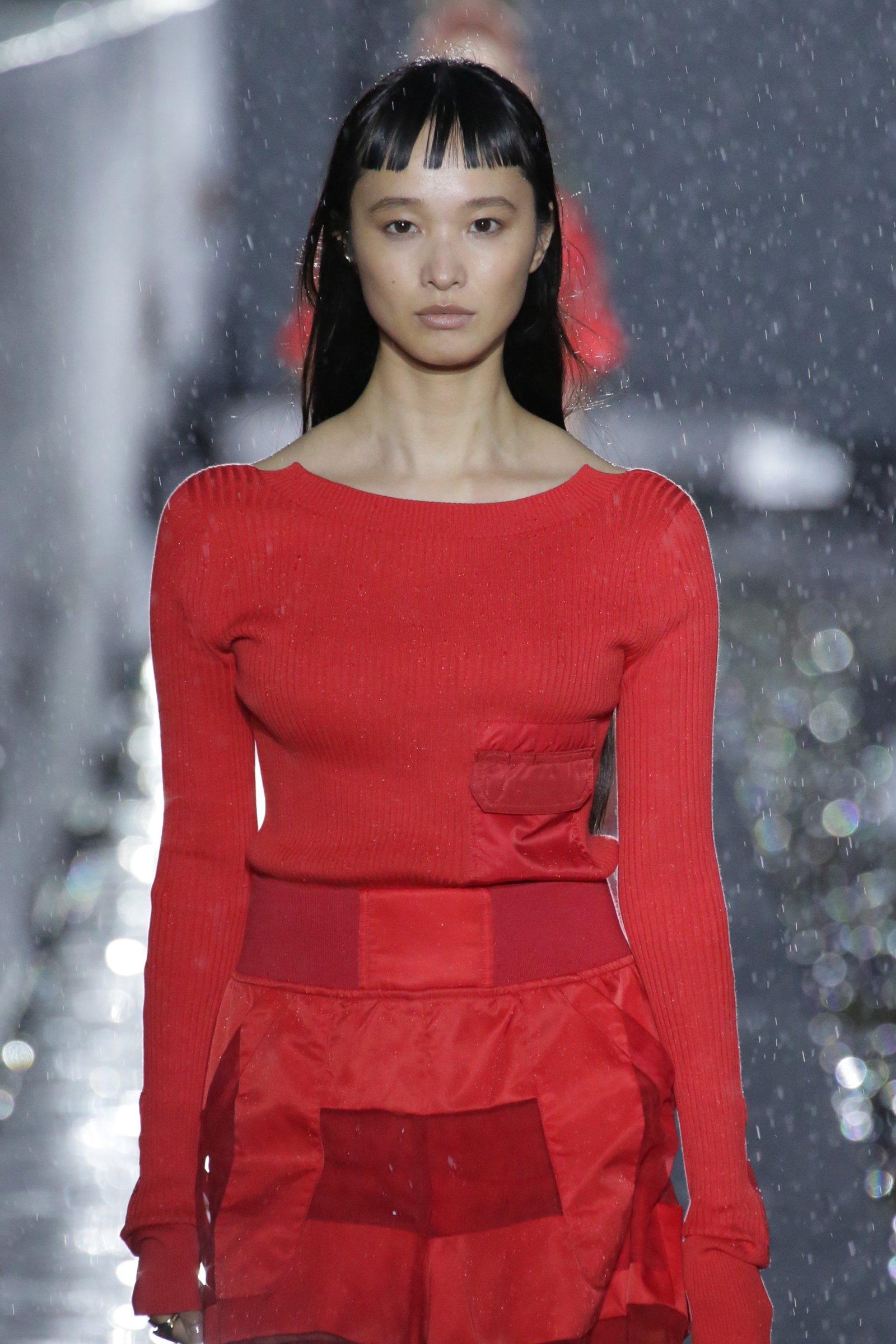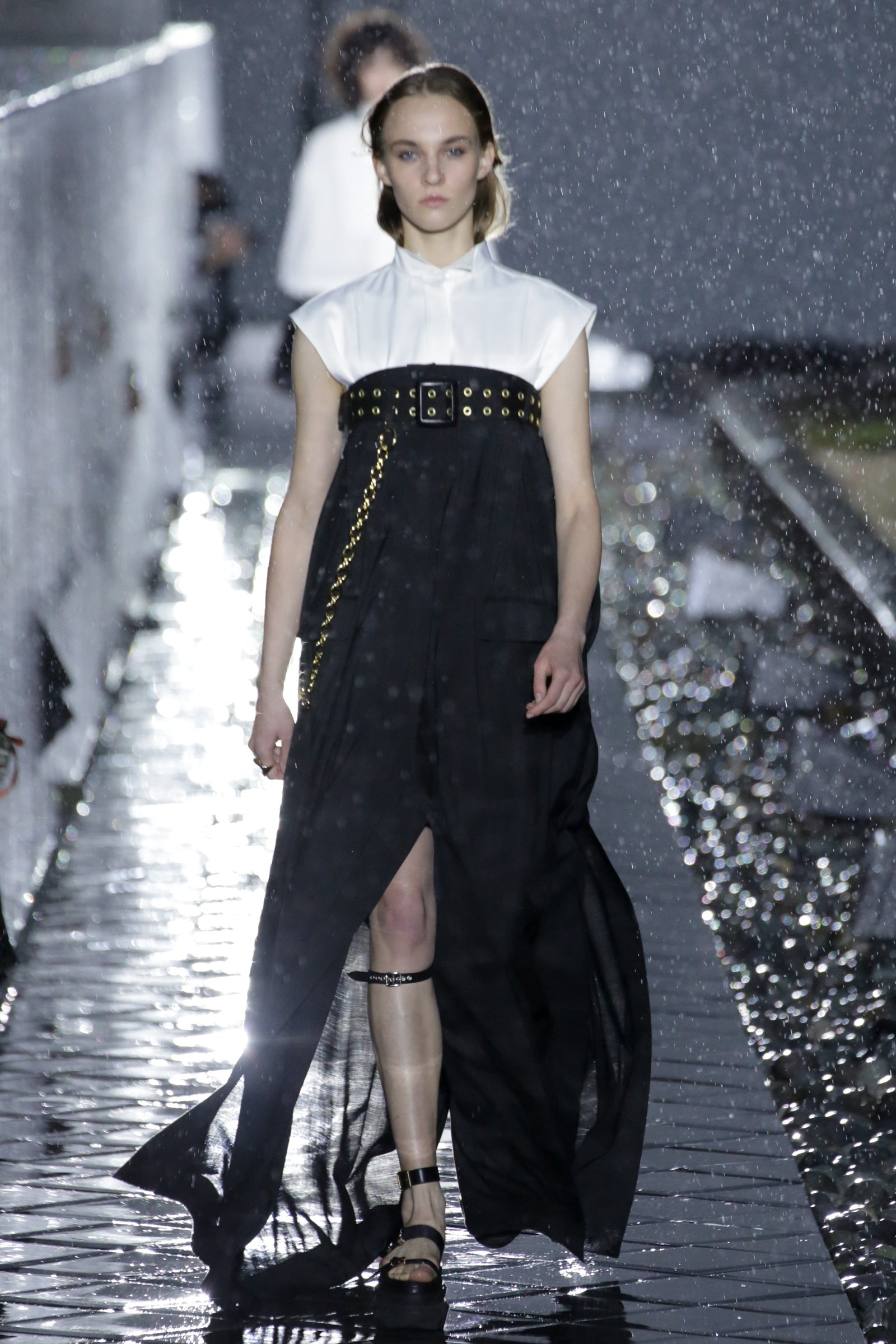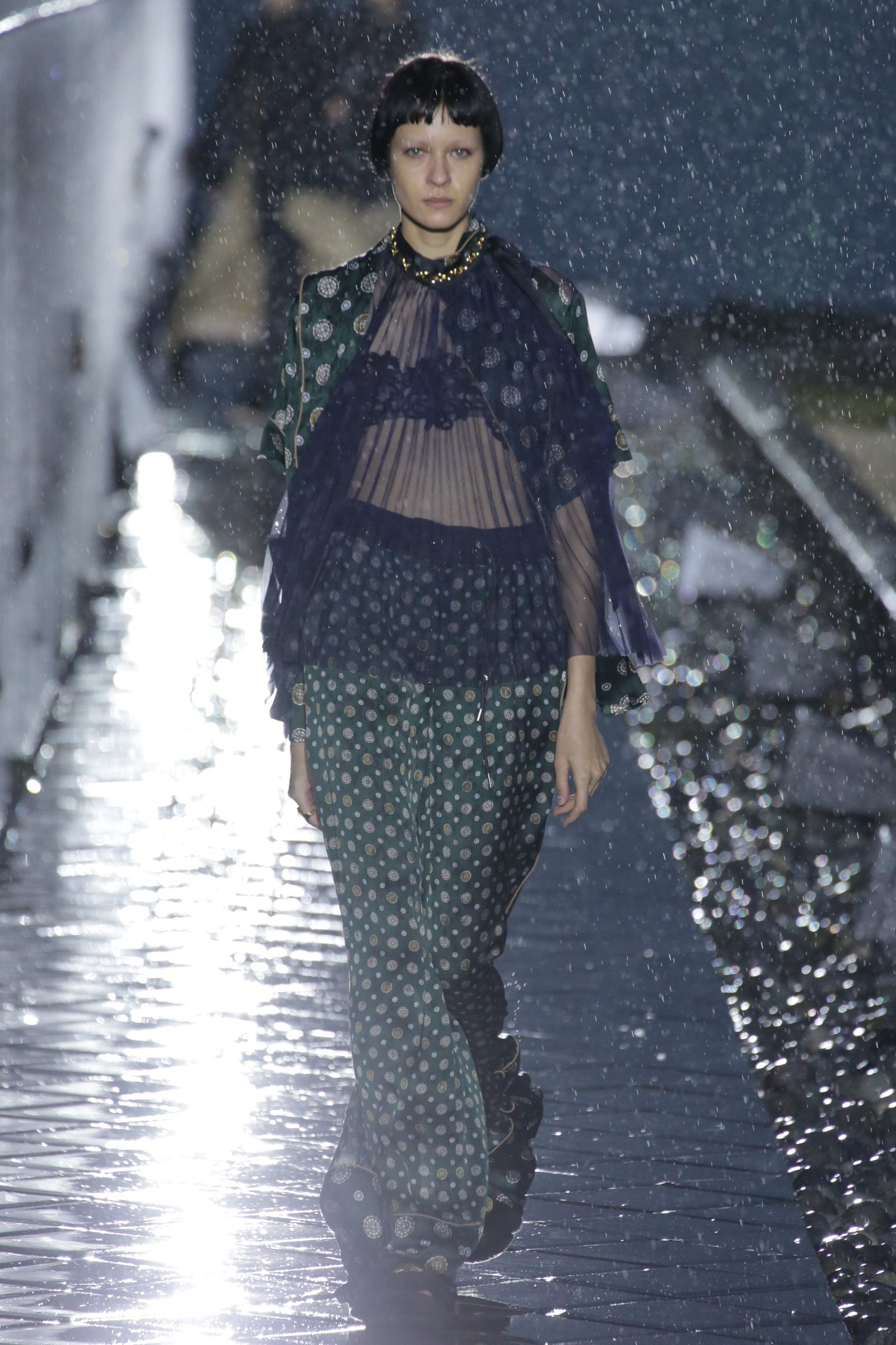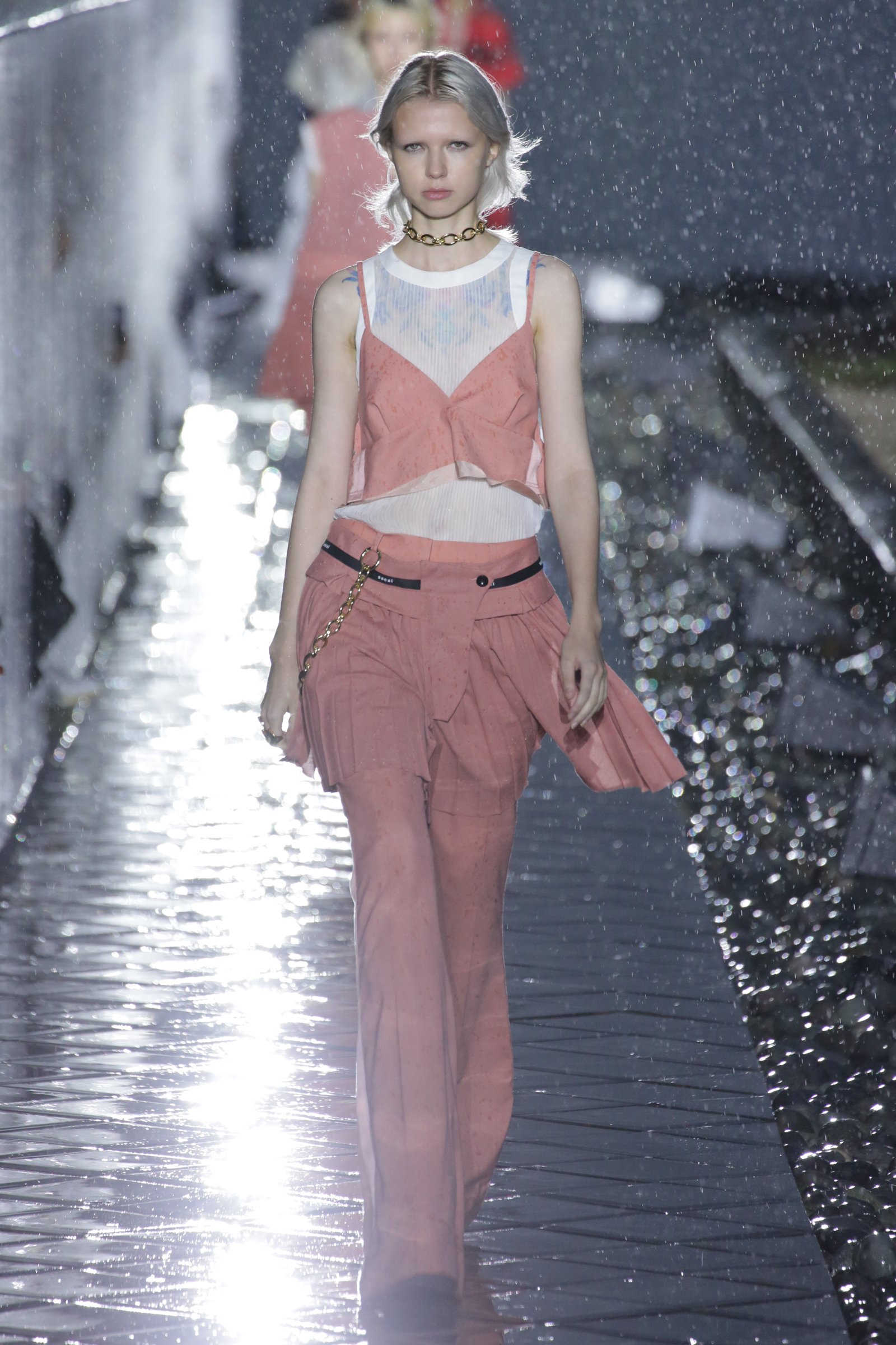 音楽と共に登場したモデルは、石に囲まれた庭園や高低差のある回廊を練り歩く。序盤はクラシカルなブラック&ホワイト。オリーブやカーキ、グレーといったベーシックカラーに、鮮やかなレッドとピンク、そしてシルバーが混じる。前回の2020-21年秋冬コレクションで打ち出した、立体的で動きによって変化するシルエットが引き継がれながらも、プレーンでウェアラブルに落とし込んでいる印象だ。ラストルックは、シルクのパジャマとランジェリーを融合したようなドレッシーなリラックススタイル。普遍的なテーラードやミリタリーの要素を複雑に絡み合わせるサカイならではのアプローチはそのままに、よりソフトで女性的なシルエットが目立った。