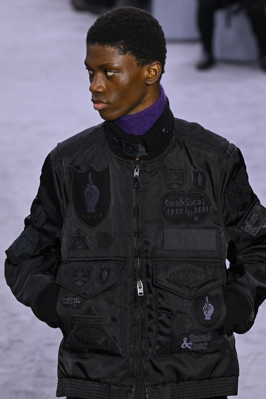 メンズのファーストルックは、"ゴンズジャケット"と呼ばれるG-8フライトジャケットをサカイ流にアレンジ。ゴンザレスが愛用していたことで、その呼び名がついたジャケットがベースとなり、左胸には人差し指のハンドサインと「ONE LOVE」の文字入りの刺しゅうワッペンが施されている。「sacaigonz」「Gonz&Sacai」など連帯を示すロゴ刺しゅうを含め、アートワークはゴンザレスが提供したものだ。