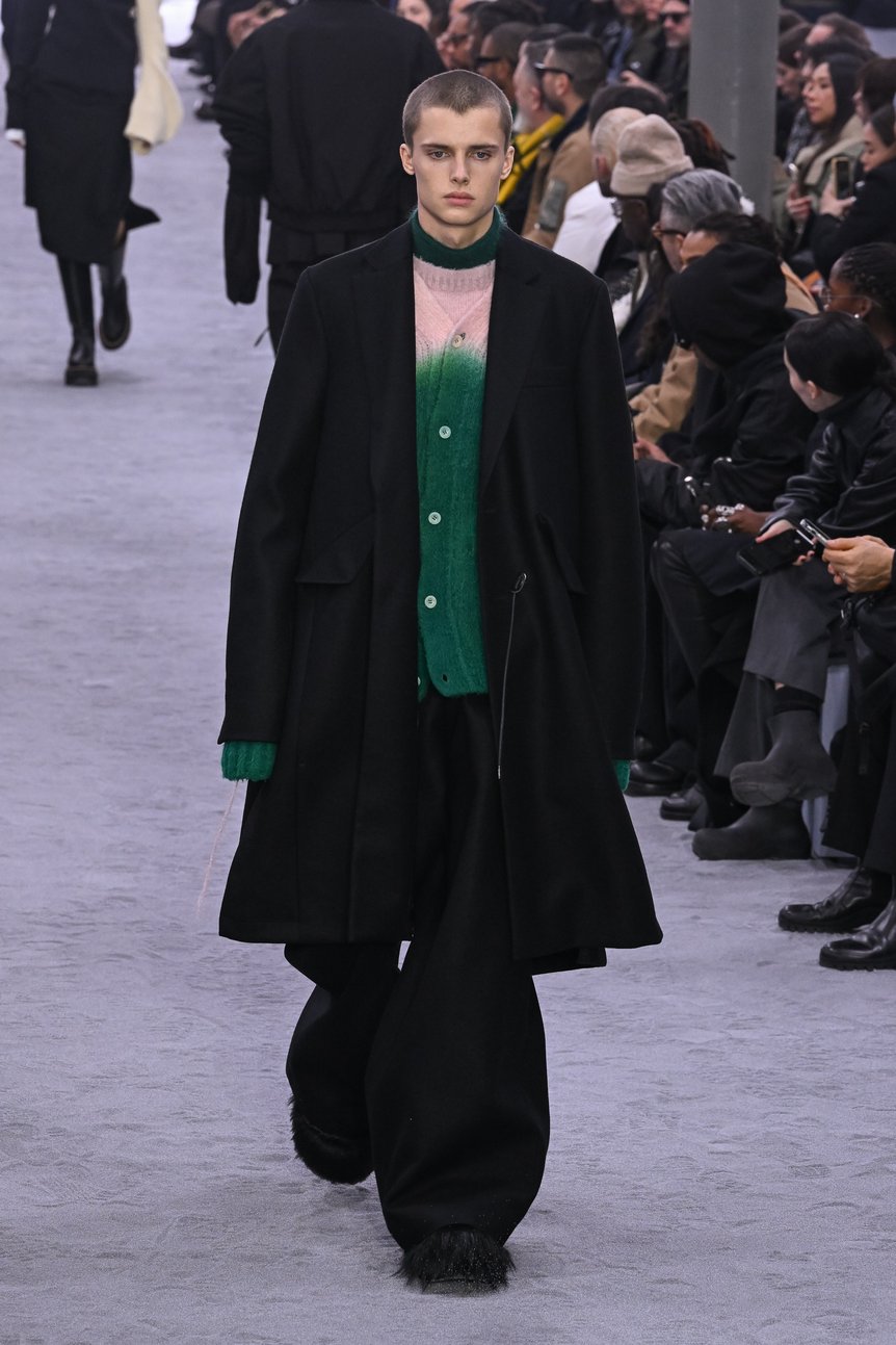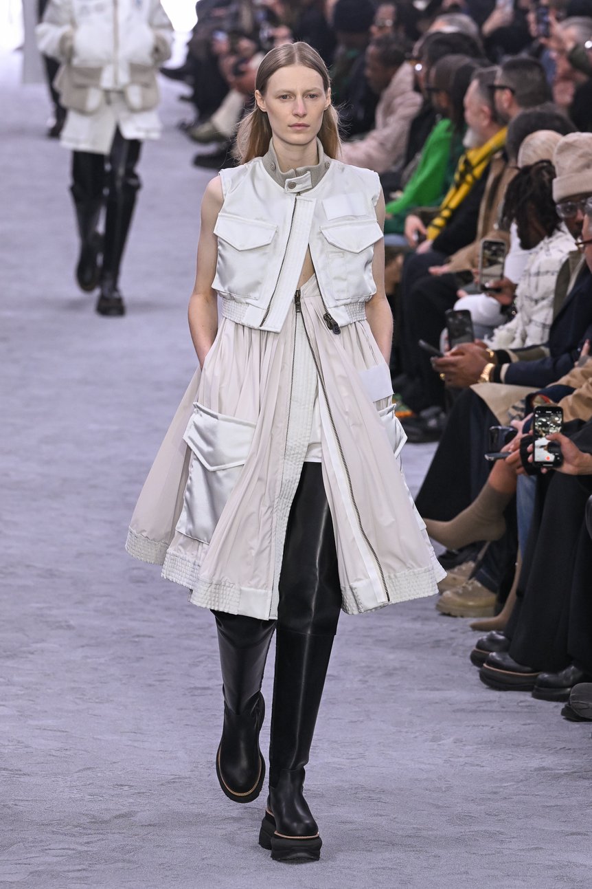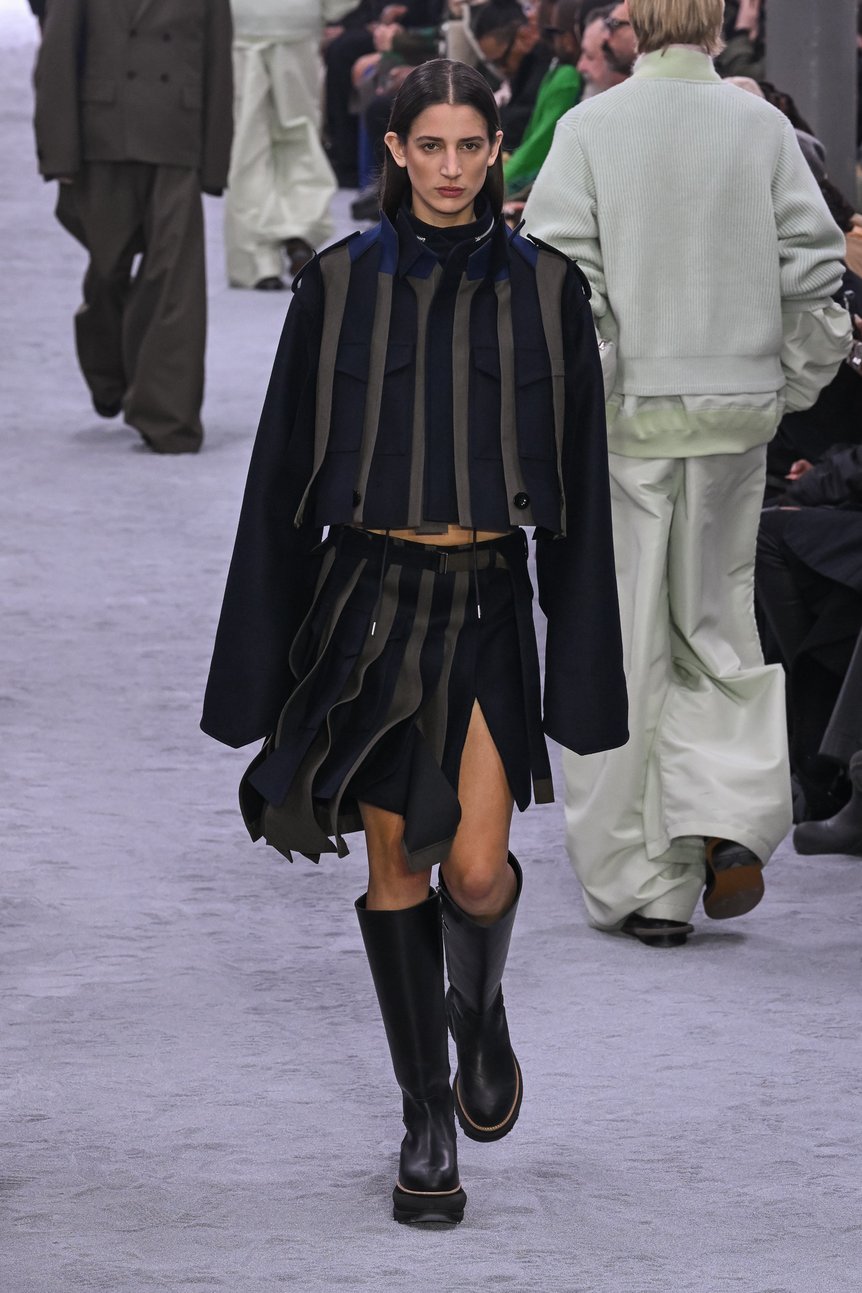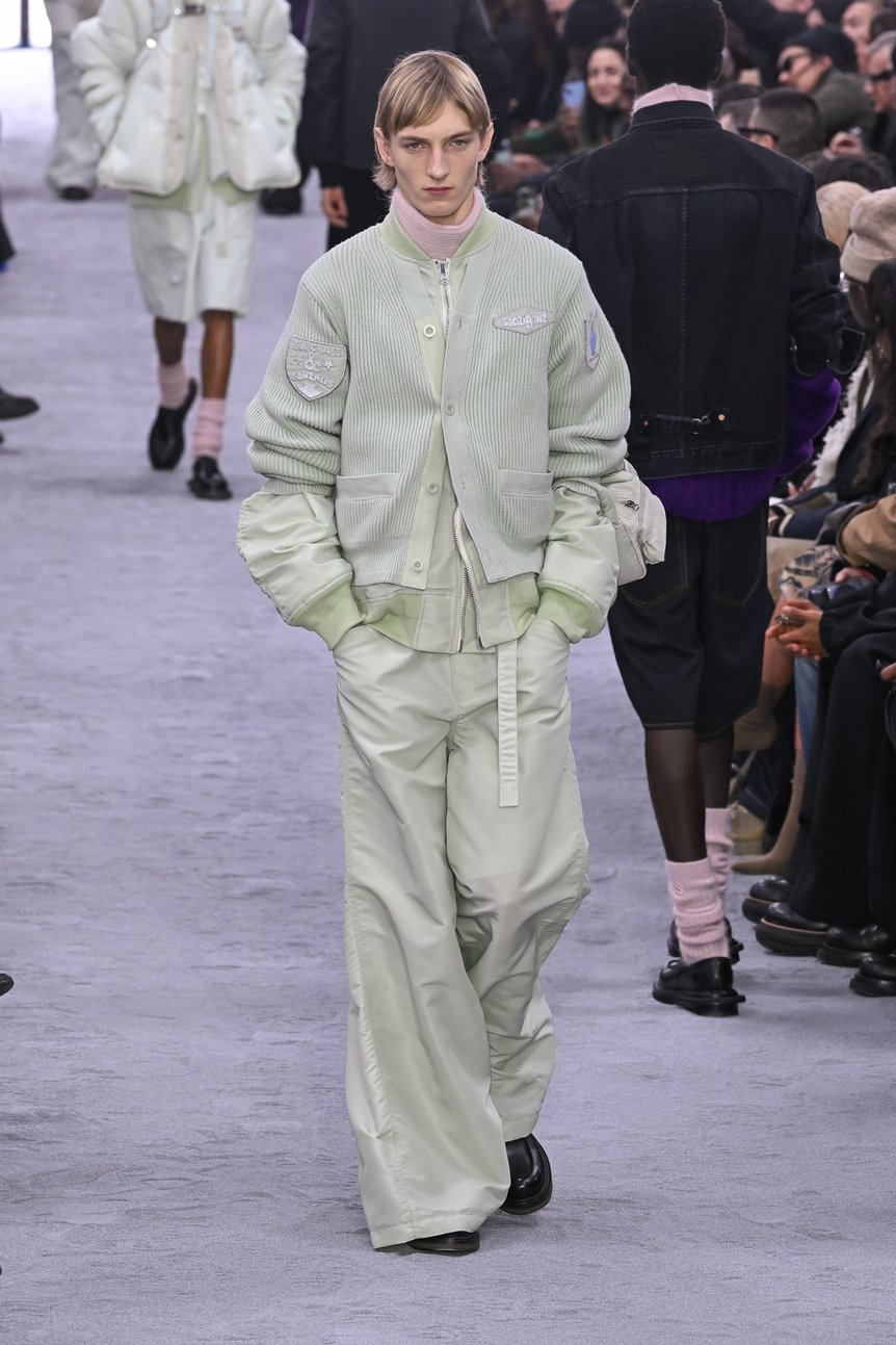 またユニフォームを独自に解釈したモノクロームのスタイルにも注目。ショーの中盤、サカイならではのレイヤードやドッキングで作る様々なスタイルが、ガーメントダイのペールグリーンに染まった。人気のグラデーションニットは、ピンク×グリーンの鮮やかなカラーで登場している。