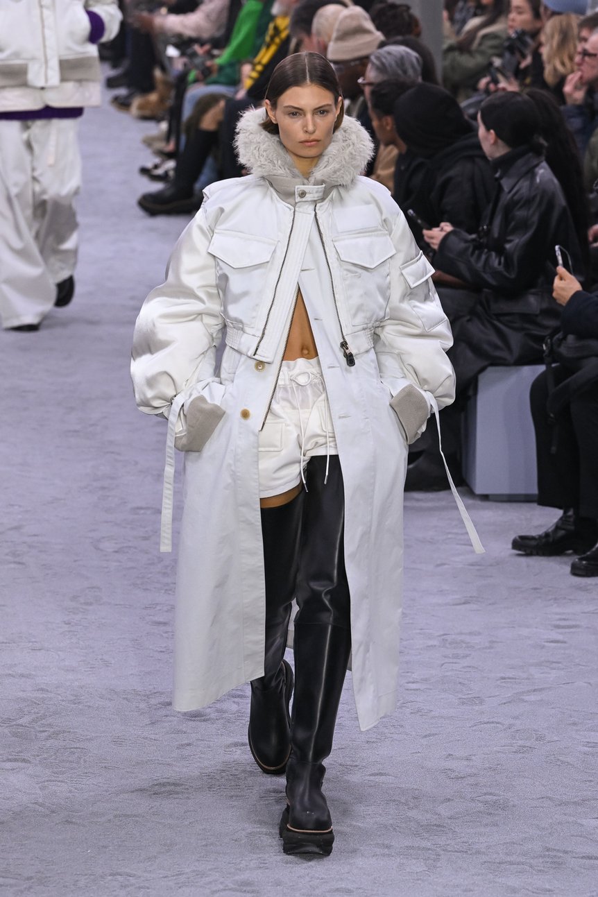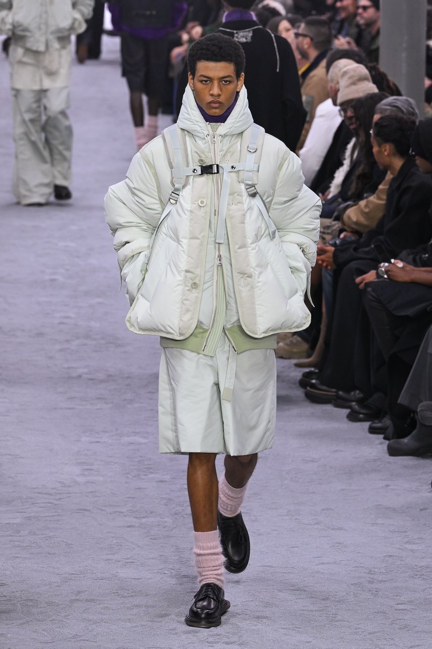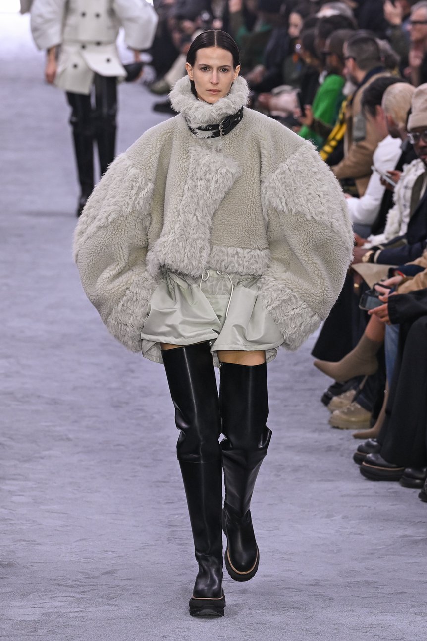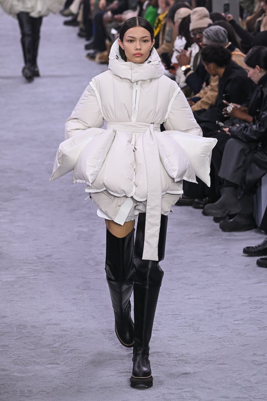 オーセンティックなウェアをベースとしながらシルエットを探究しているサカイは今シーズン、袖にボリュームを持たせたフォルムを提案。ウエストを絞ったペプラムシルエットのダウンジャケットや、ラウンドシルエットのボアジャケットなど、ボリュームのあるアウターが充実している。