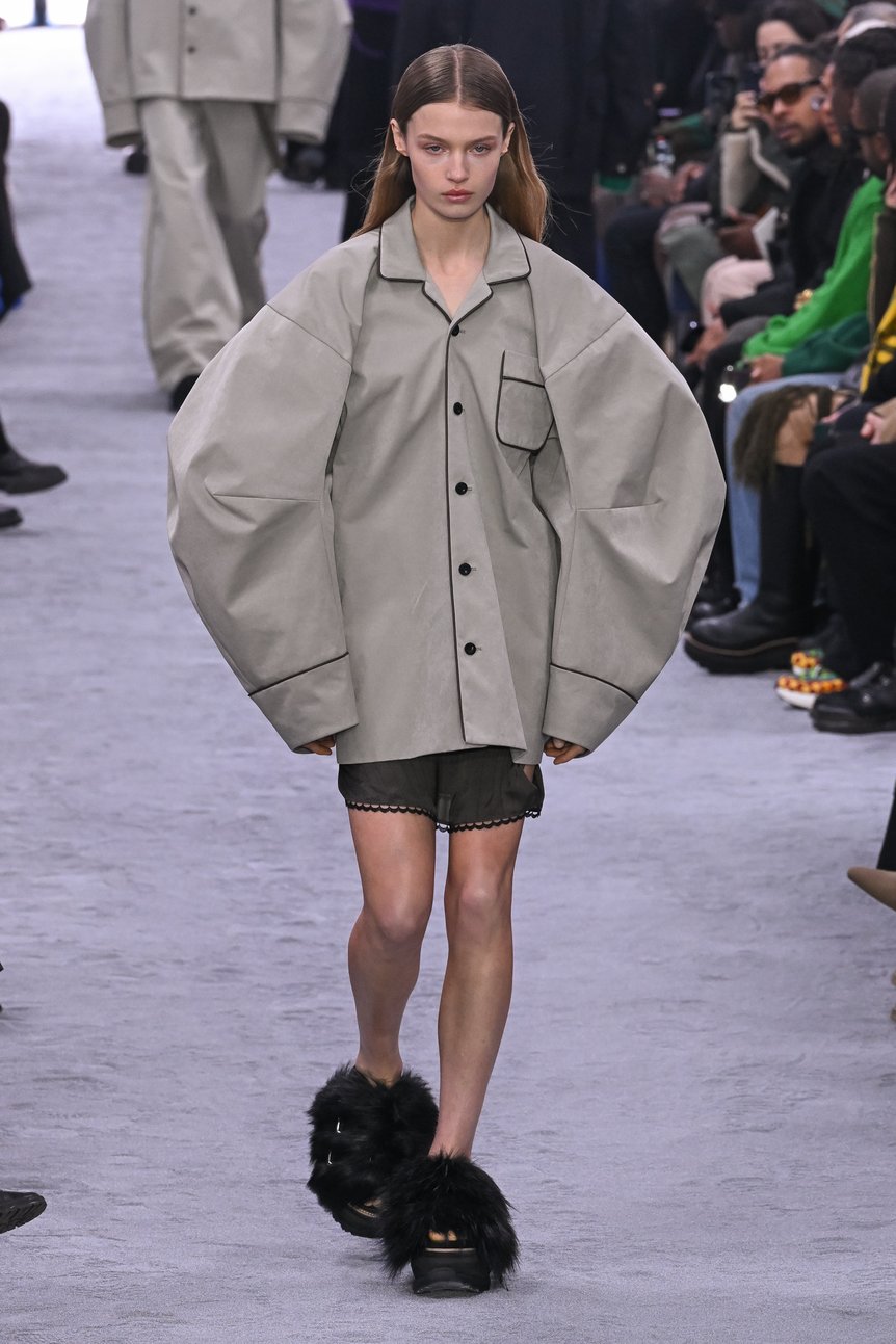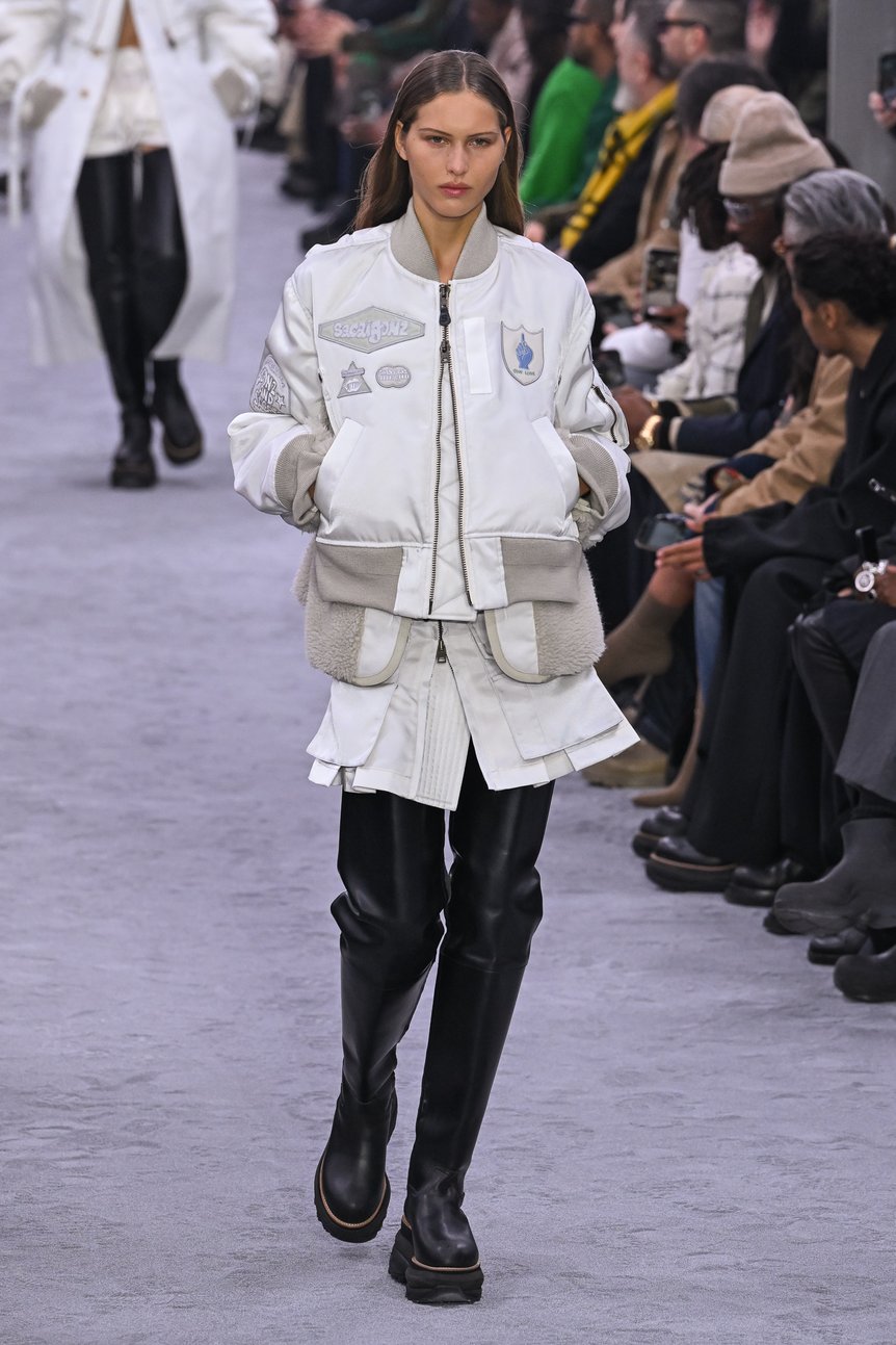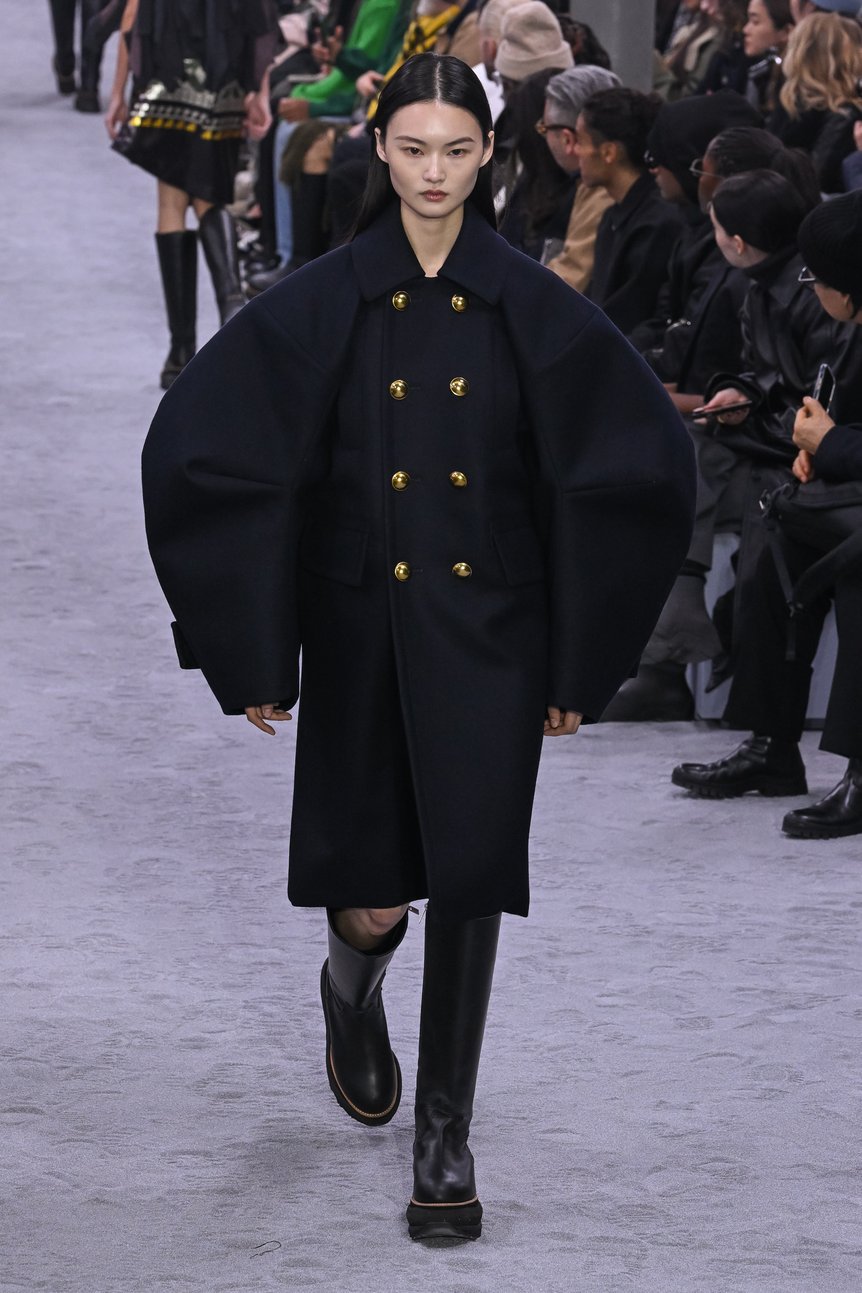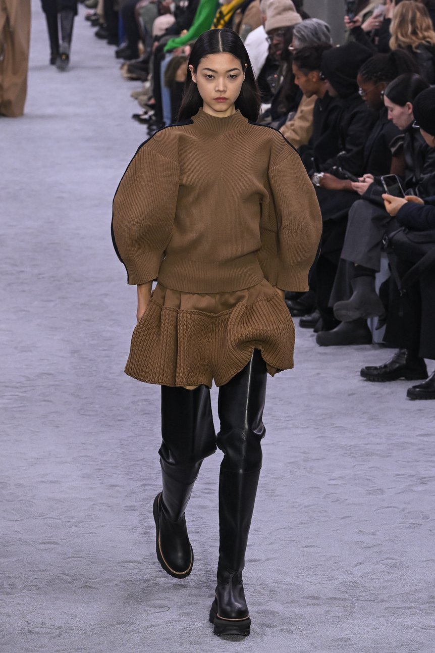 オーセンティックなウェアをベースとしながらシルエットを探究しているサカイは今シーズン、袖にボリュームを持たせたフォルムを提案。ウエストを絞ったペプラムシルエットのダウンジャケットや、ラウンドシルエットのボアジャケットなど、ボリュームのあるアウターが充実している。