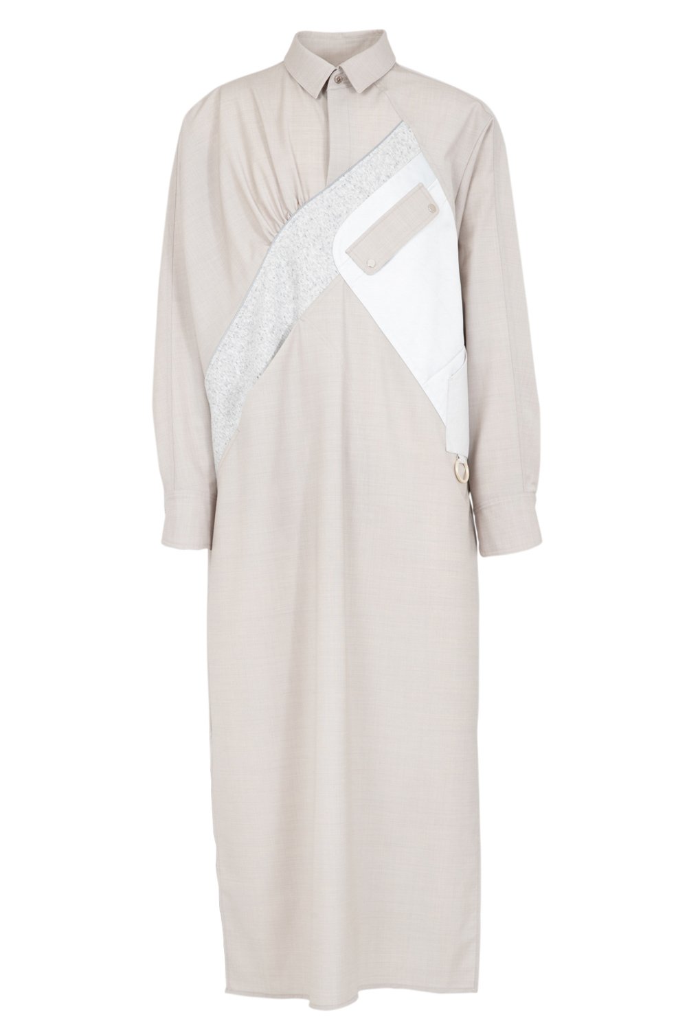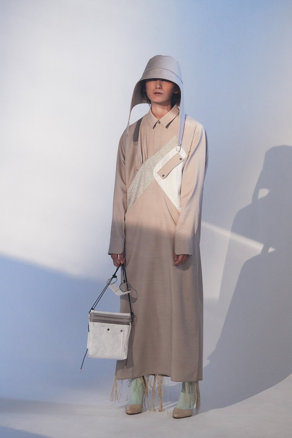 胸元のドレープや裾の落ち感が綺麗なカフタンドレスは、これ1枚でコーディネートが完成する便利な1着です。レザータッチのポリエステルやウールなど、今シーズンさまざまなアイテムに取り入れている素材のハイブリッド。触れてこそ分かる質感の違いには「デジタルに傾倒するからこそ、より"リアル"が恋しくなる」という長見氏の想いも込められています。