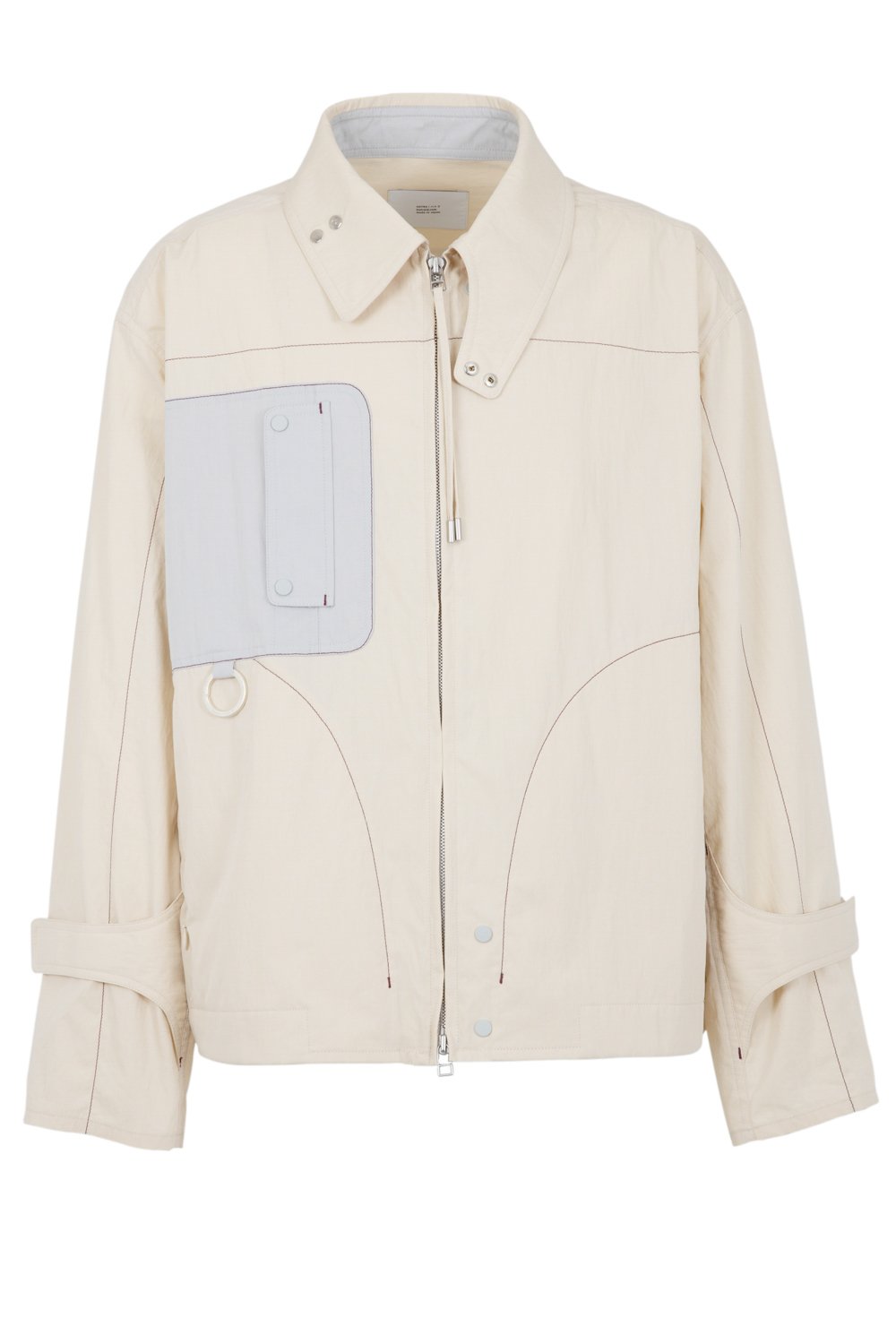 "エアポート?ジャケット"と名付けられたこちらは、今季のテーマを最も象徴するアイテムのひとつ。ステッチやウエストの絞りなどのさりげないデザインは、どんなコーディネートともマッチします。襟元の防寒用ストラップや胸元に付けたD缶風の金具など、細部に散りばめられているミリタリーのディテールは、機能性だけでなくギア好き男女の好奇心までも満たしてくれそうです。