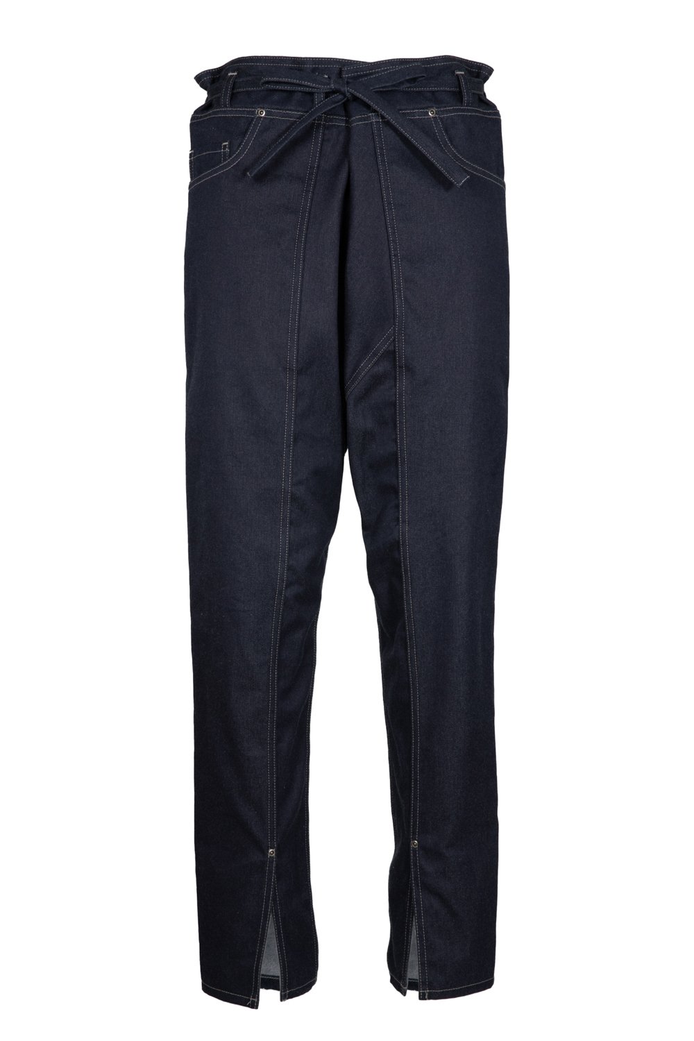 タイパンツのようなデニムは、締め付け感のないウエスト周りのデザインがポイント。ハトラが9月に発表したホームウェアのボトムスと同じパターンを採用しており、ストレスのない気心地が魅力です。カジュアルだけどシュッと見えるパンツスタイルにぴったり。