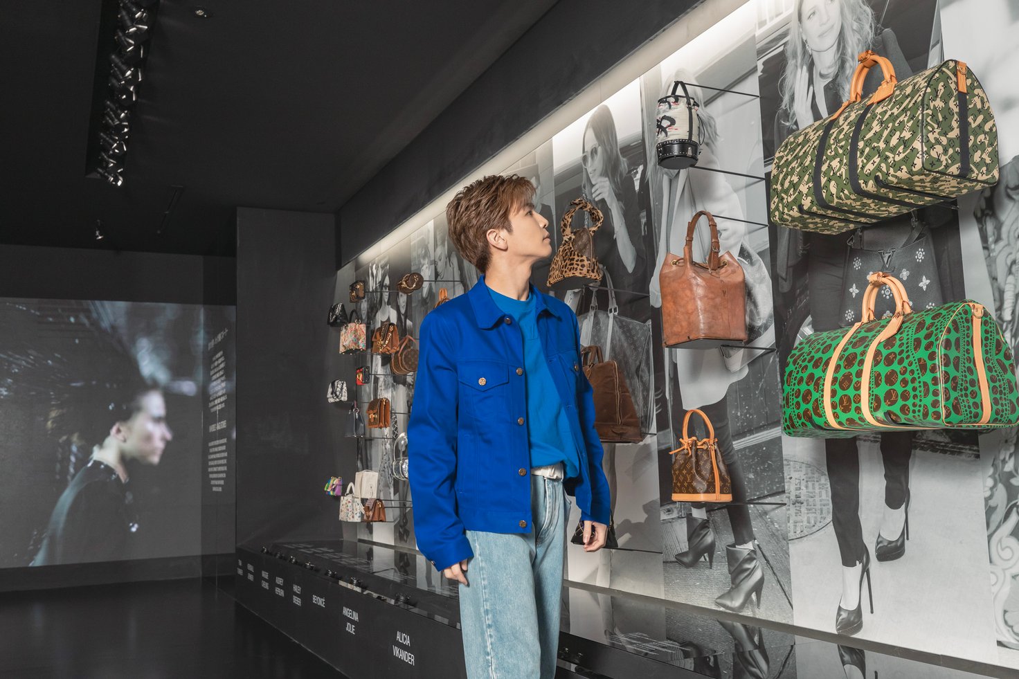 「第3の世界 - バッグが紡ぐストーリー」では、過去から現在に至るルイ?ヴィトンのアイコンバッグを展示。「僕、気に入ったらめちゃくちゃ使うタイプなので、ルイ?ヴィトンさんのバッグはずっと愛用していますね。当たり前ですがバッグも服も素材がしっかりしていて、長く使える。そこはきっとブランドのポリシーなんじゃないかな」と話しながら、一つ一つのアイテムに見入ります。