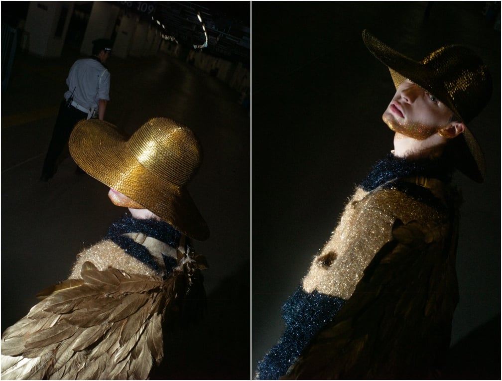 「夜道を散歩した時に考えたコレクションだから」と書いてあったから、白→青→黒→黄色と移り変わるアイテムカラーが、日が沈み、星が煌めき、また朝日が昇り鳥が飛ぶ毎日の営みのように感じられる。散歩にはいつも某プレミアムなビールを飲んでいたからと綴られていたから、深いブルーとゴールドの組み合わせは某ビールの配色だと気づいてくすりと笑ってしまう。「ビールも手伝って、頭の中の真っ白いキャンバスに絵が描かれていく」と教えてくれたから、ゴッホのように麦わら帽子を被ったモデルに理解が及ぶ。