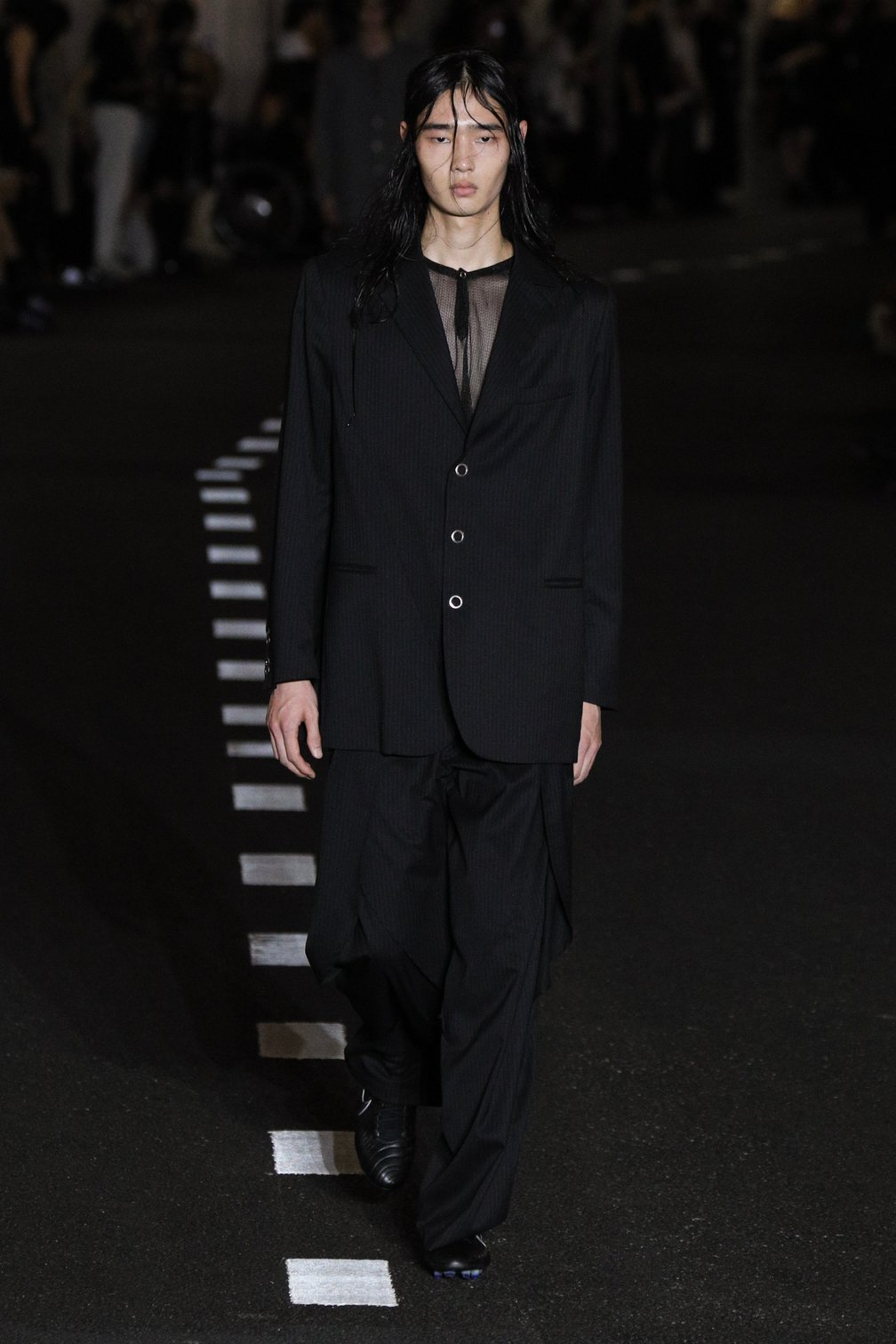 ファーストルックから3体続くテーラードスタイルのルックの、洗練されたシルエット、しなやかで光沢感のある生地、絶妙なグレートーンは、シュープらしさを変わらずに提示しながらも完璧にその薄暗く湿度の高い空間に似合う。東京の空気を通して見たビル街の黒、グレー、ベージュ、白、豊かな緑の色彩は馴染み深く安心感を覚えるような美しさがある。