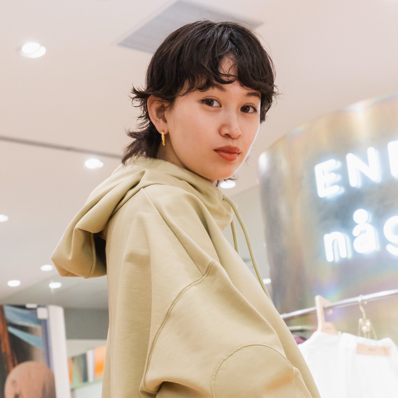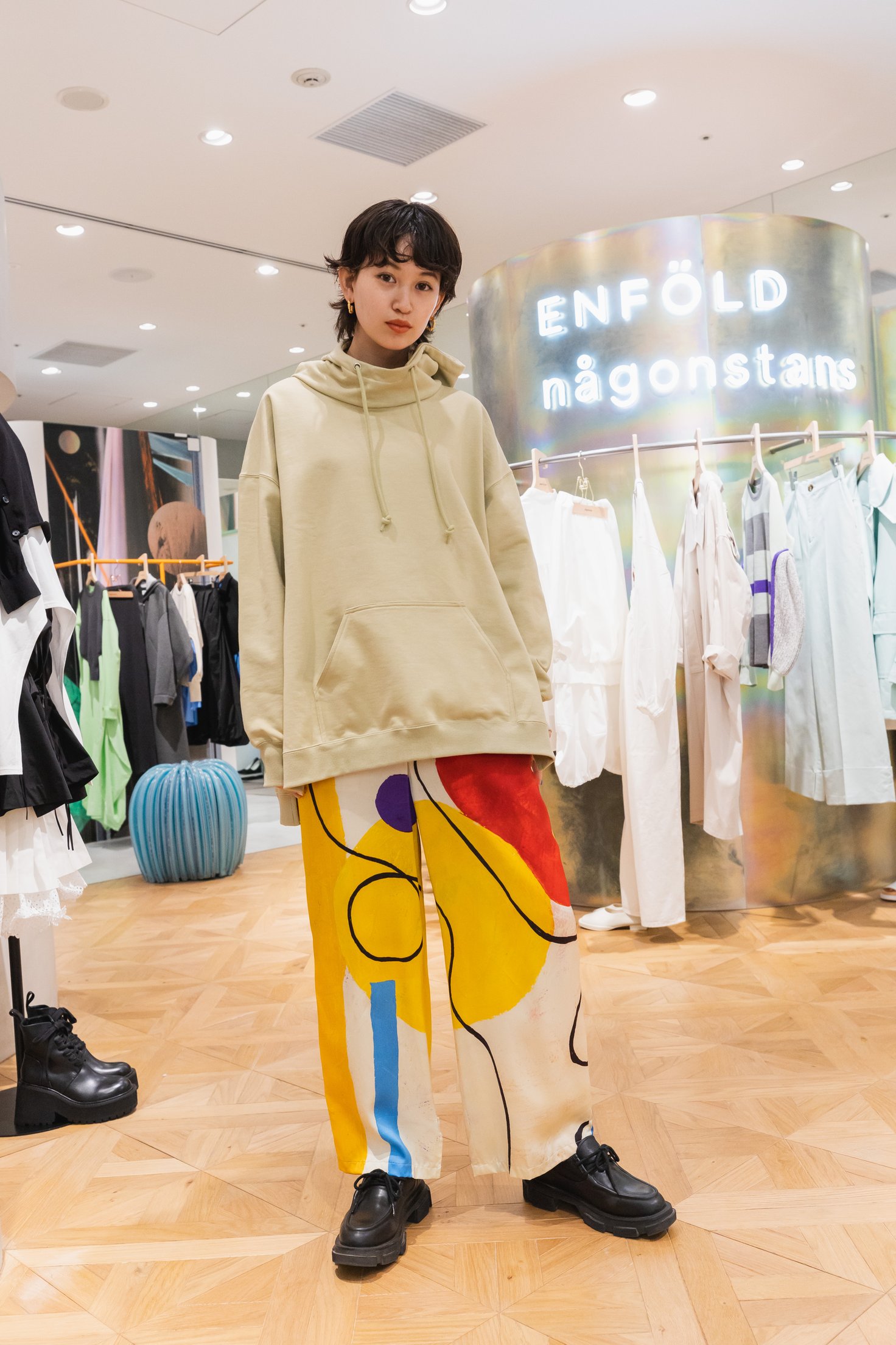 普段から柄を多く取り入れるMichelleが「エンフォルド / ナゴンスタンス(ENF?LD / n?gonstans)」でピックしたのは、デザイナーオリジナルの絵をプリントしたインパクト大なワイドシルエットパンツ。デニムやスカートなど様々なボトムスとの相性がよいハイネックデザインのパーカーともマッチしています。