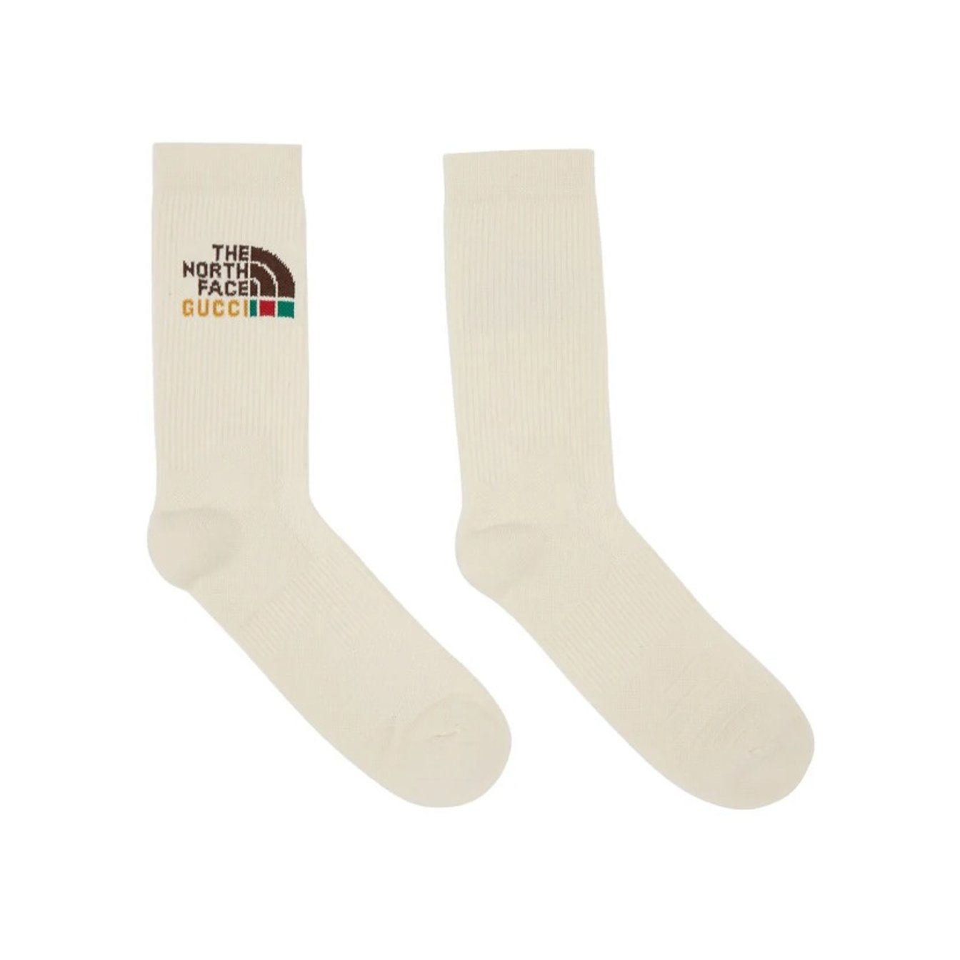 「グッチ(GUCCI)」と「ザ?ノース?フェイス(THE NORTH FACE)」のスペシャルなコラボソックス。両ブランドのカラーが際立つユニークなダブルネームが入り、足元に個性を添えるデザインです。