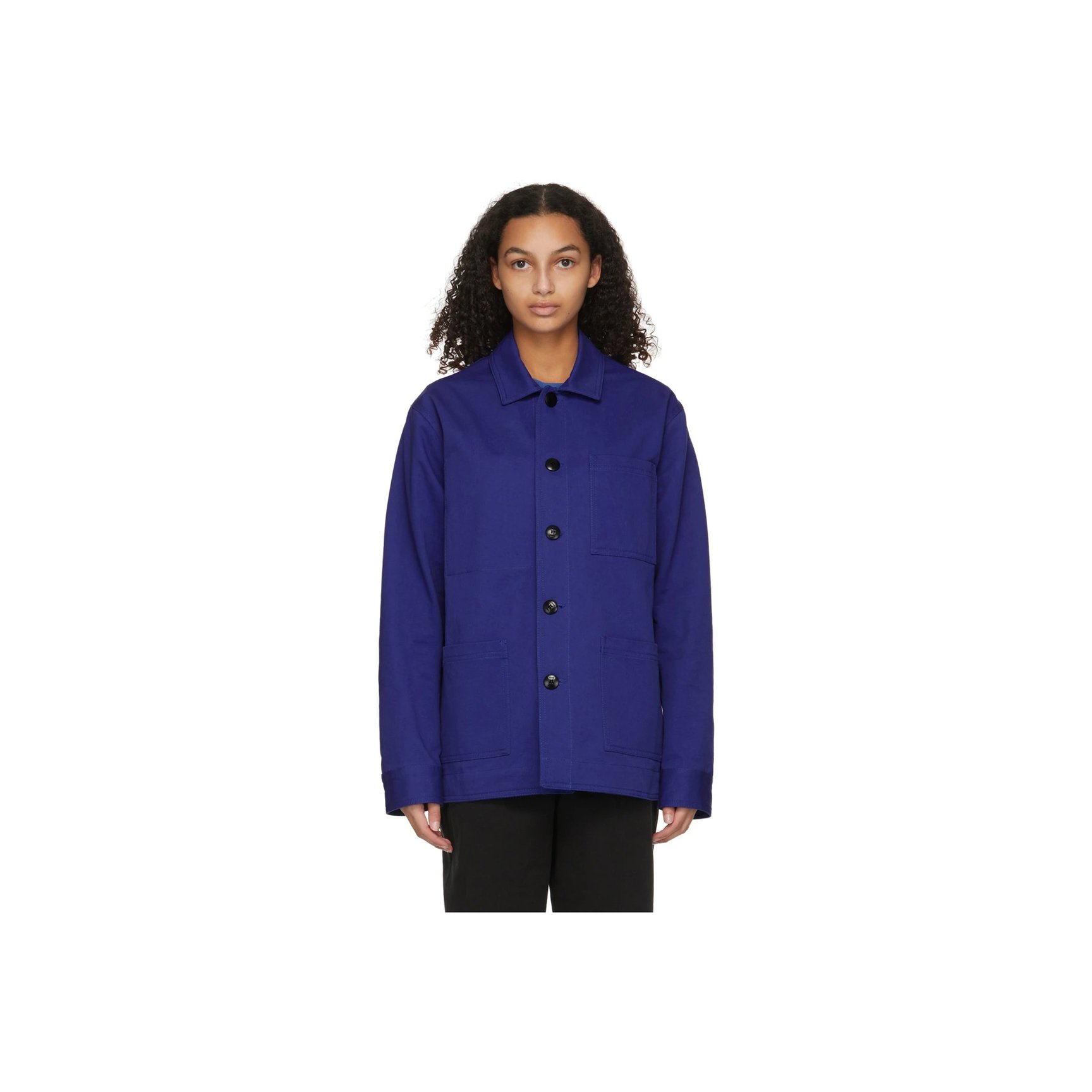ロイヤルブルーのコットンツイルジャケットは、シャツ風のコンパクトなボックスシルエットです。