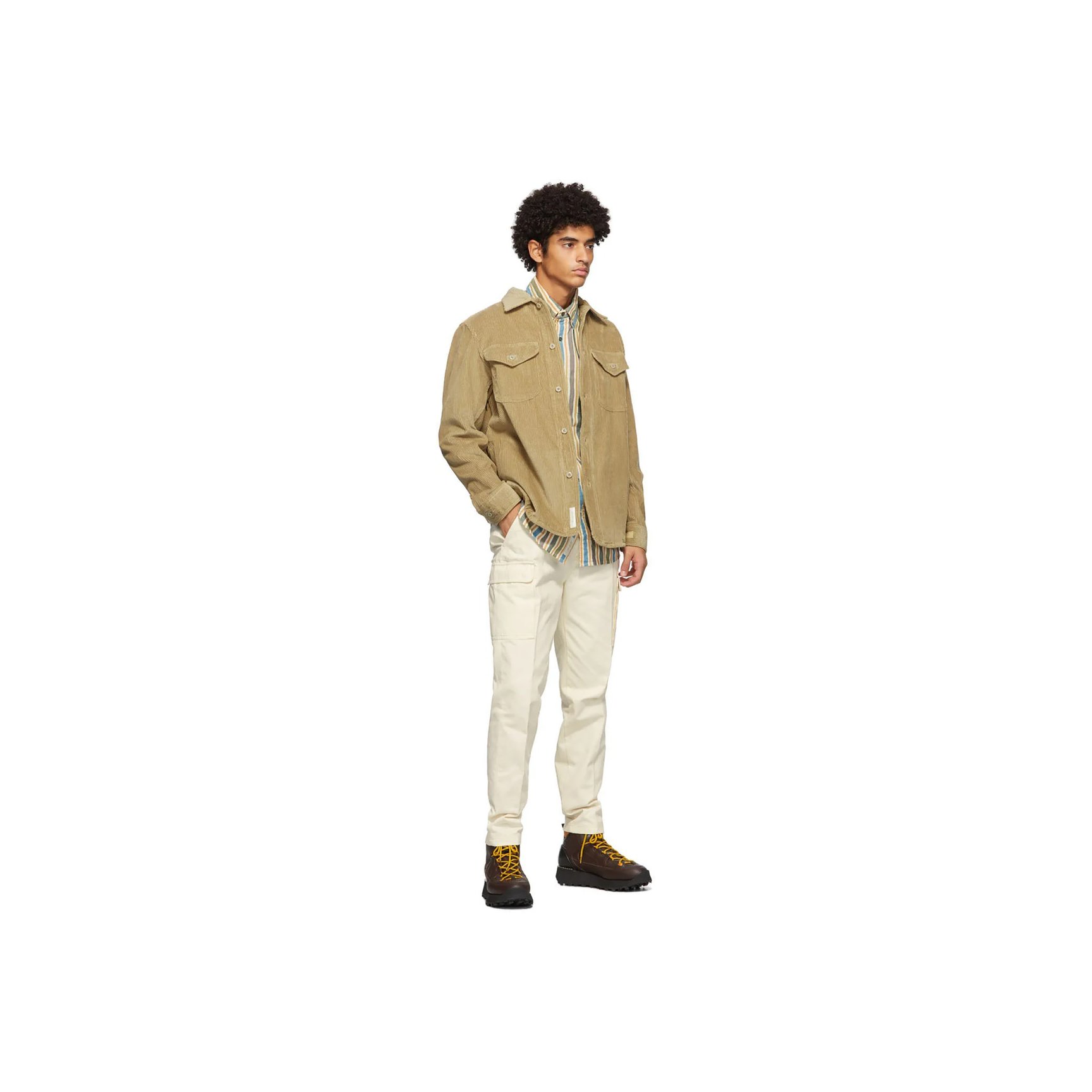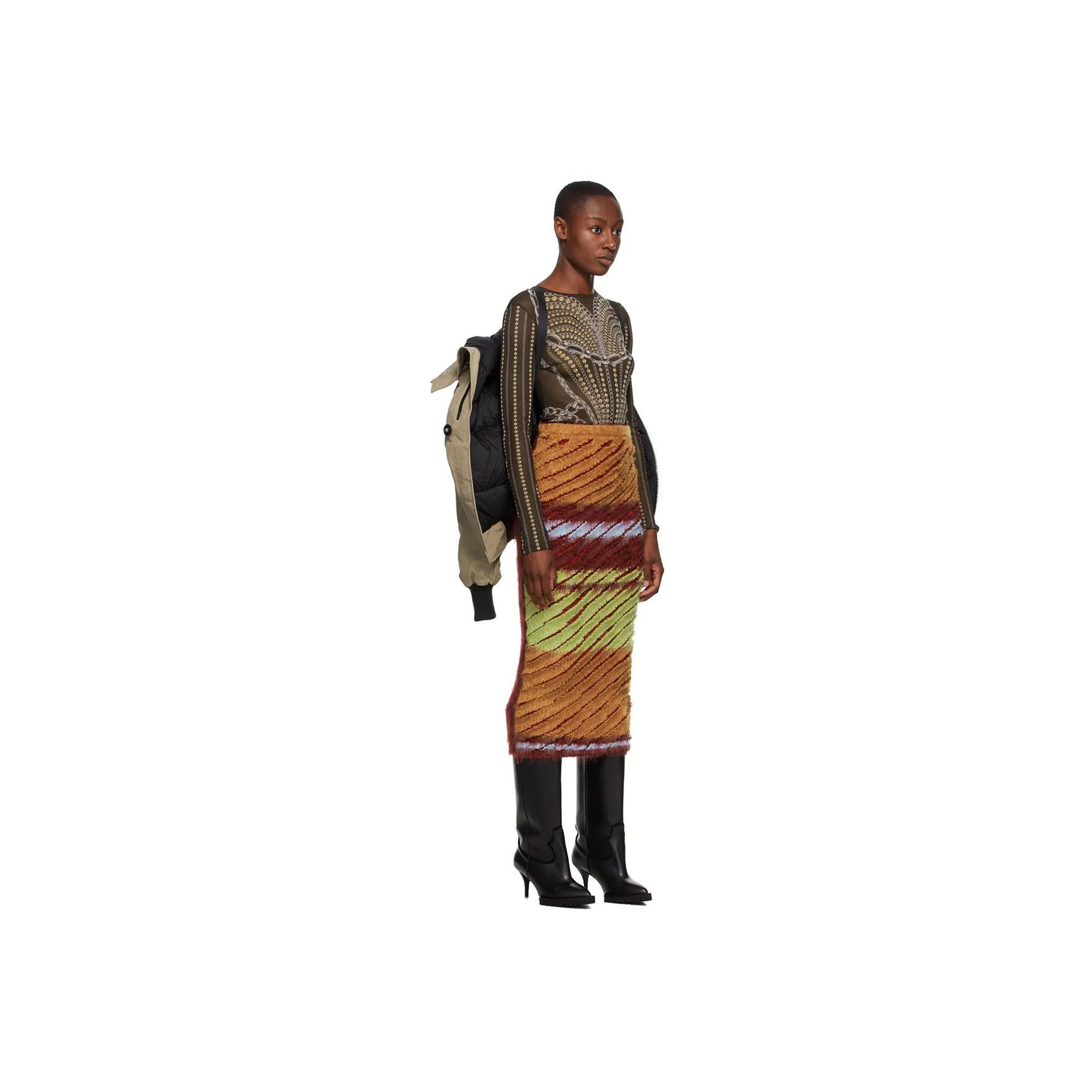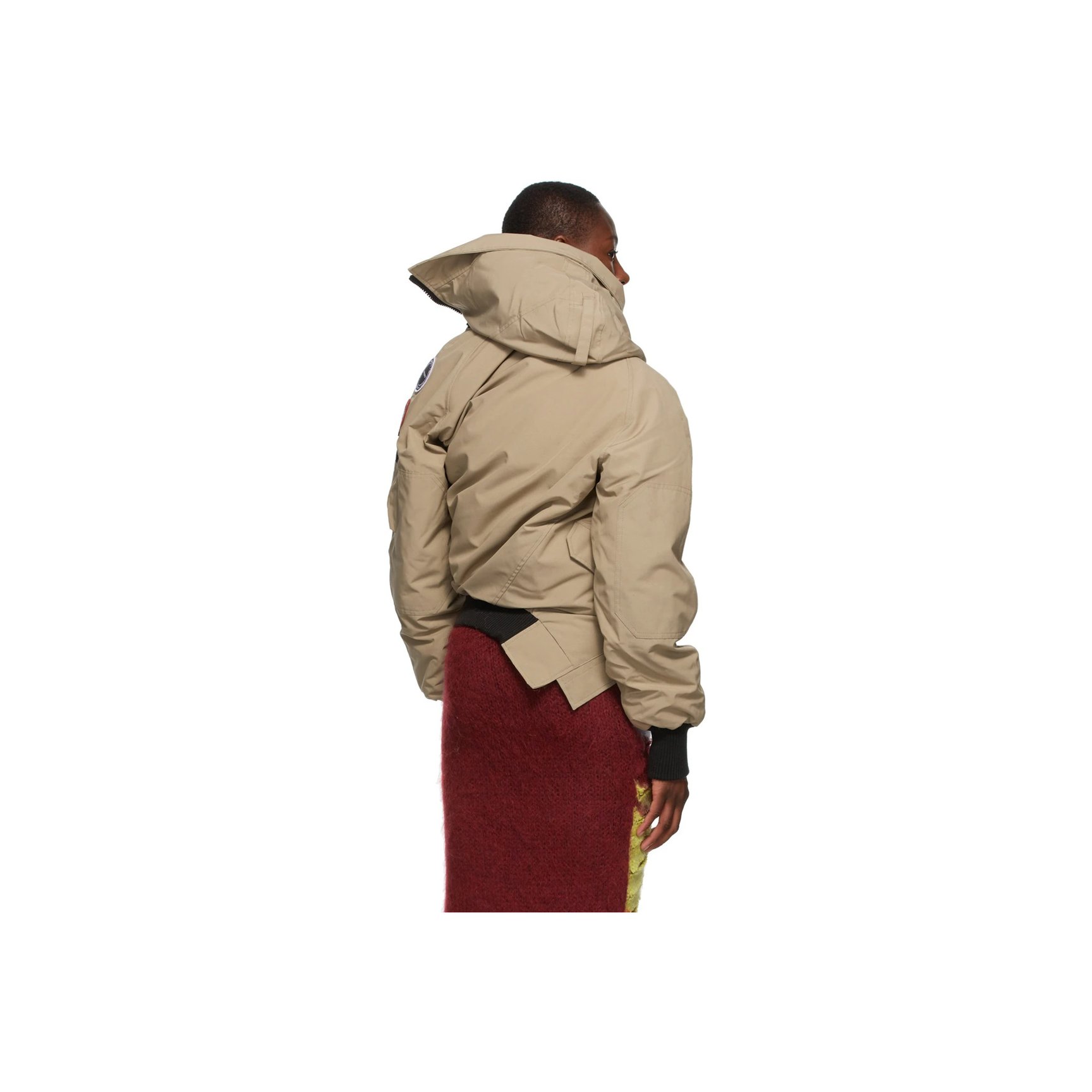 こちらも同じくワイ?プロジェクト×カナダグースのベージュダウンジャケットです。フロント部分をはじめ、全体的にねじれたようなディテールが目を引きます。アーシーなカラーを活かして、トライバル風の柄プリントアイテムを合わせた着こなしもおすすめ。