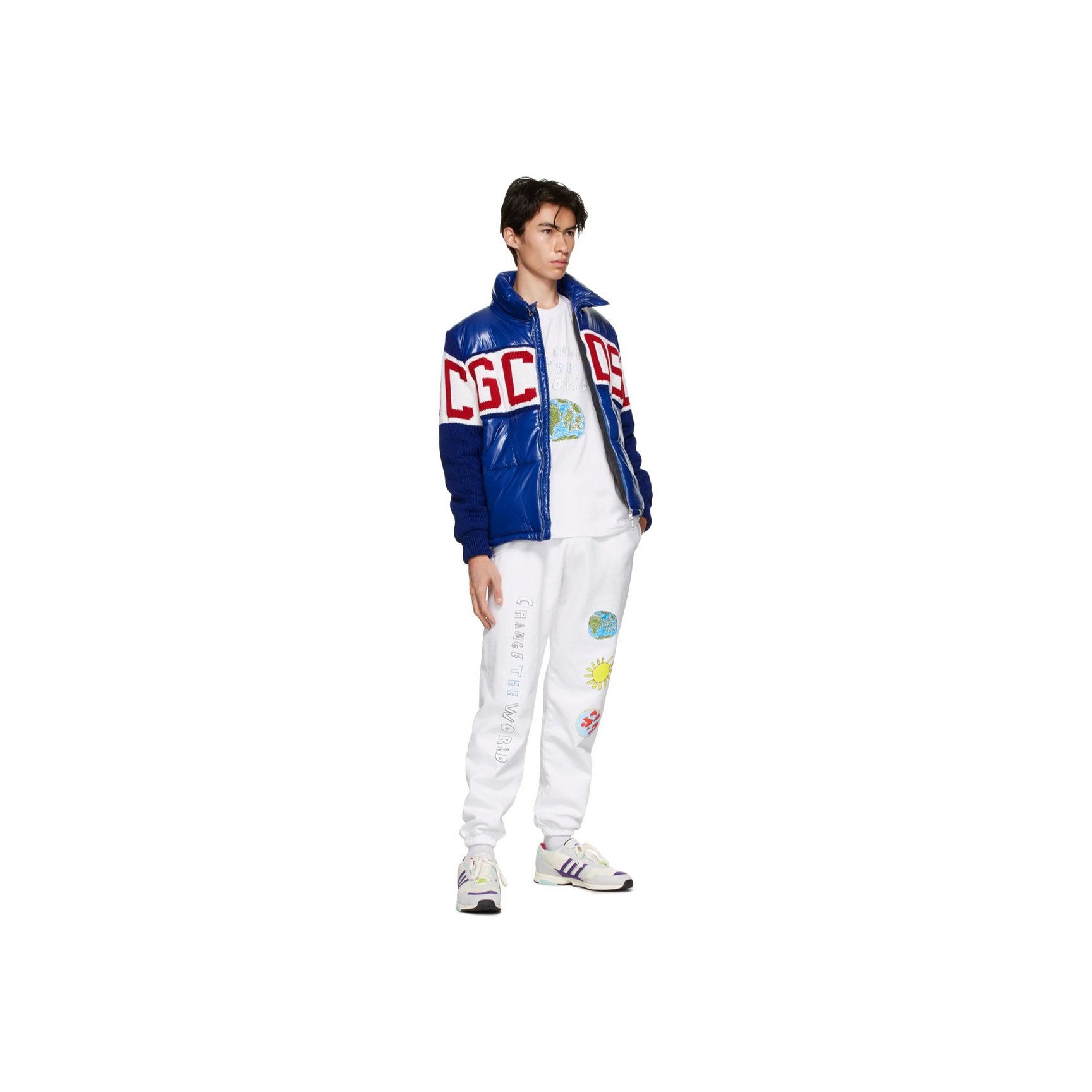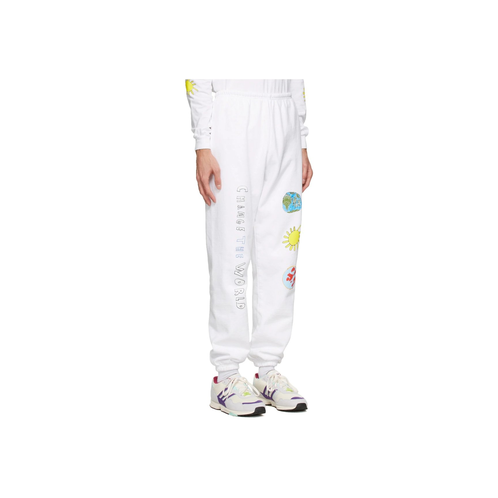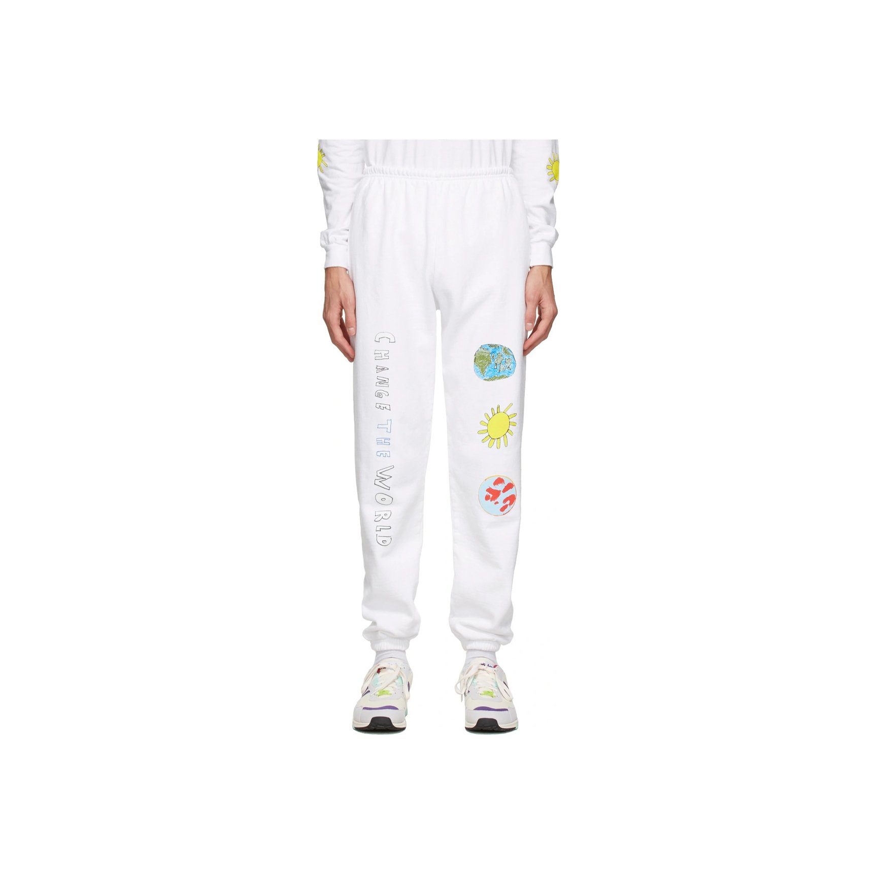 こちらもキッズ ワールドワイドのホワイトスウェットパンツです。地球のイラストと「CHANGE THE WORLD」のメッセージが環境問題を訴えかけてきます。ファッションを購入するという、身近な一歩から社会問題を考えてみてはいかがでしょう。