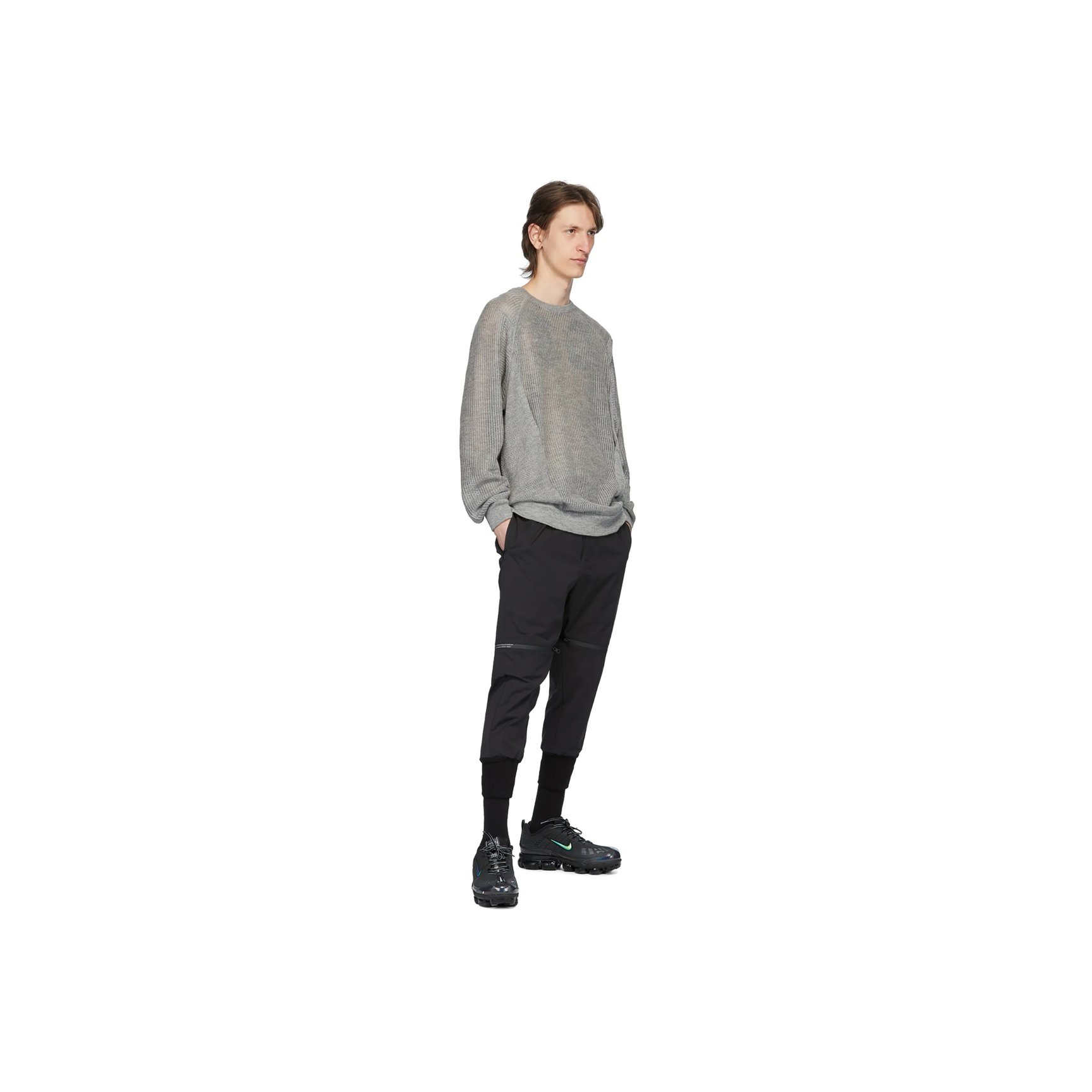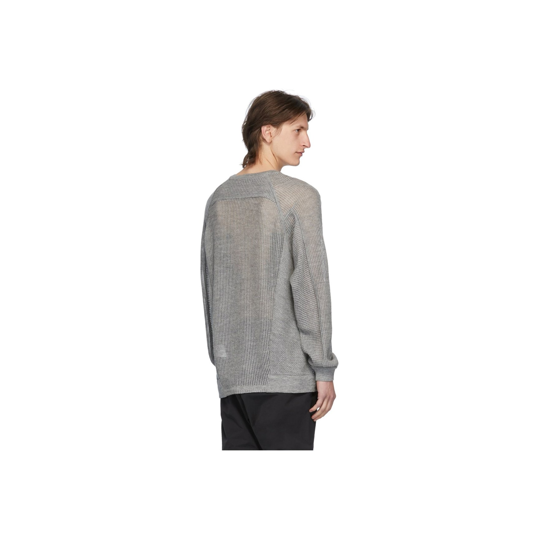 「ナイキ(NIKE)」のACGラインのデザイナーも手掛けたエロルソン?ヒュー(Errolson Hugh)の「アクロニウム(ACRONYM?)」のグレーのニットです。パネル仕立てとシアーな透け感が特徴。ラマウール70%、シルク30%と上質な素材を使用しています。