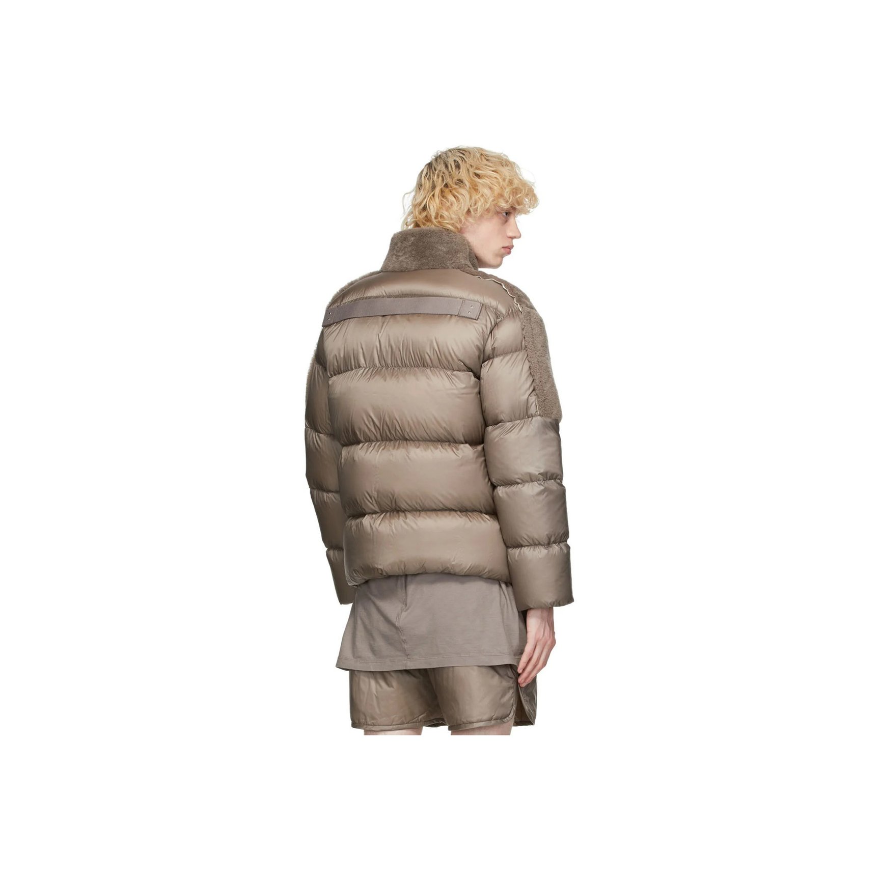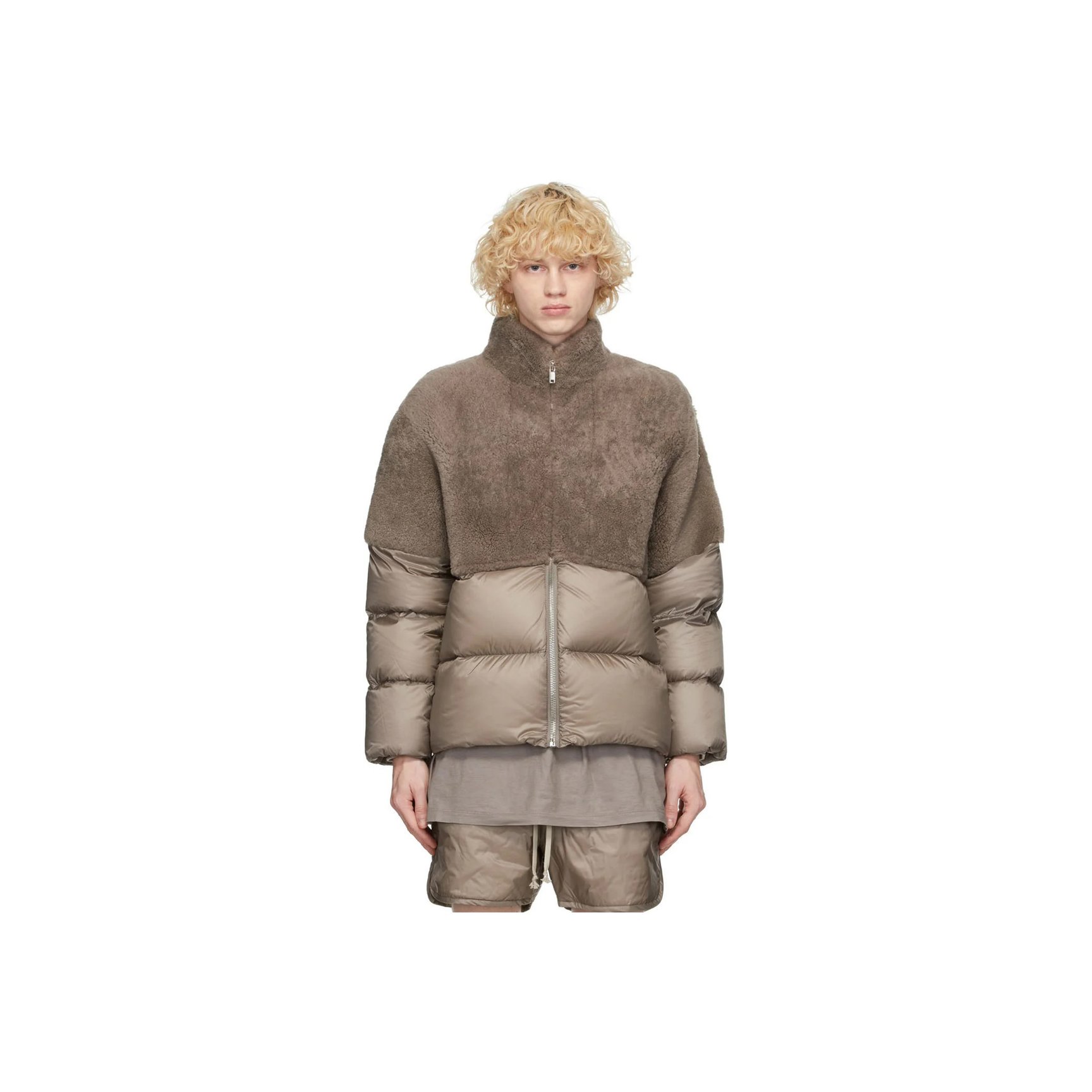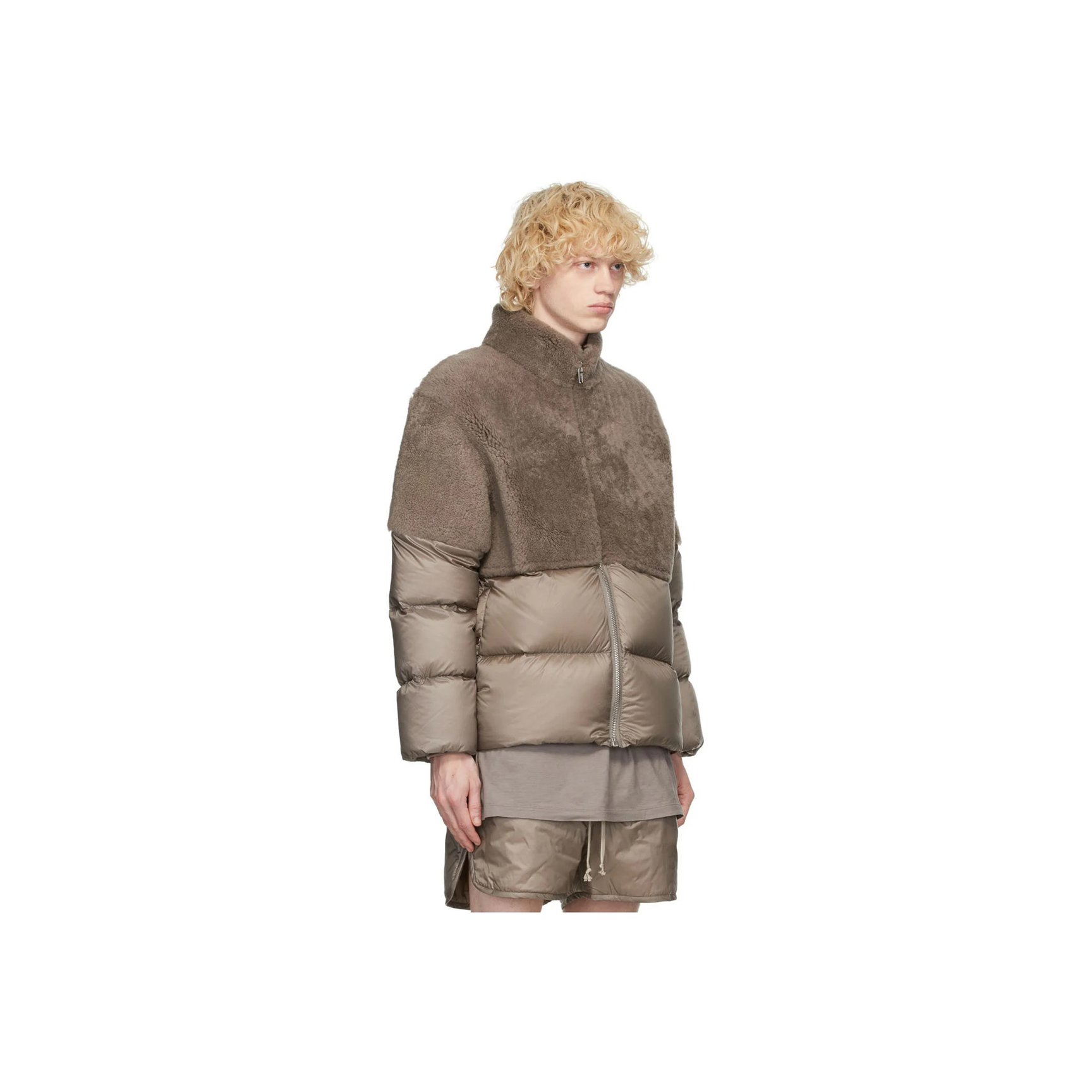 こちらはブラウングレーの色合いがシックなダウンジャケットです。首元から二の腕までのフロント部分は、ラムウールフリースのパネル仕様。ほっこりとした素材感との組み合わせが斬新な一着。