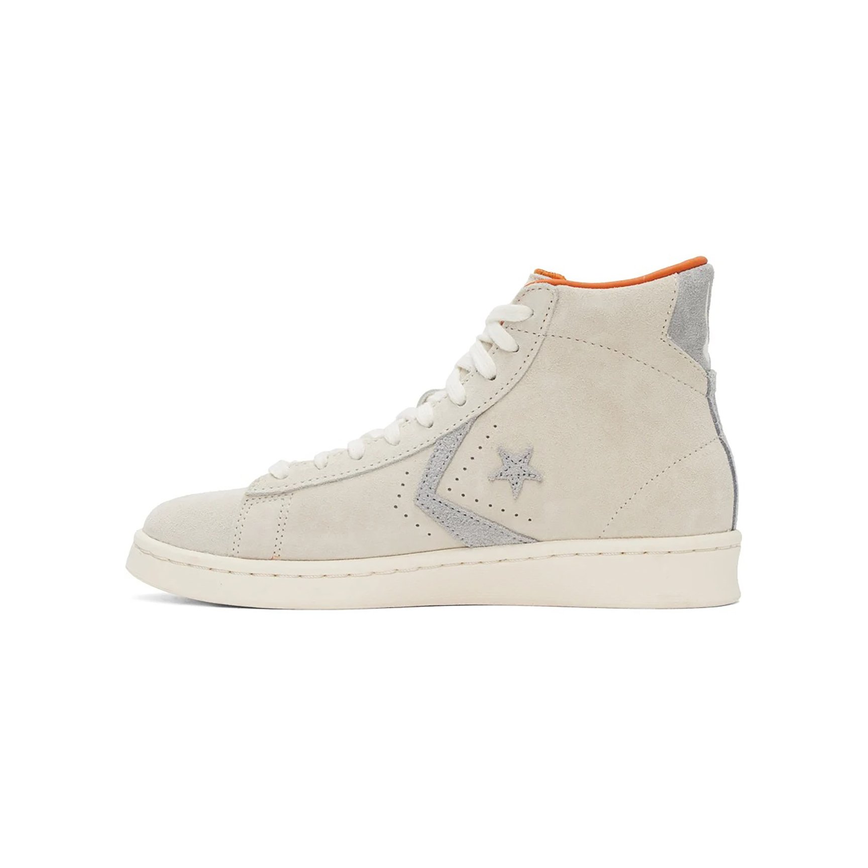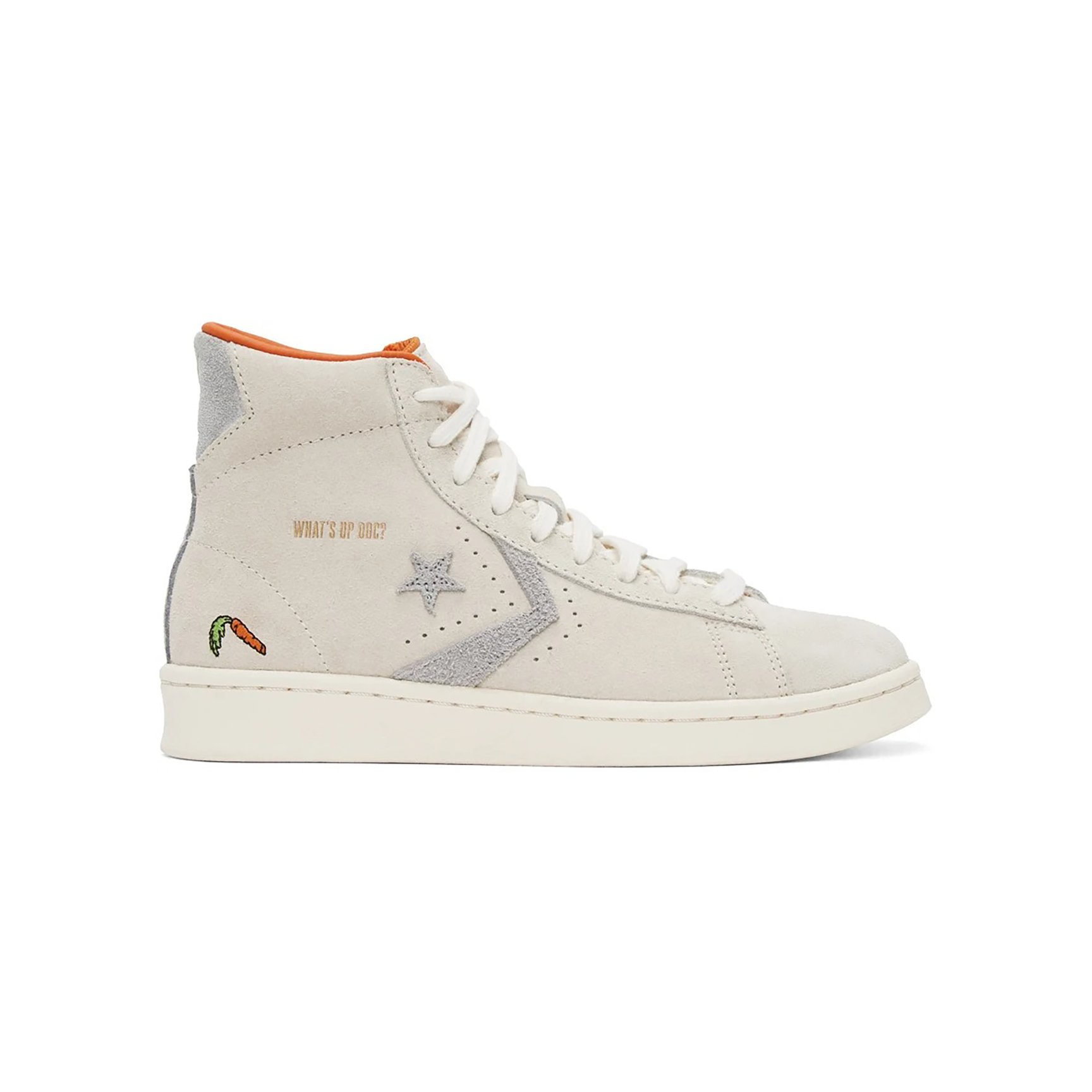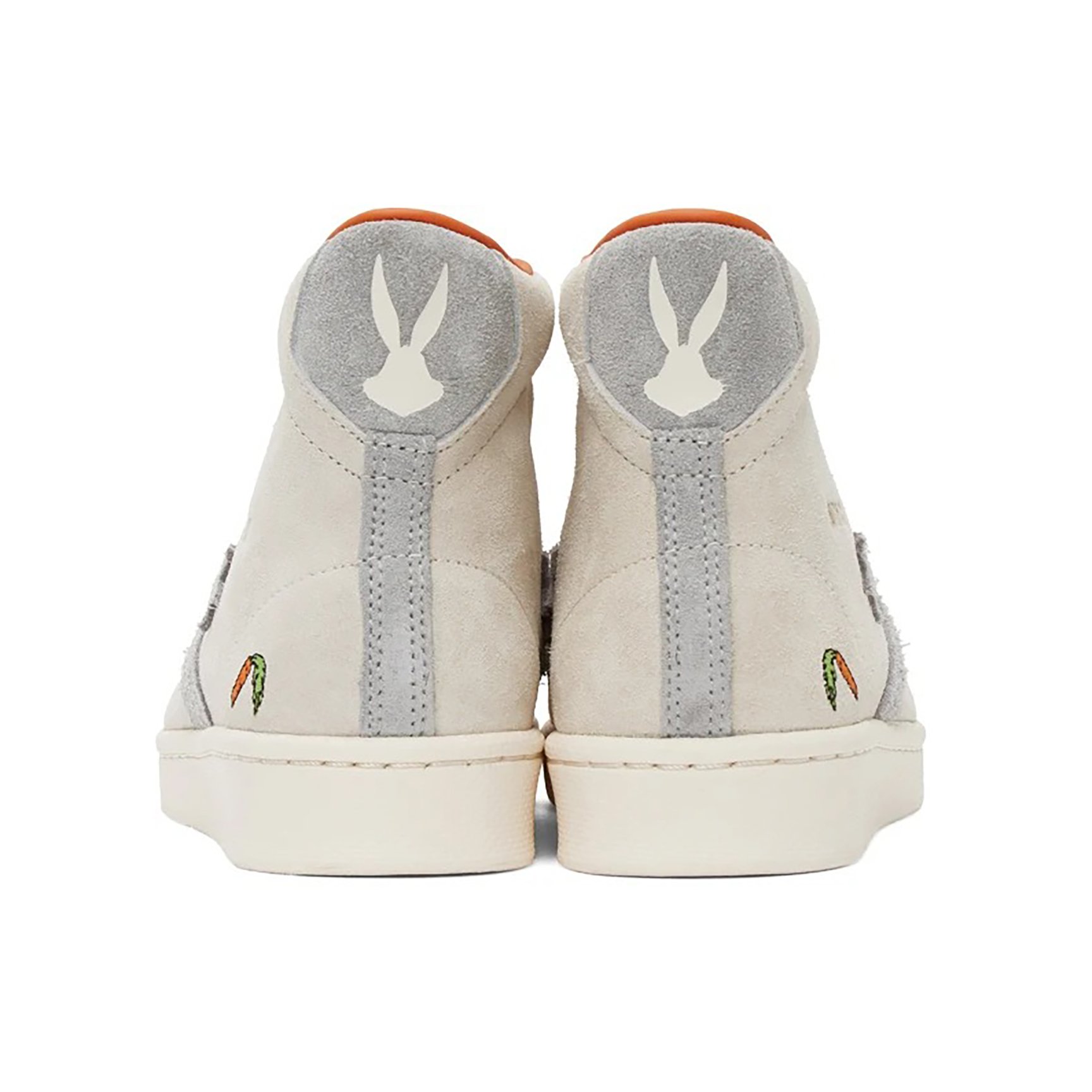 こちらもハイカットのシルエット。オフホワイトとグレーのバイカラーのスエード素材です。バックステイにはバッグス?バニーのシルエットが。バッグス?バニーの大好物であるニンジンを彷彿とさせる、オレンジの差し色も効いています。名セリフ「What's?Up,?Doc?」の刺しゅうも見逃せない!