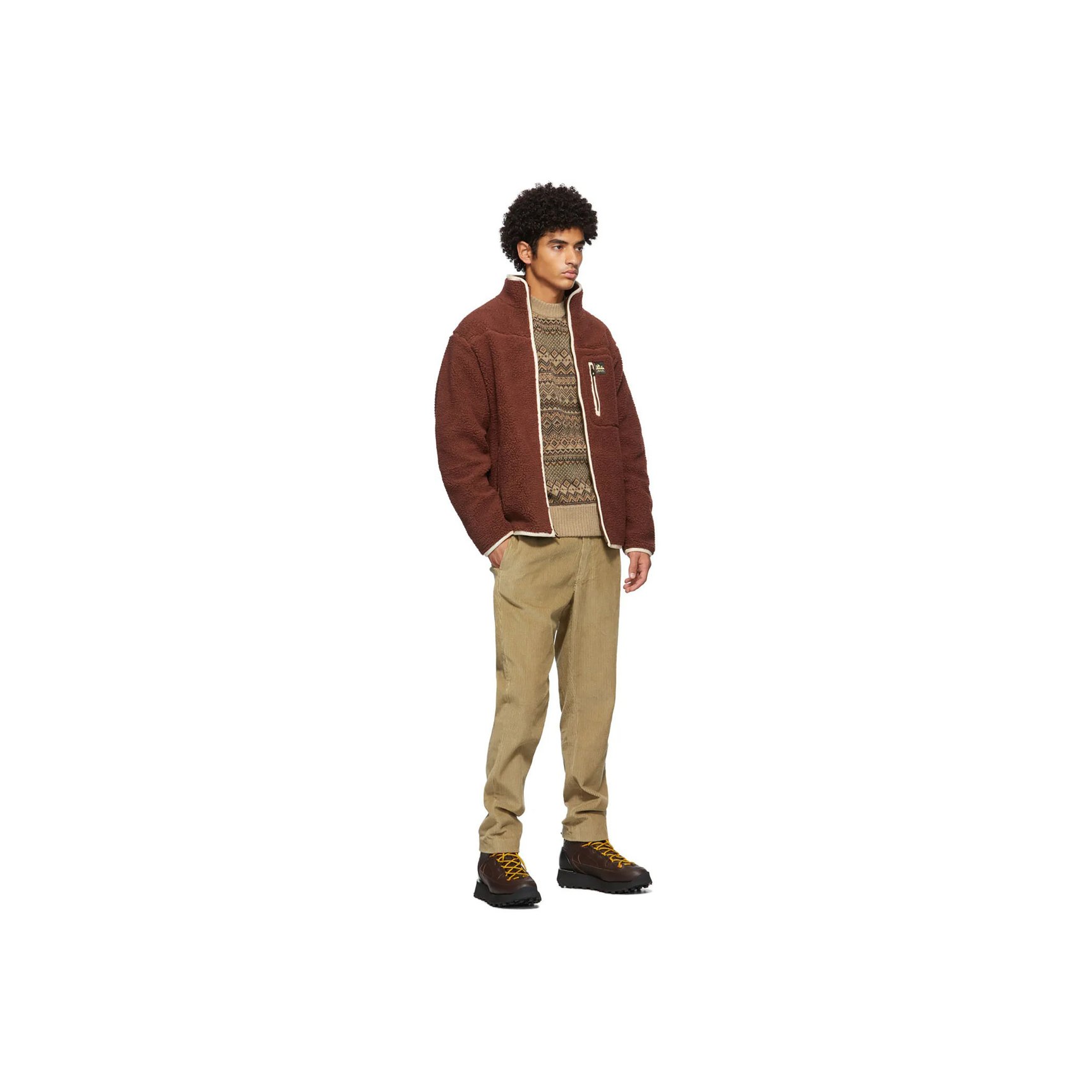 秋らしいブリックレッドの色合いと、ほっこりとしたフリース素材がベストマッチング。オフホワイトのフェイクスエードのパイピングも、適度なコントラストで華を添えています。