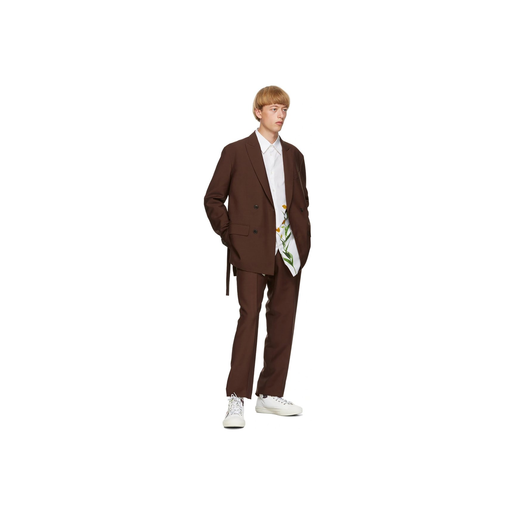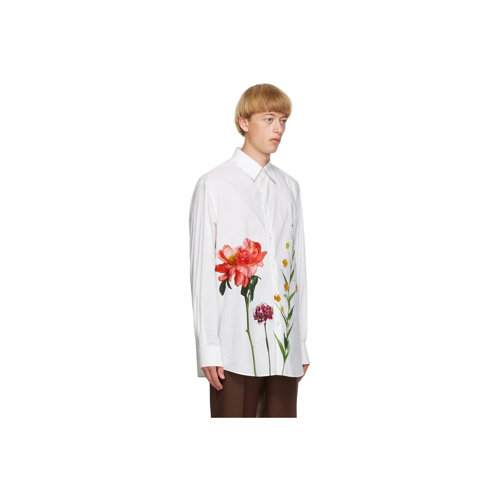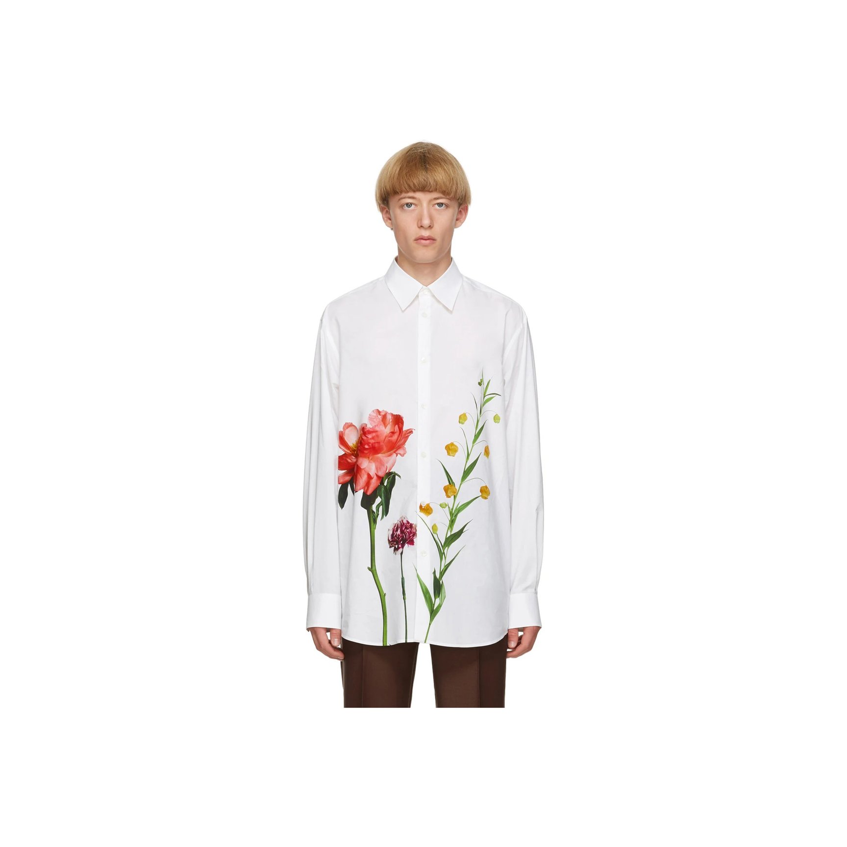 「ヴァレンティノ(VALENTINO)」の白シャツは、人気写真家デュオの「イネス&ヴィノード(Inez?&?Vinoodh)」によるフラワーフォトプリントがロマンチック。