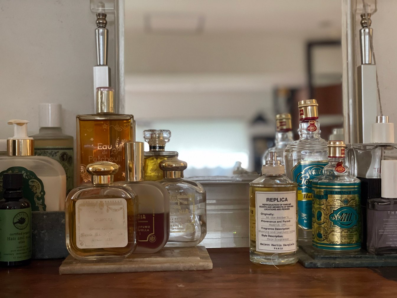 内田さんの自宅のドレッサーには、たくさんの美しい香水が。サンタ?マリア?ノヴェッラ「パチューリ」のボトルは、使い終わった空き瓶含めて3本並んでいる