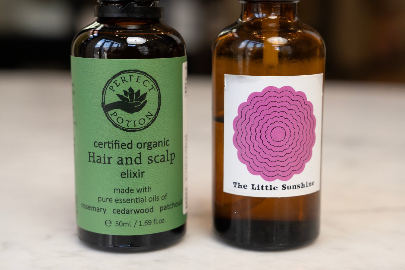(左から)パーフェクトポーション「ヘアー&スカルプ エリクサー」(50ml 同4180円)、ザ?リトル?サンシャイン「Cosmic Oil」(50ml 同3850円)