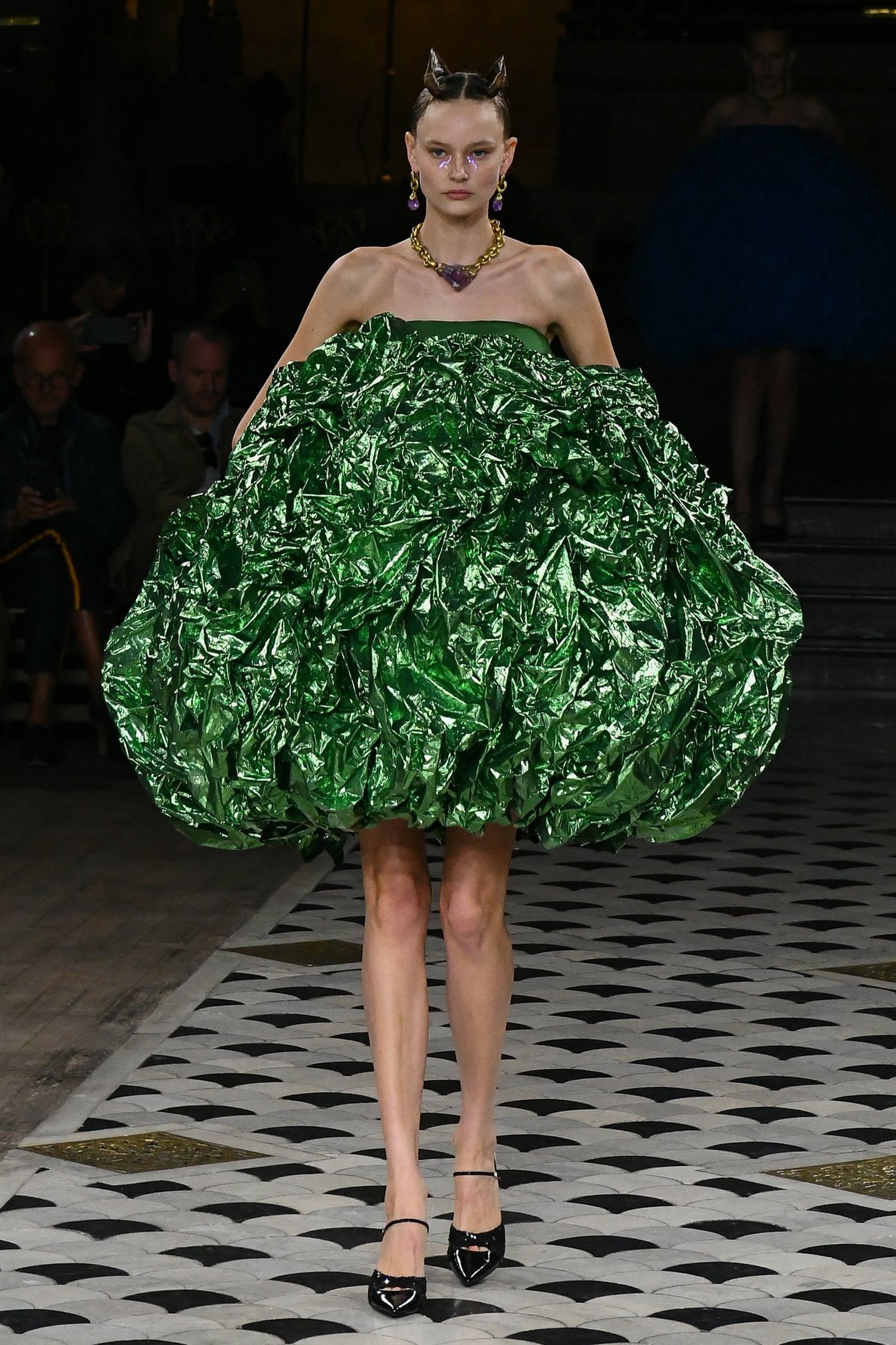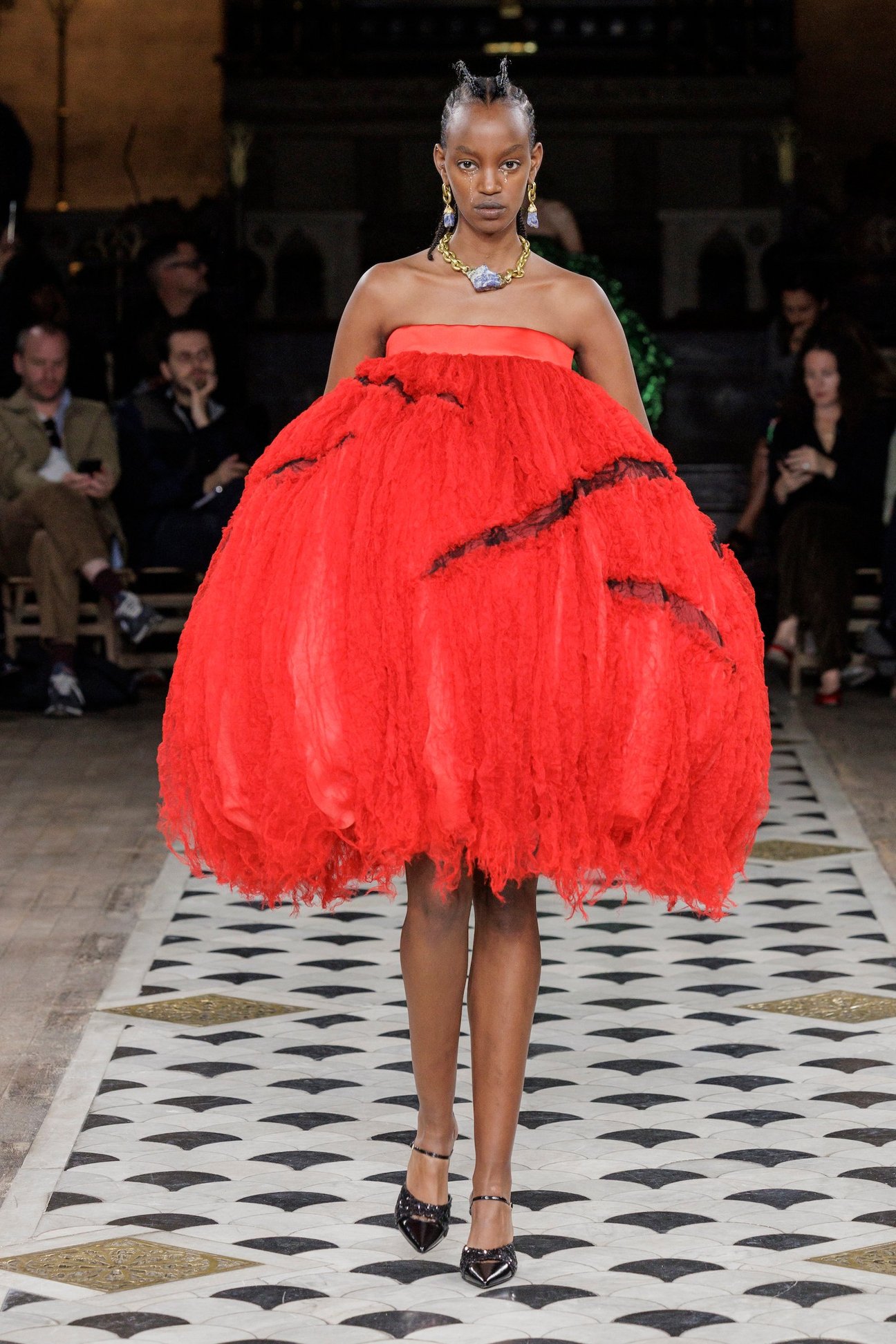 パリコレにもガチ石の影!「アンダーカバー(UNDERCOVER)」がパリファッションウィークで発表した2023年春夏ウィメンズコレクションには大ぶりな天然石を使ったゴールドピアスやネックレスが登場。「ノグチ(noguchi)」との協業で生まれたジュエリーの中でも、一際目を引いたのは特大石を使用したネックレス。中でもサファイアのブルーと石らしい無骨なグレーがミックスされたネックレスが、イットアイテムです。