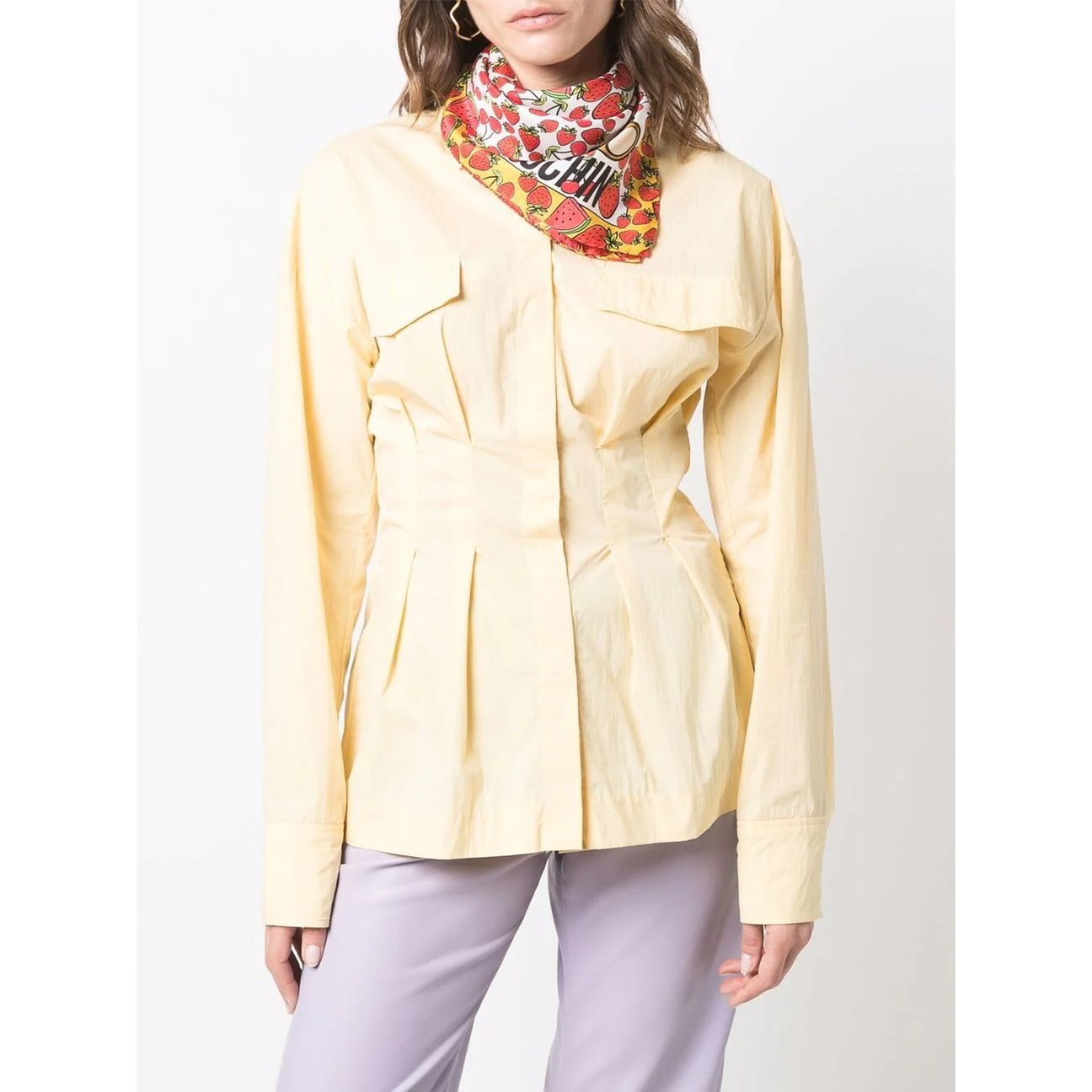 「モスキーノ(MOSCHINO)」のアイコン テディベアと、たっぷりのフルーツがプリントされたスカーフ。コーディネートのアクセントになるポップなイラストが愛らしいデザインです。大判サイズなので、首元はもちろん、ヘアアクセやバッグに付けたりと多彩なアレンジが楽しめます。