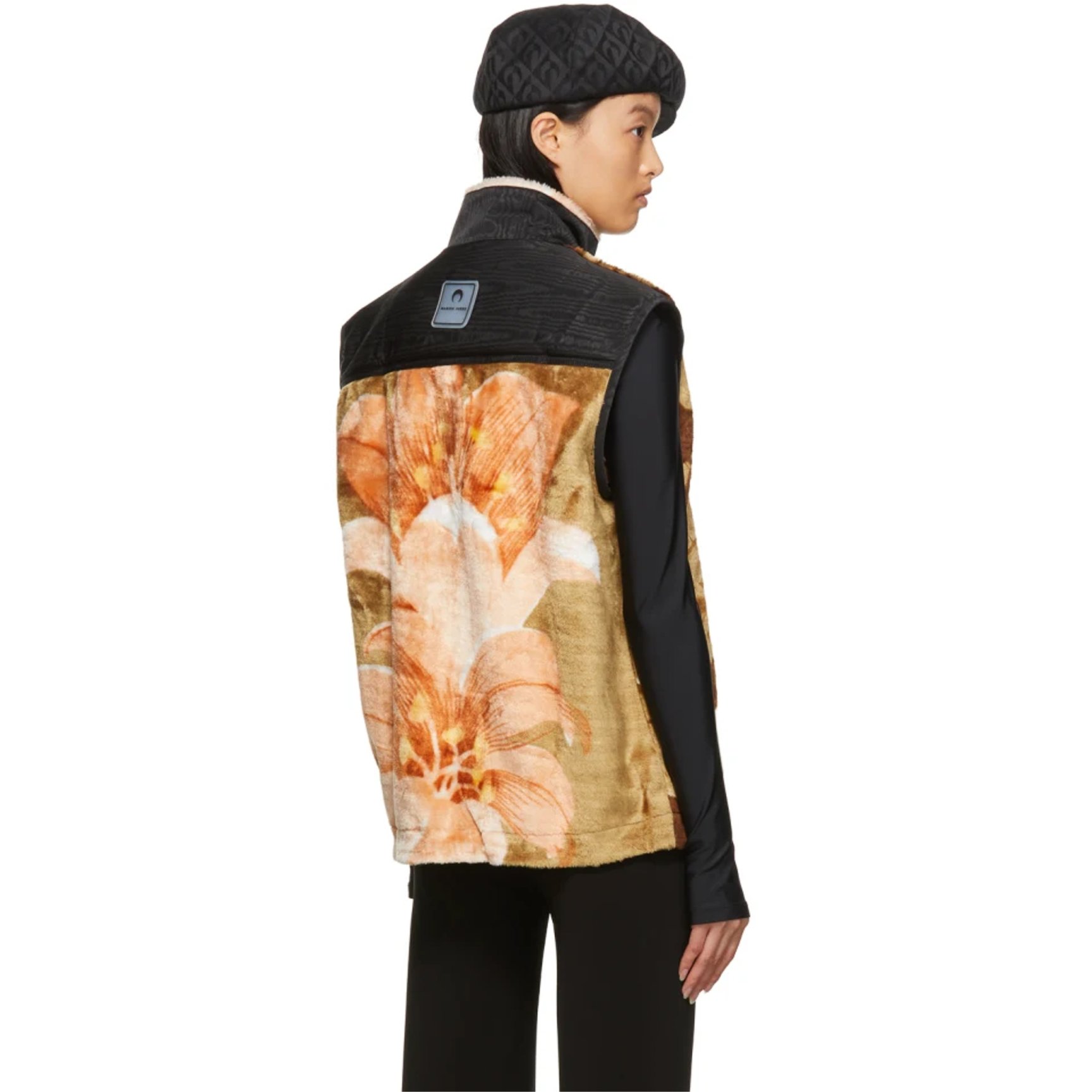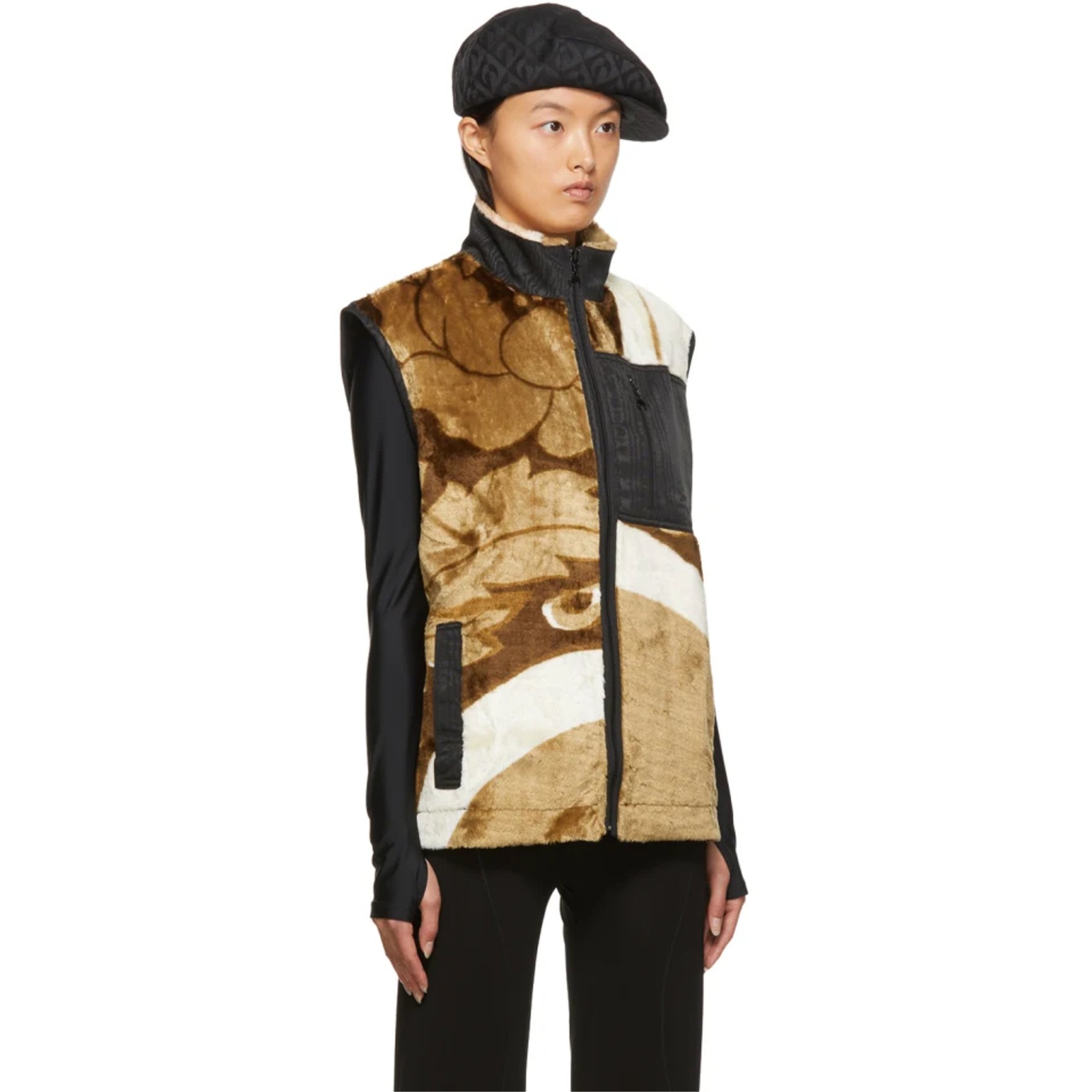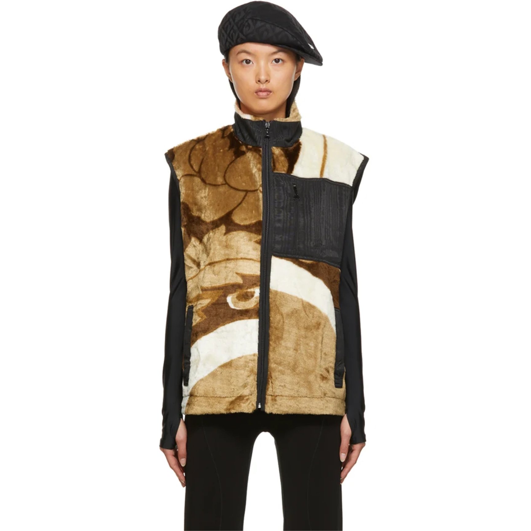 アップサイクルされた生地やデッドストック生地などを使った、エシカルなコレクションの中から、フリースシーツを採用したベストモデルをピックアップ。ブラウンを基調とした懐かしさを感じる模様のフリース素材を、ブラックのパイピングやポケットで引き締めることでモダンなデザインへと昇華。寒さが続く今の時期、着膨れの心配がないベストタイプをコートのインナーに忍ばせて。