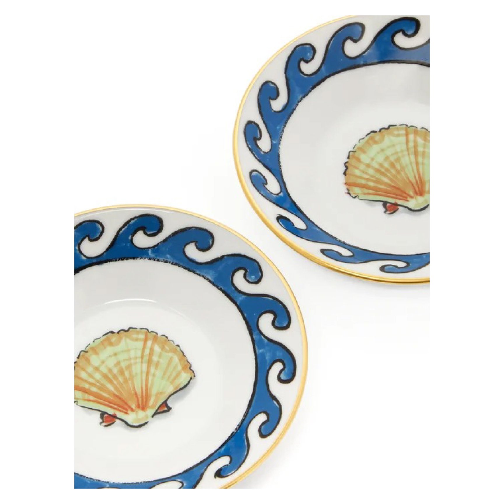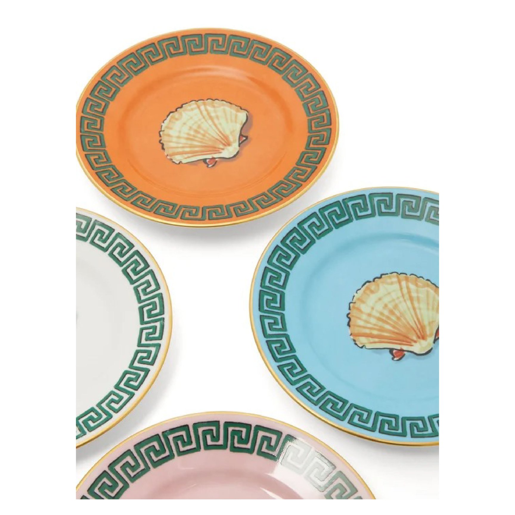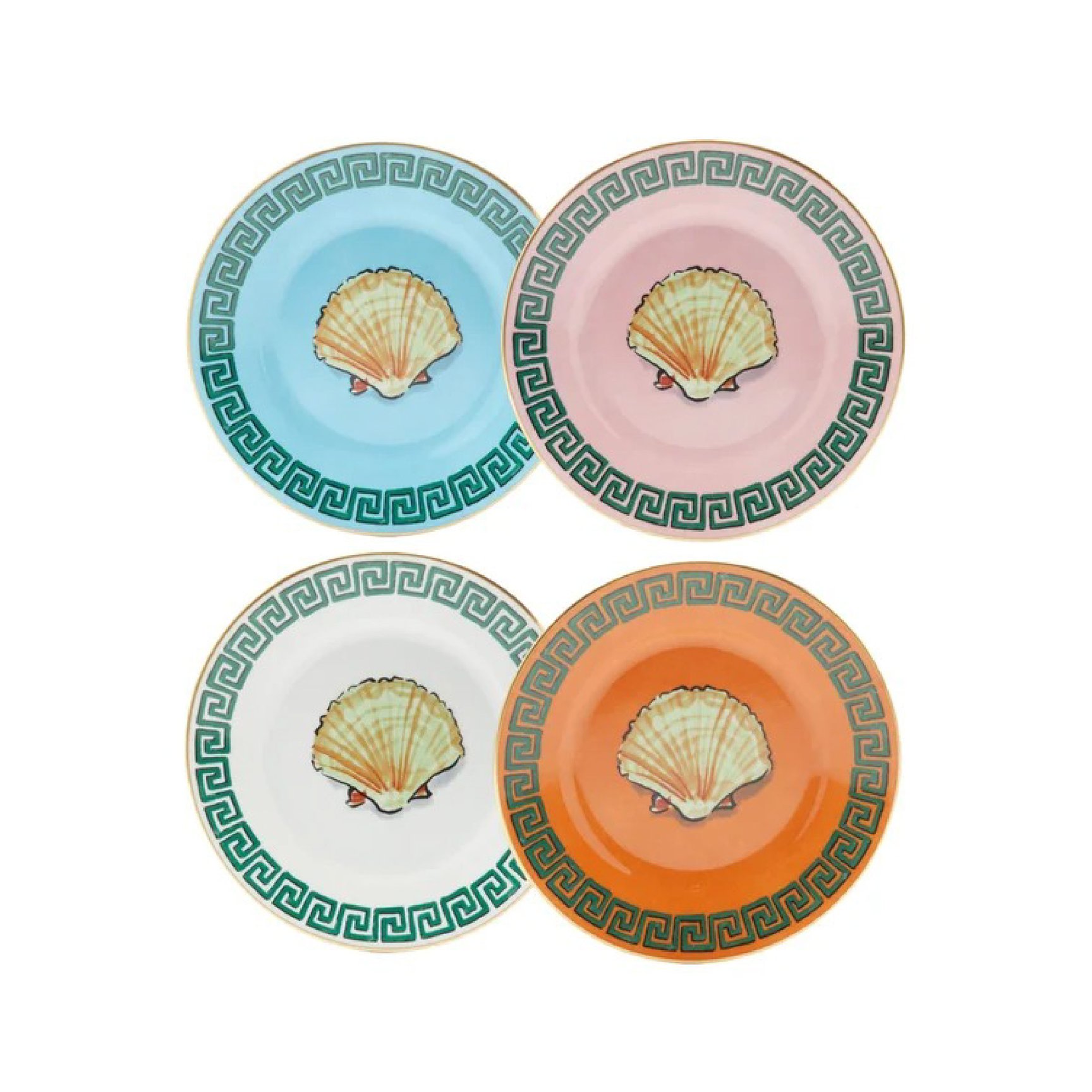 神話時代からインスピレーションを得て生まれたサイドプレートは、オレンジ、ピンク、ブルー、ホワイトの4カラーセット。地中海を彷彿とさせるシェルとグリークモチーフのデザインが差し込まれまます。