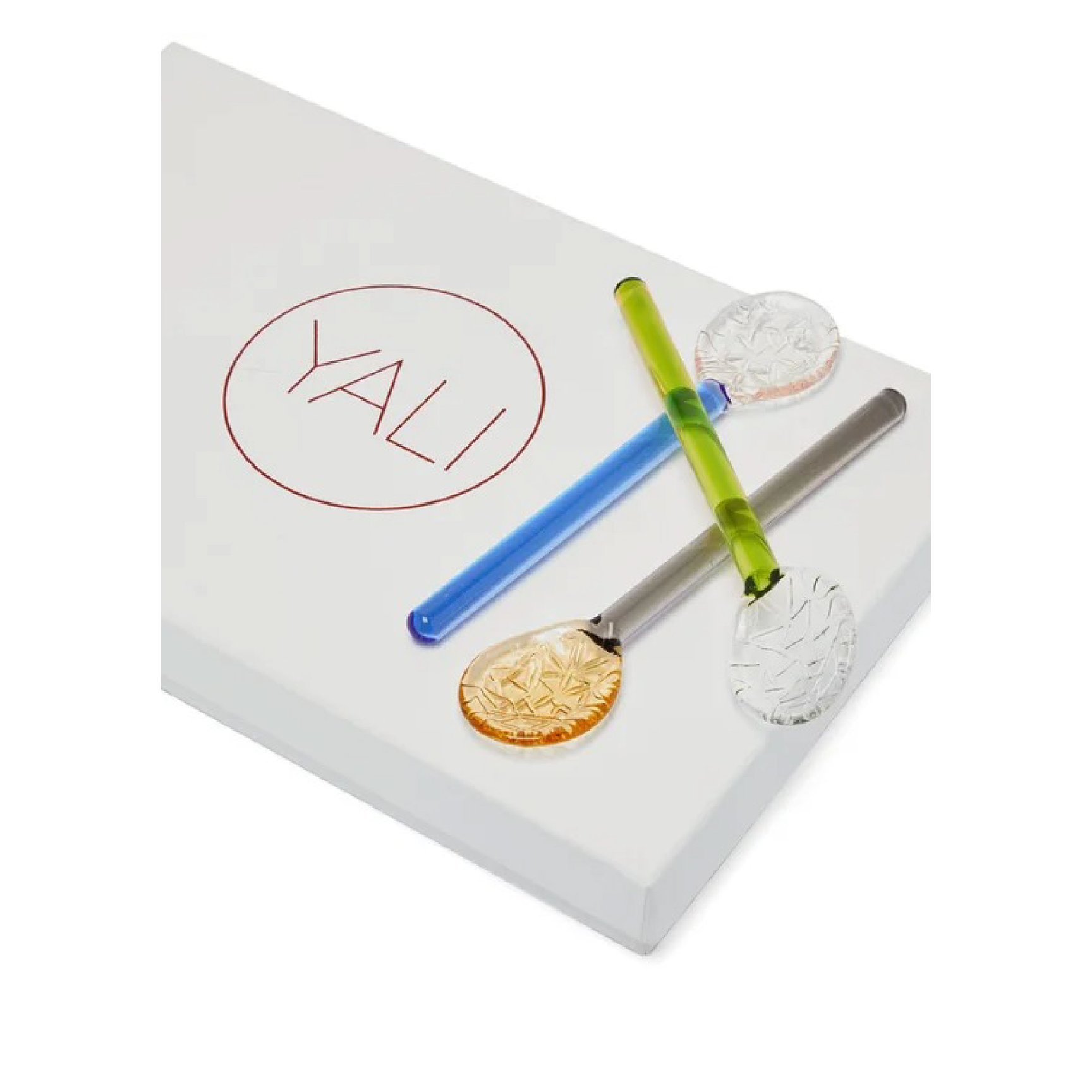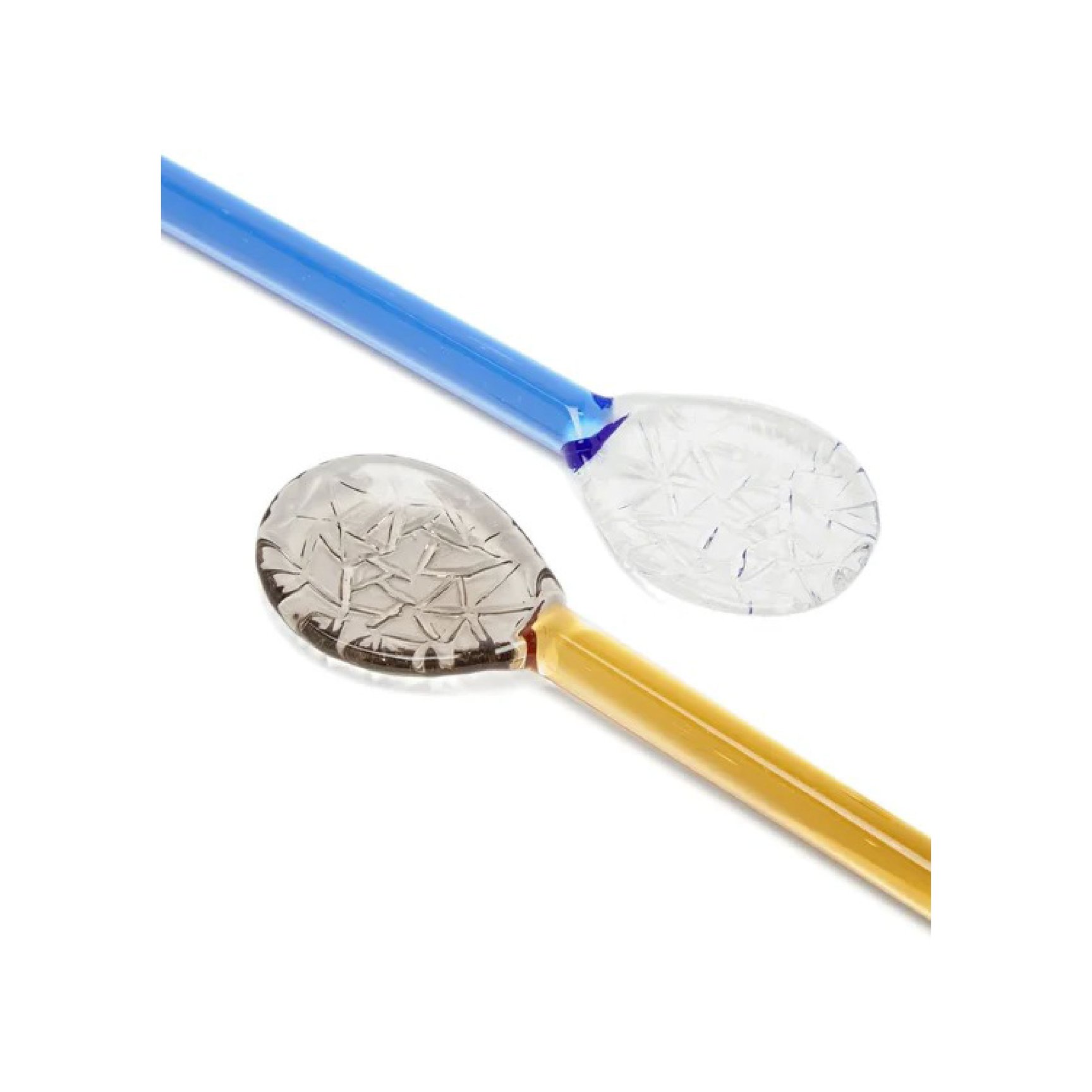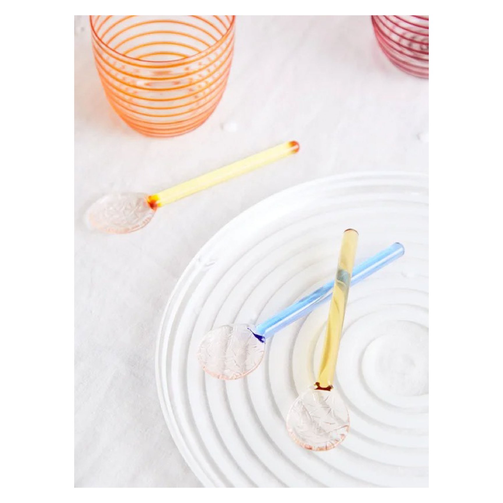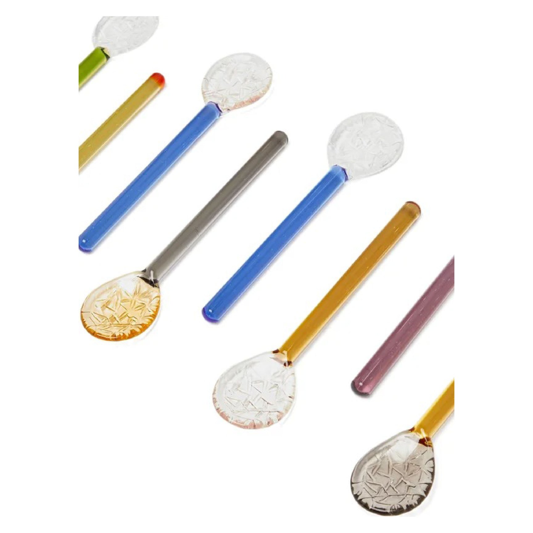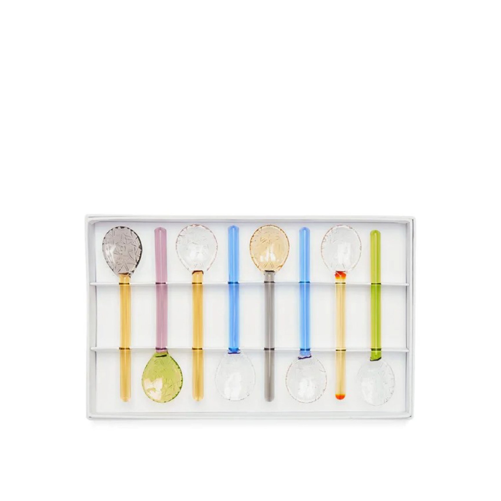 お皿やグラスだけでなくスプーンにも涼やかさを。イタリア発ブランドならではのジェラート用に設計された光に透けるガラスのスプーン。マルチカラーの8本セット。