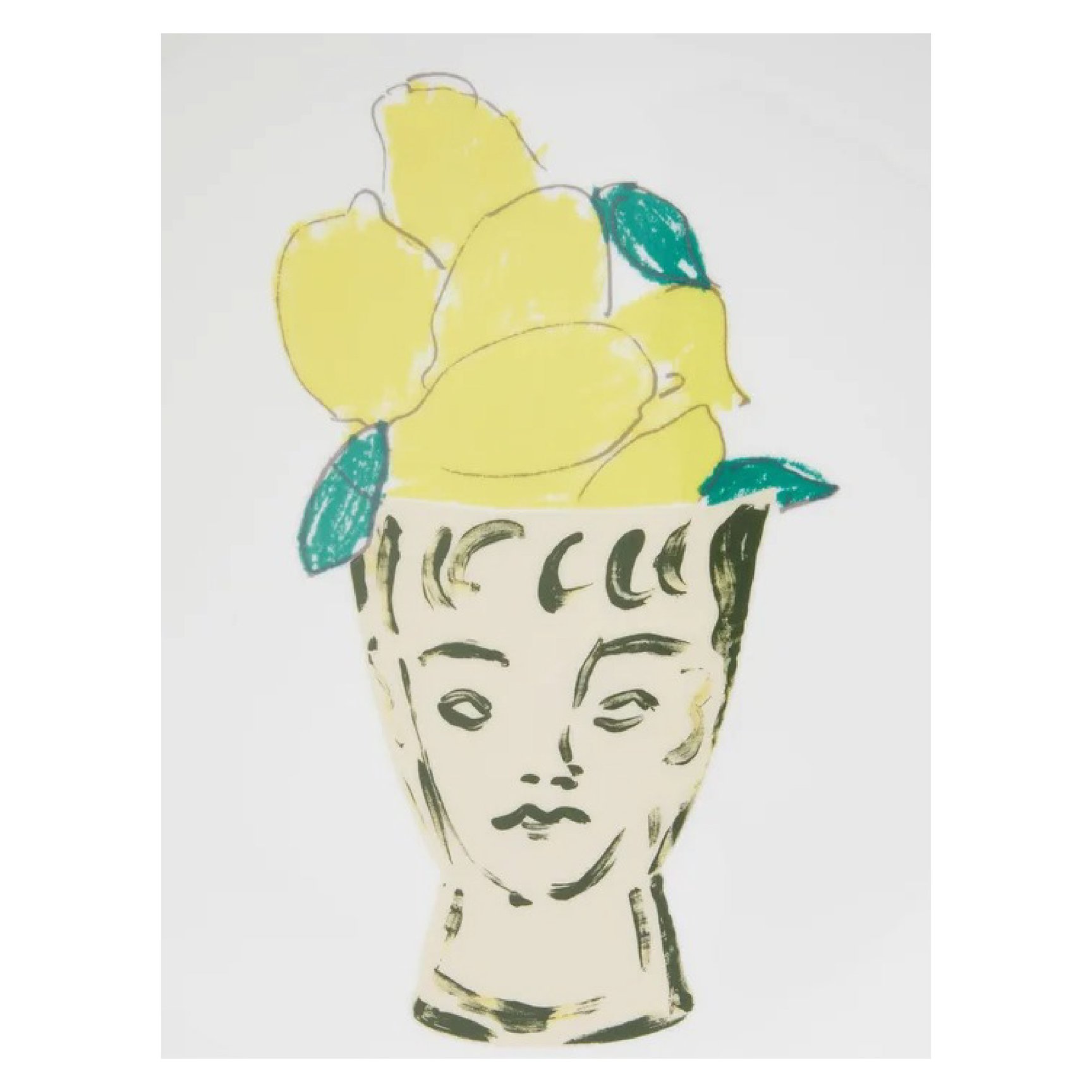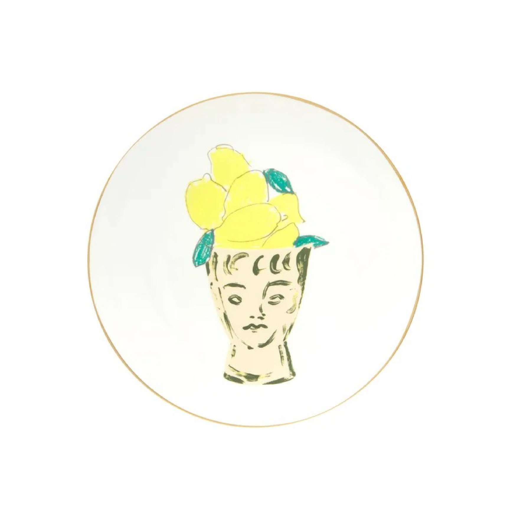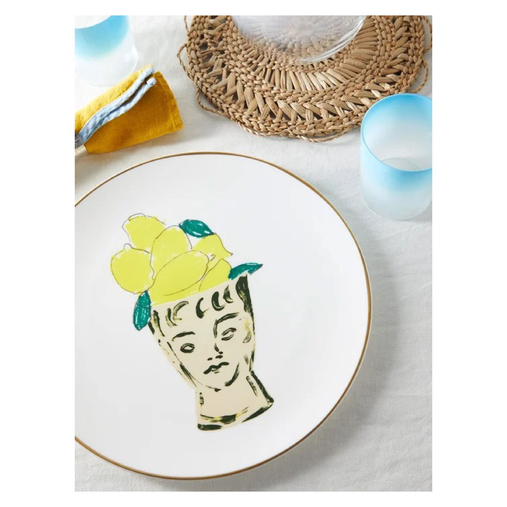 デザイナーのシグネチャーモチーフの1つである“抽象的な女性の顔とレモンの花瓶”が描かれたどこまでもエレガントなチャージャープレート。