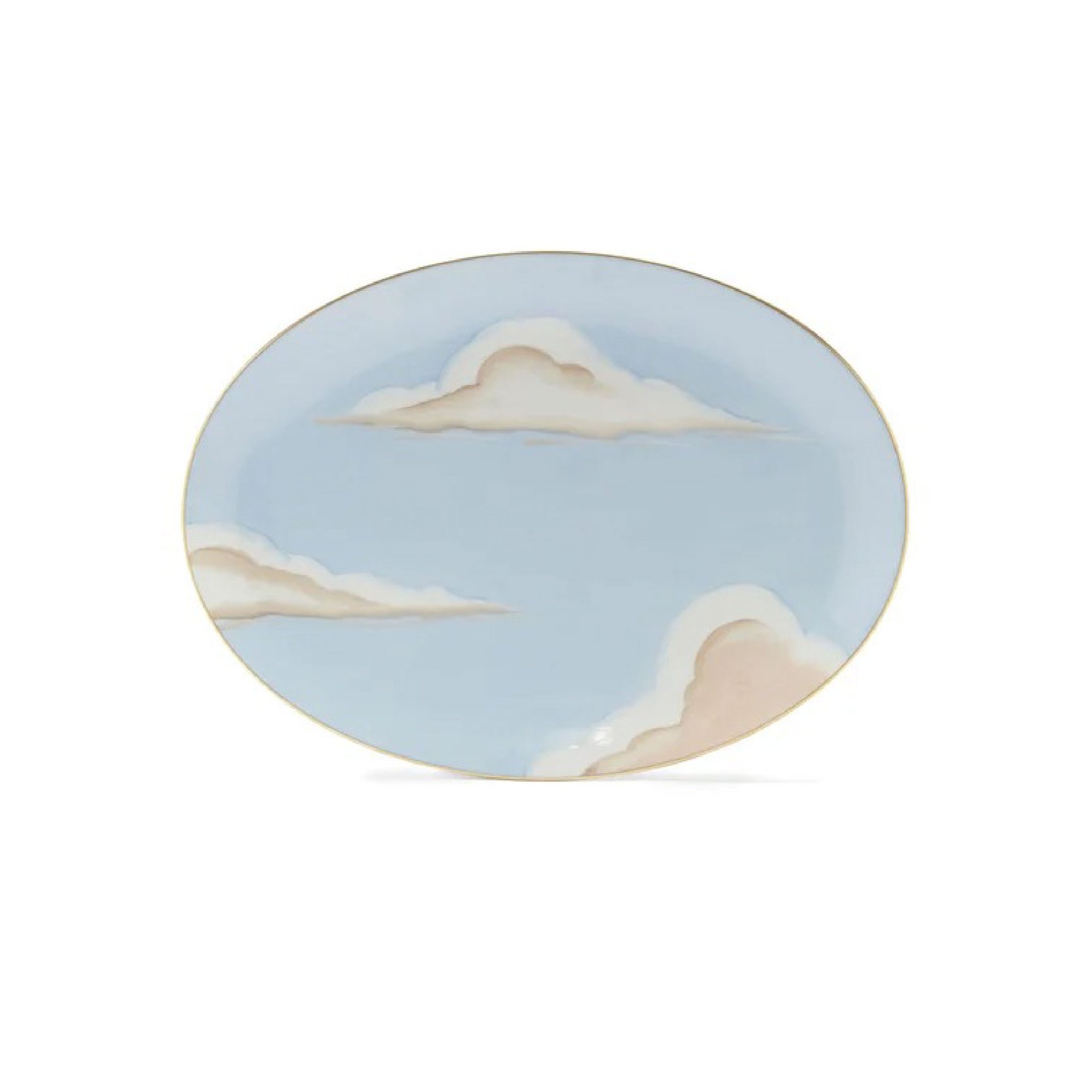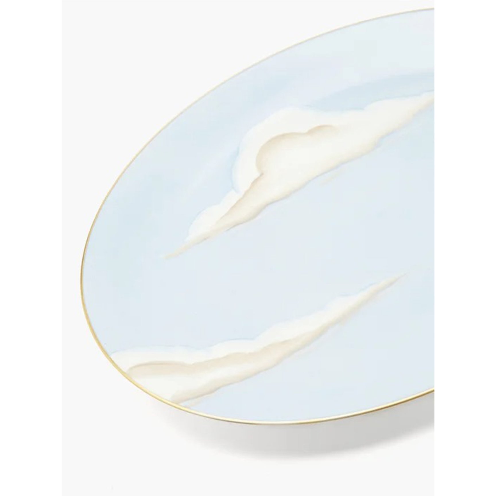 淡いブルーの空と、そこに浮かぶ雲のペインティングをゴールドのエッジが囲った美しい一枚。