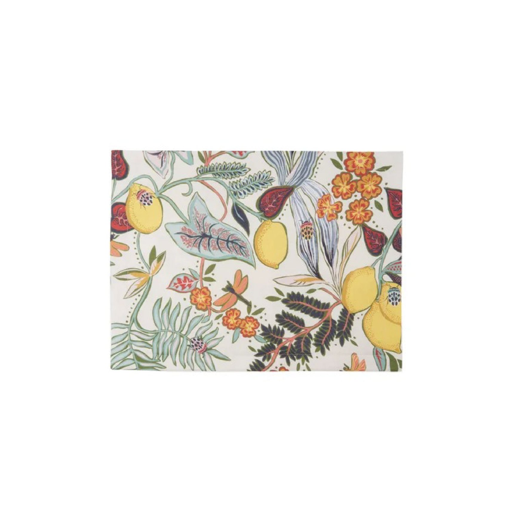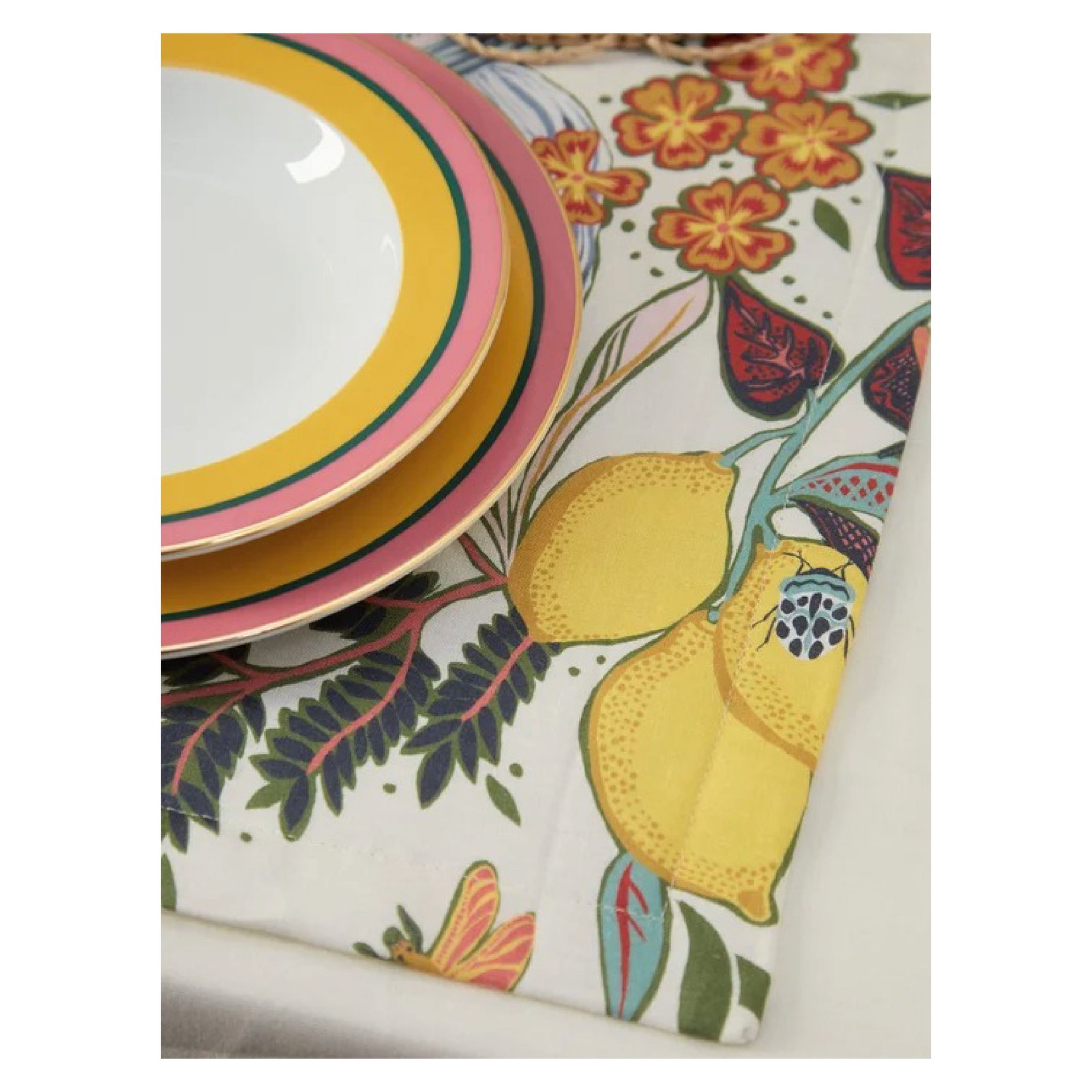 爽やかな色使いで描かれたボタニカル柄のプレースマット。リネンにパッドを施してトップステッチ入りヘムエッジで仕上げた逸品。