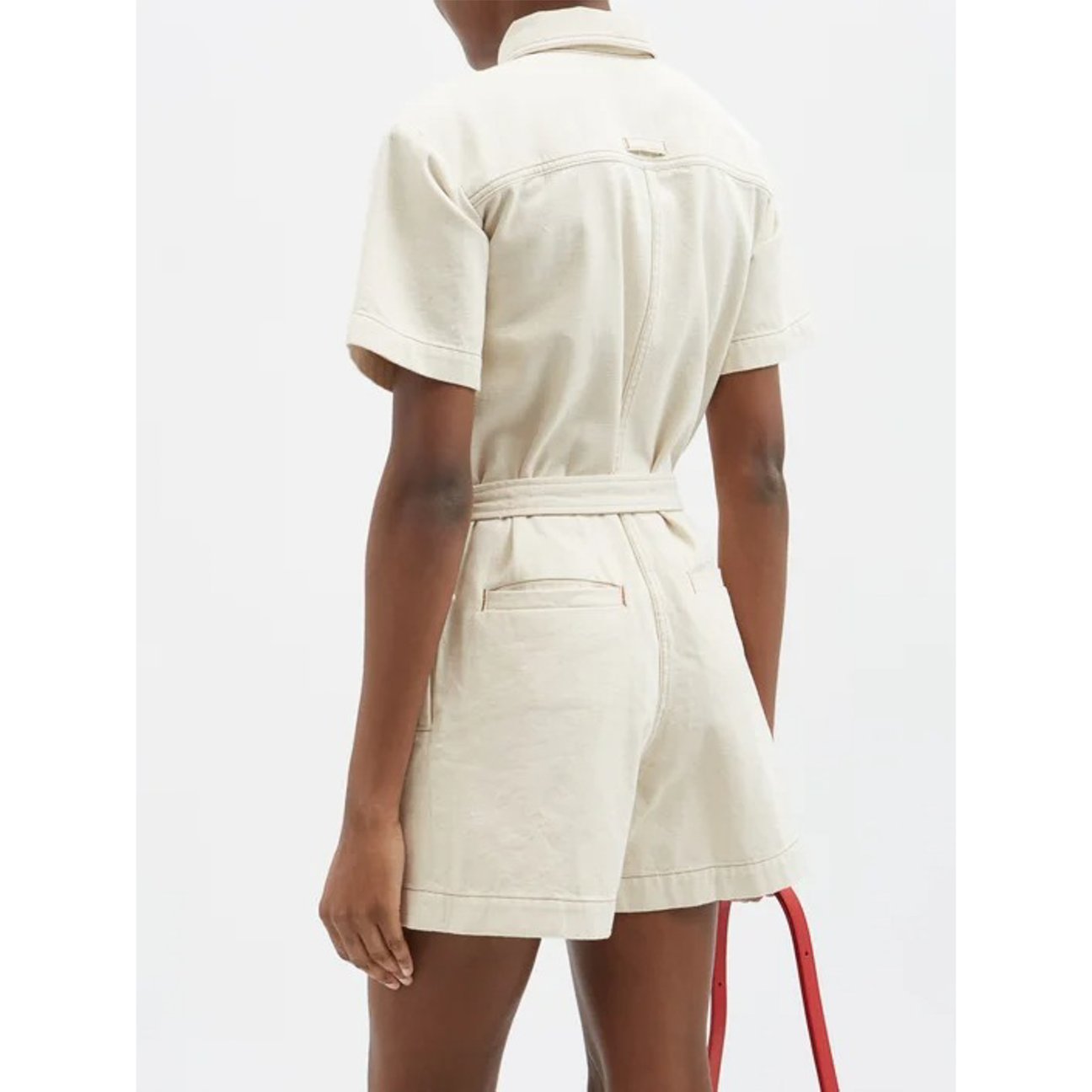 「メイド イン トムボーイ(Made in Tomboy)」からコットンブレンドのジャンプスーツをピックアップ。ボタン付きエポレットやフラップポケットなどサファリシャツのようなシルエット。また、パッド入りショルダーなので腕周りがカバーできるのも嬉しいポイントです。