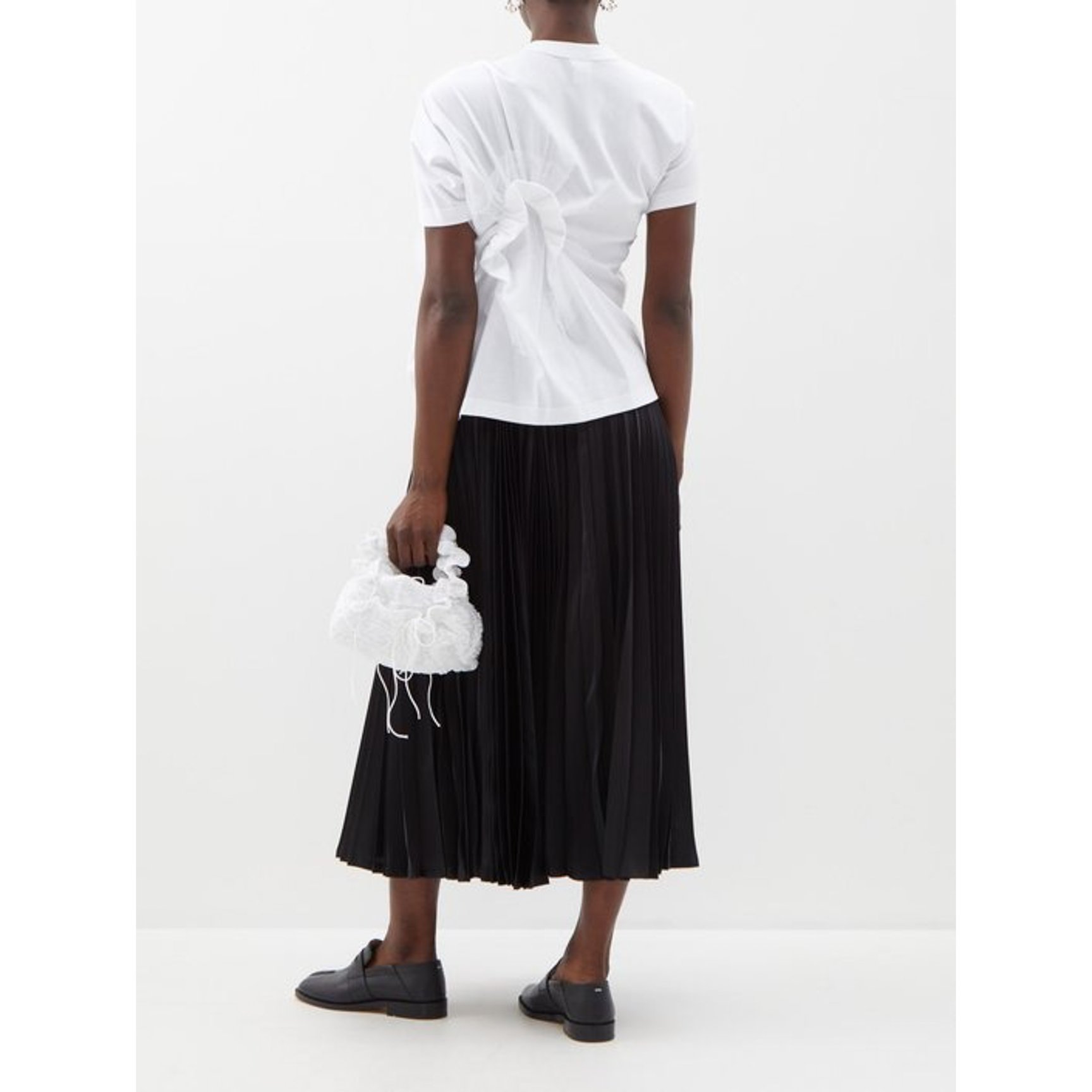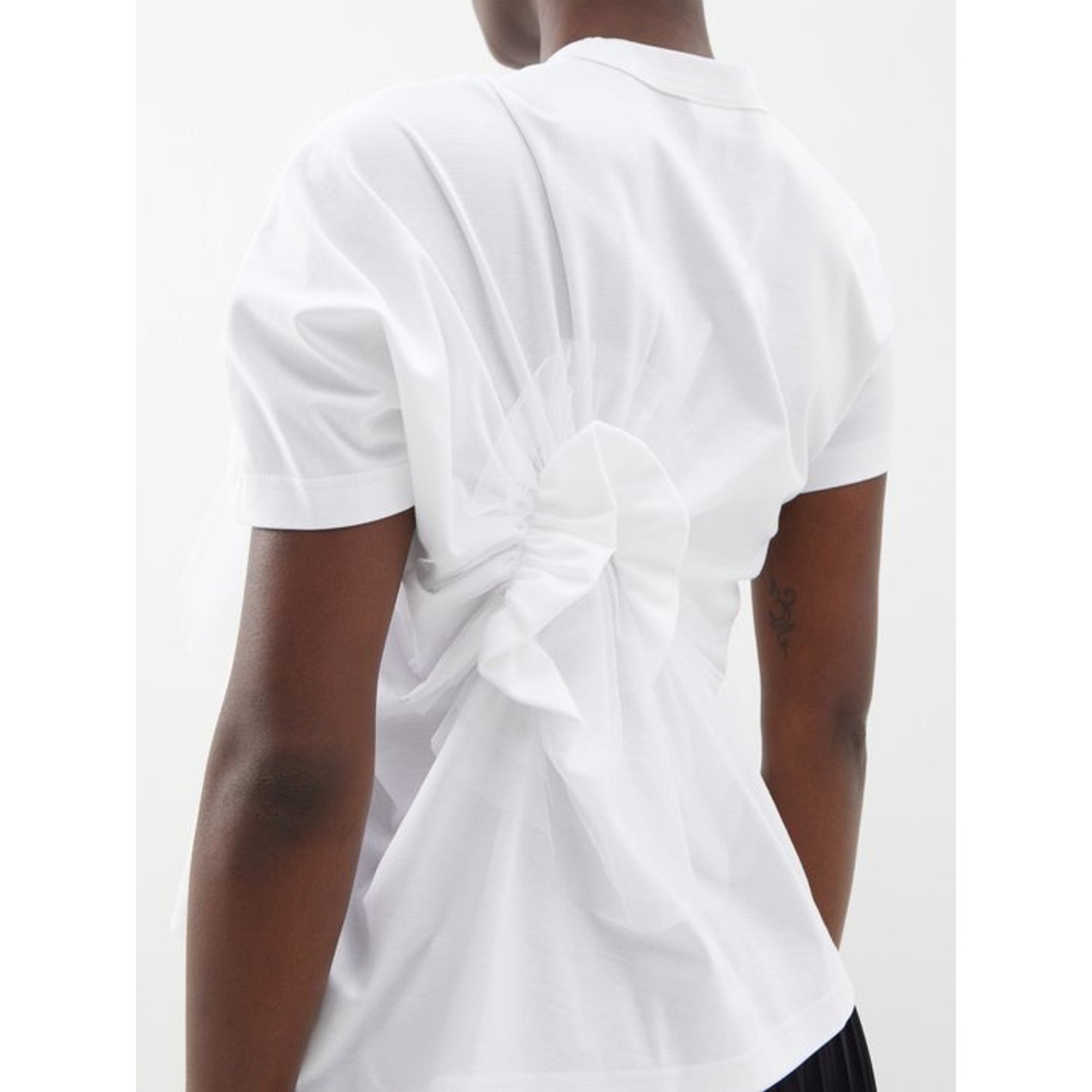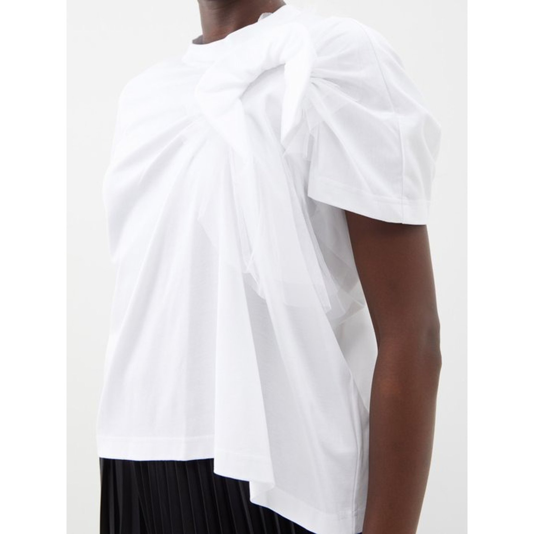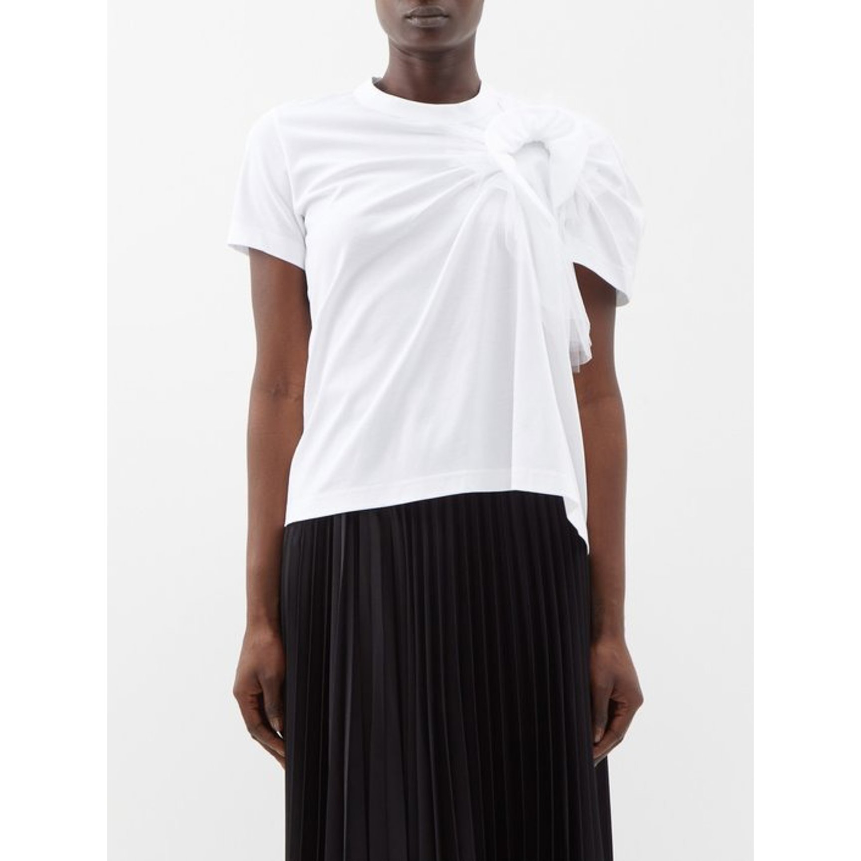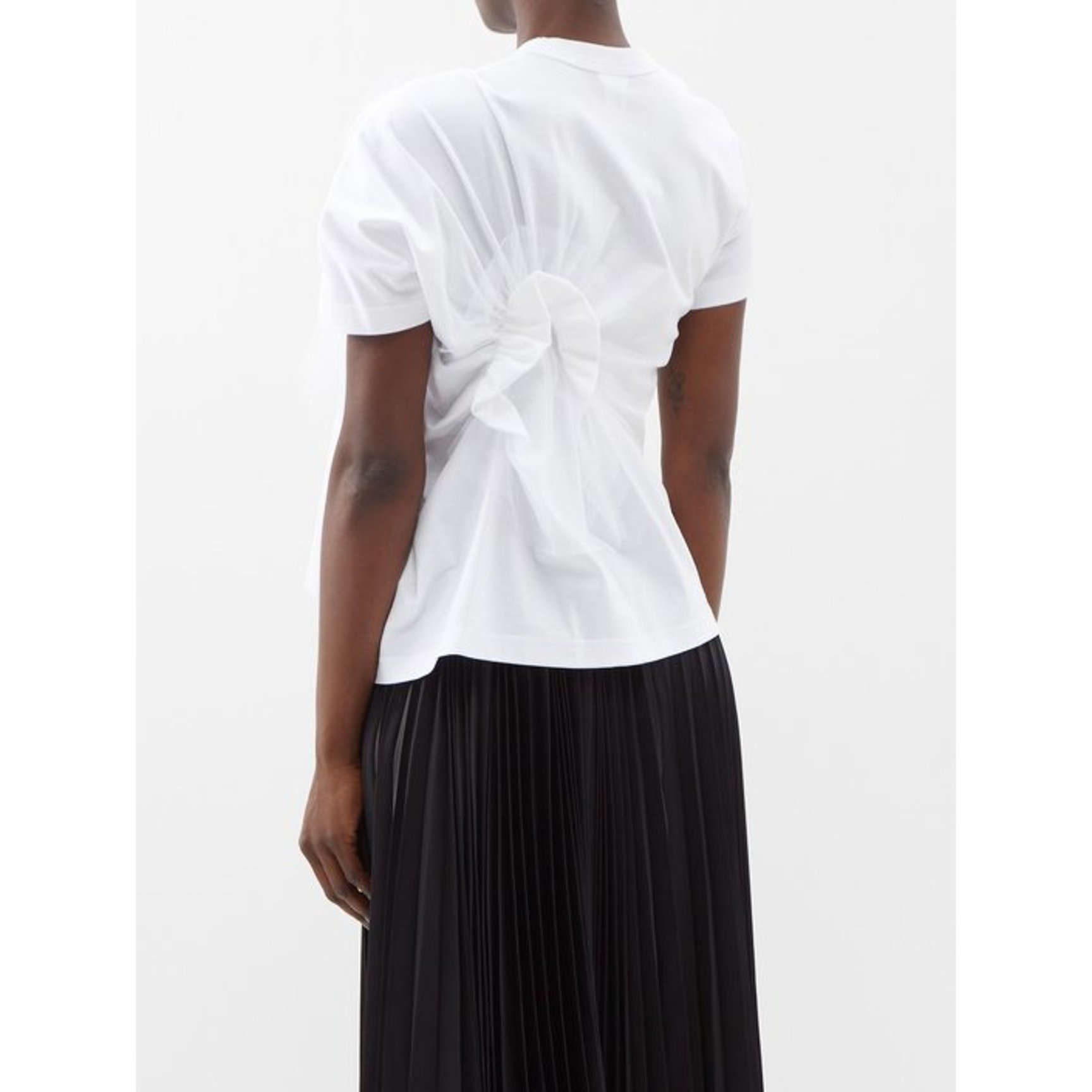 クシュっと生地を寄せてアクセントをつけたデザインが印象的な「ノワール ケイ ニノミヤ(NOIR KEI NINOMIYA)」のコットンTシャツ。デザイン性がありながら、ベースはシンプルな白Tシャツなので、さまざまなスタイルに合わせやすいのも嬉しいポイントです。