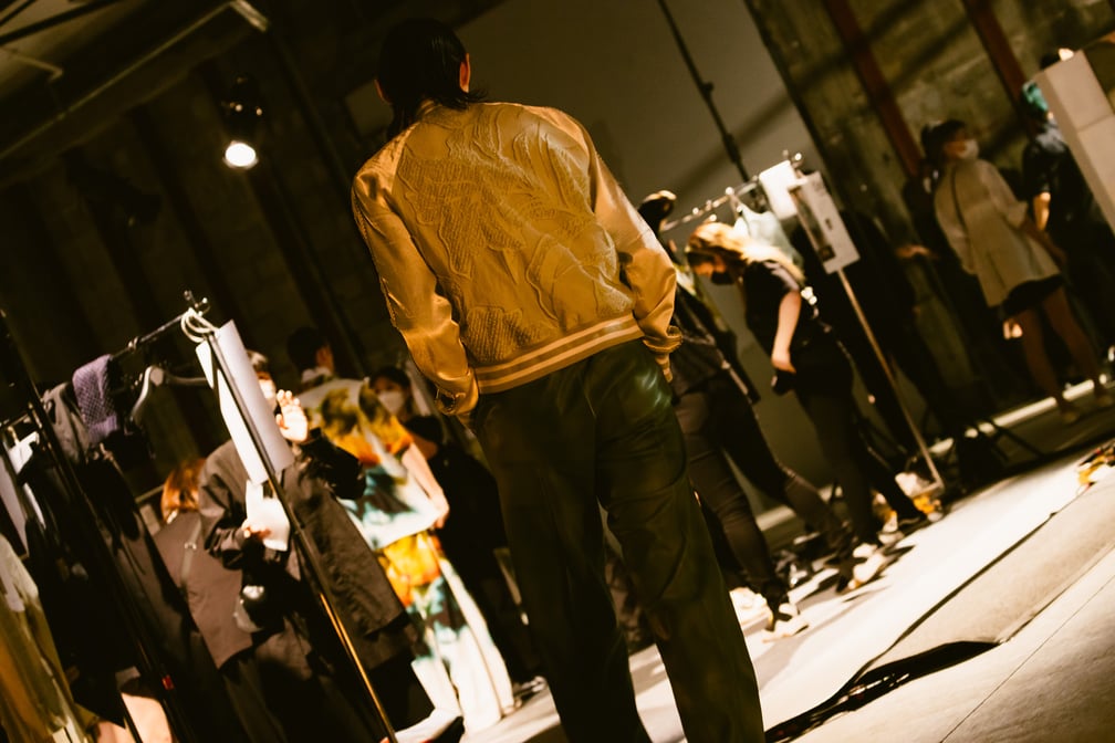 6月11日(金)、映像のプロットの一部として、公開収録の形式をとりながら開かれたランウェイショーにメディア関係者やバイヤーらが招かれた。エントランスをくぐると、いわゆる、緊張感の漂うファッションショーの「裏舞台」がひろがっている。たくさんのハンガーラックにルック順にそって整頓された洋服、メイクアップのエリアがあって、スタイリスト、フィッター、バックステージカメラマンが準備を進めている……。表舞台たるランウェイよりも先に、ゲストはバックステージを目にするという奇妙な体験が仕掛けられていたのだ。
