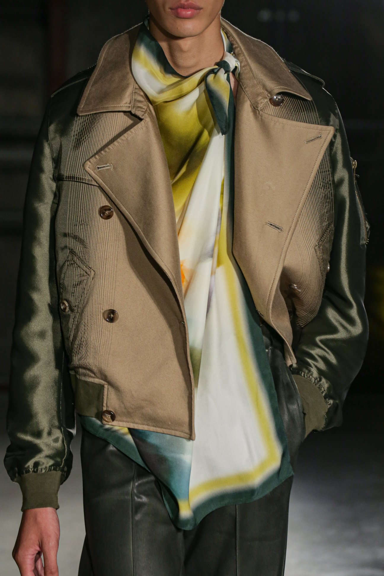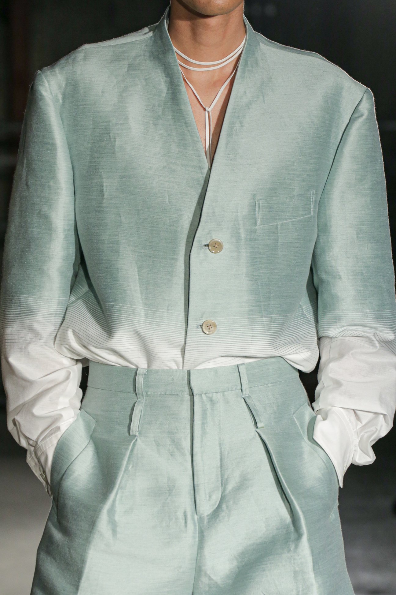 日本の生地の職人との綿密なコミュニケーション、テストと推敲の膨大なプロセスを経て、"基本"の追求の先に辿り着いた確かなアプローチのひとつが、精緻なグラデーションを描くファブリック表現だ。異素材を単につなぎ合わせるのではなく、織りのテクニックを最大限に活かして、本来なら混ざり合わないものをなだらかに共存させていく。例えば、リネンからコットン、ナイロン、あるいはトランスペアレントな存在へと徐々に変化していくタークを象徴する素材は、今季もアップデートされて健在だった。テーラードジャケットをパンツにタックインして——あるいは今季、裾を結びあげて——生み出される新鮮なシルエットは、ヘムに向かってシャツ地に切り替わる素材なくして成りえず、タークが一貫して追求する「服作りの基本である生地開発の先に当たり前に見えてくる景色であるデザインやスタイル」の最たる例だ。