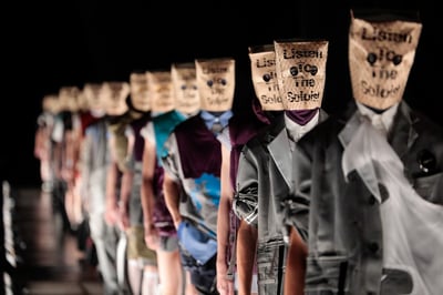 スロー再生のようにゆっくりと歩くモデルたち。ファーストルックはショールカラーのベストで、裾や襟の一部が折り返されていたり裏地が身頃から大きくはみ出していたりと、ソロイストらしい難解なストラクチャーに視線が惑わされる。首元はニットとシャツとタートルネックを重ね、ベストの裾の下にはMA-1のディテールを取り入れるなど、既存の枠にはまらないギミックが満載だ。スラックスは膝の切れ込みから脚を出し、ハーフパンツのようにスタイリング。頭には「Listen To The Soloist」と書かれた紙袋が被され、アノニマスな雰囲気を醸し出している。