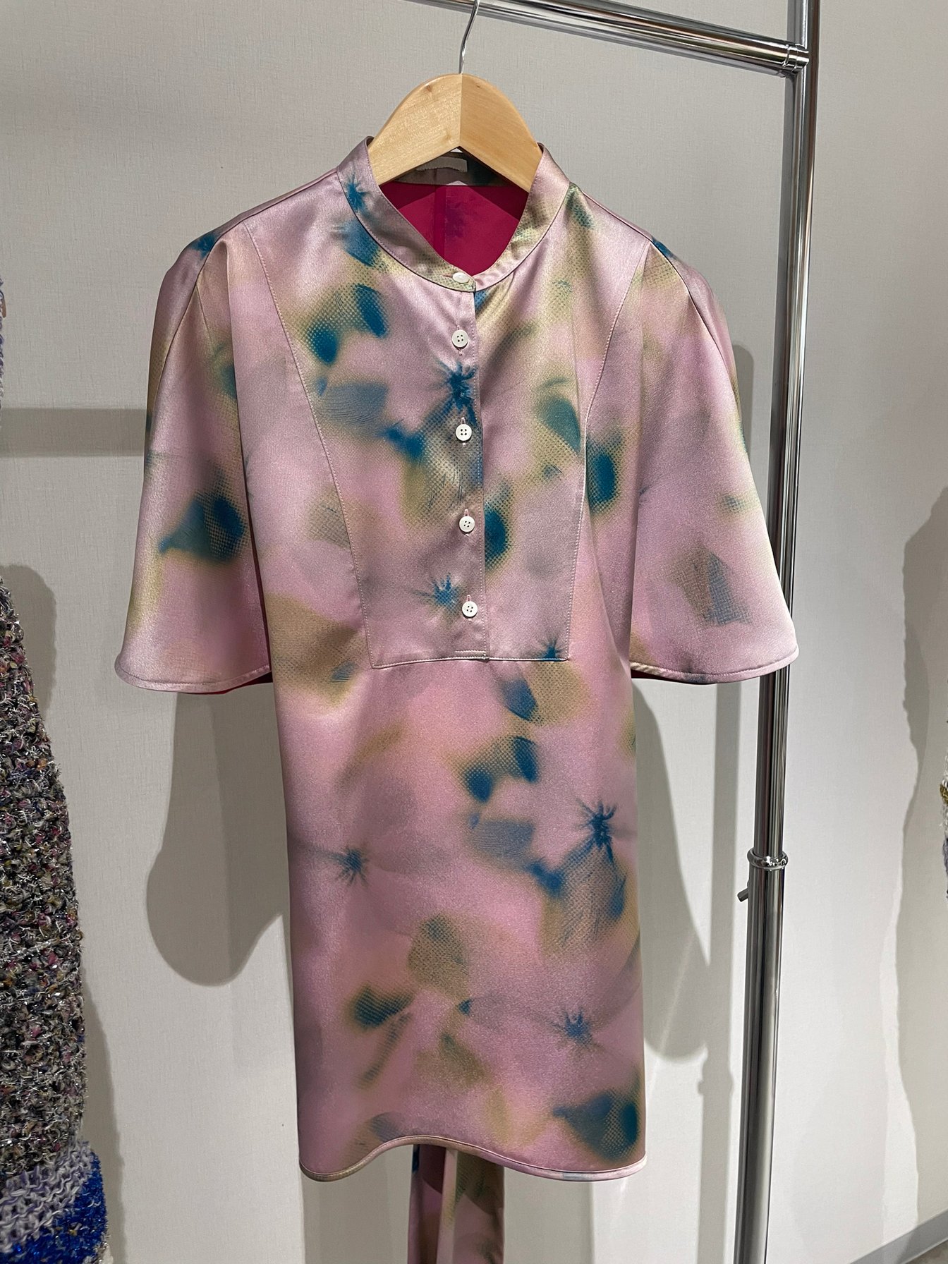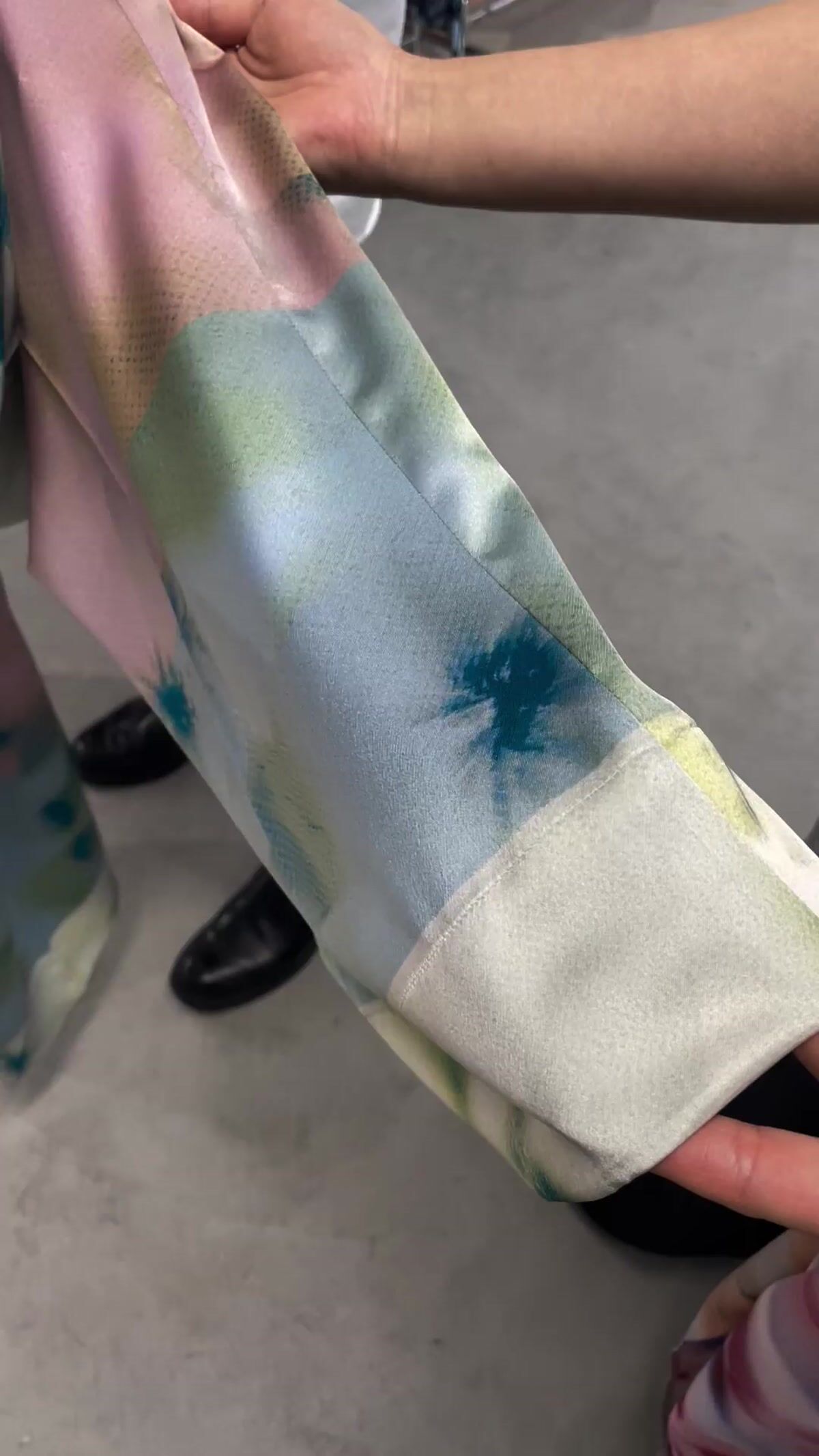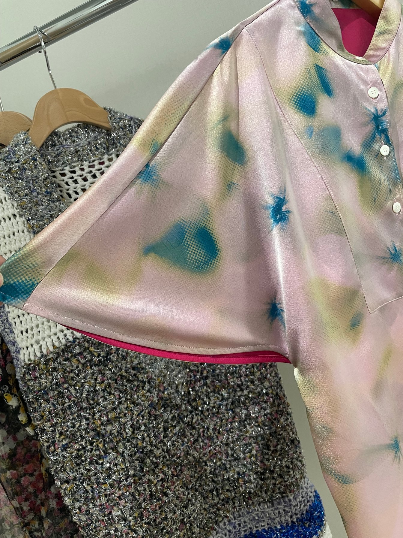 テルマが開発した特殊な両面同時プリント技術は、表地と裏地の色が互いに反映し合う独自の表現を可能にしている。通常のプリント工程では実現困難な、複雑な色の重なりと奥行きが生まれる仕組みだ。この技術を活用したアイテムは、光の当たり方によって見え方が変化するという特徴を持つ。「見る角度によって色のニュアンスが変わっていく」という中島の言葉通り、一度見ただけでは把握できない奥行きが魅力となっており、さながら日本画の裏彩色のような味わいが服となって立ち上がる。このアプローチにより、立体感と奥行きのある表現が生まれ、単に「柄と柄」を組み合わせることで新たな表現領域を開拓した。