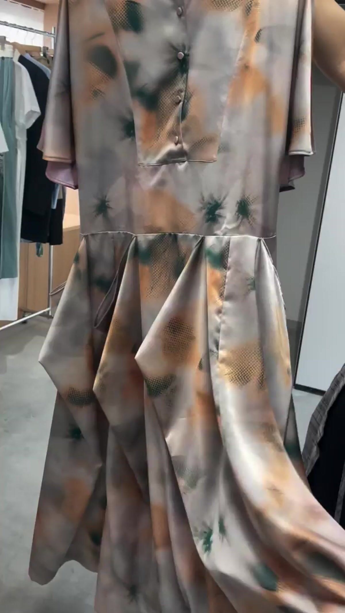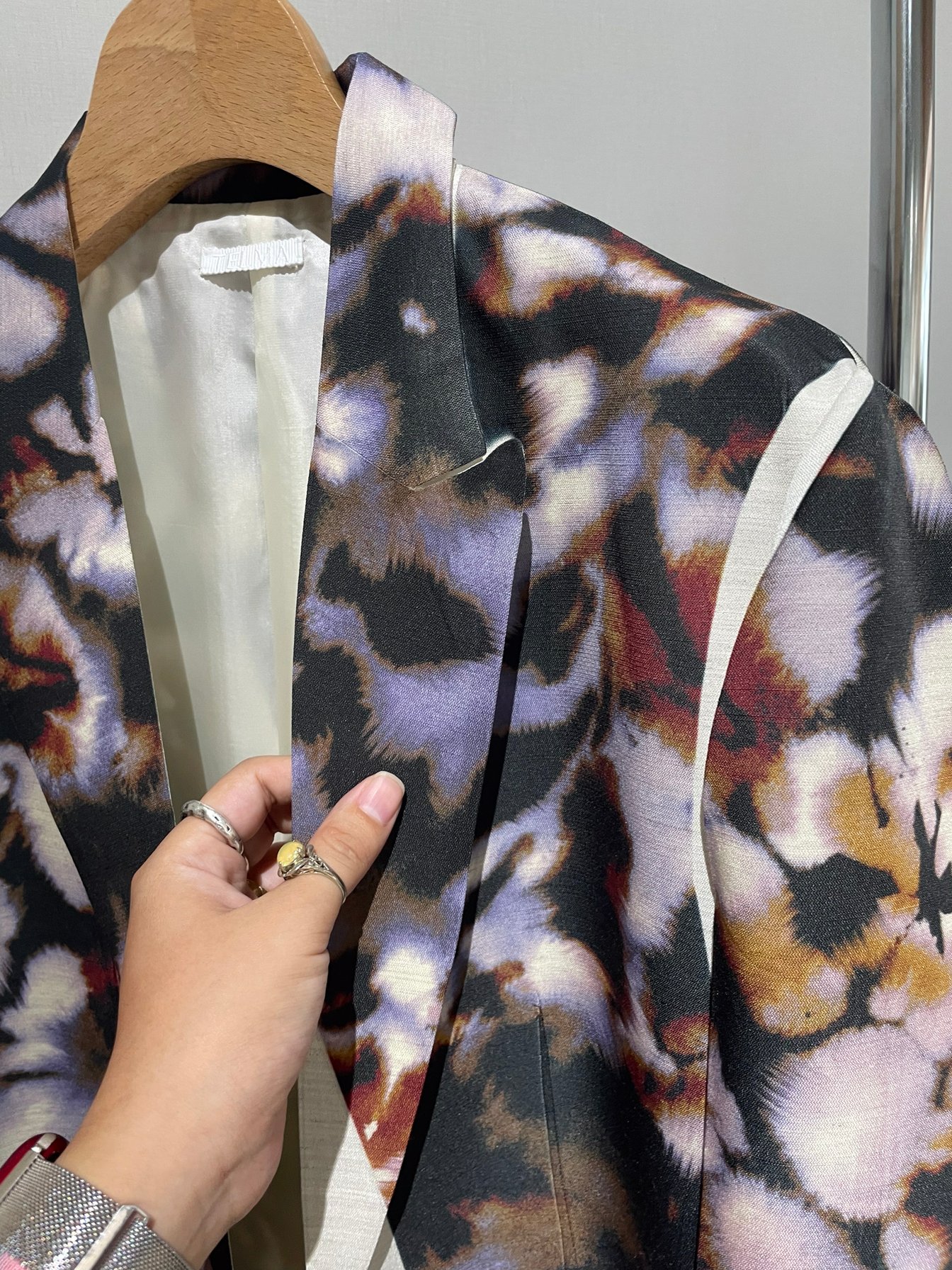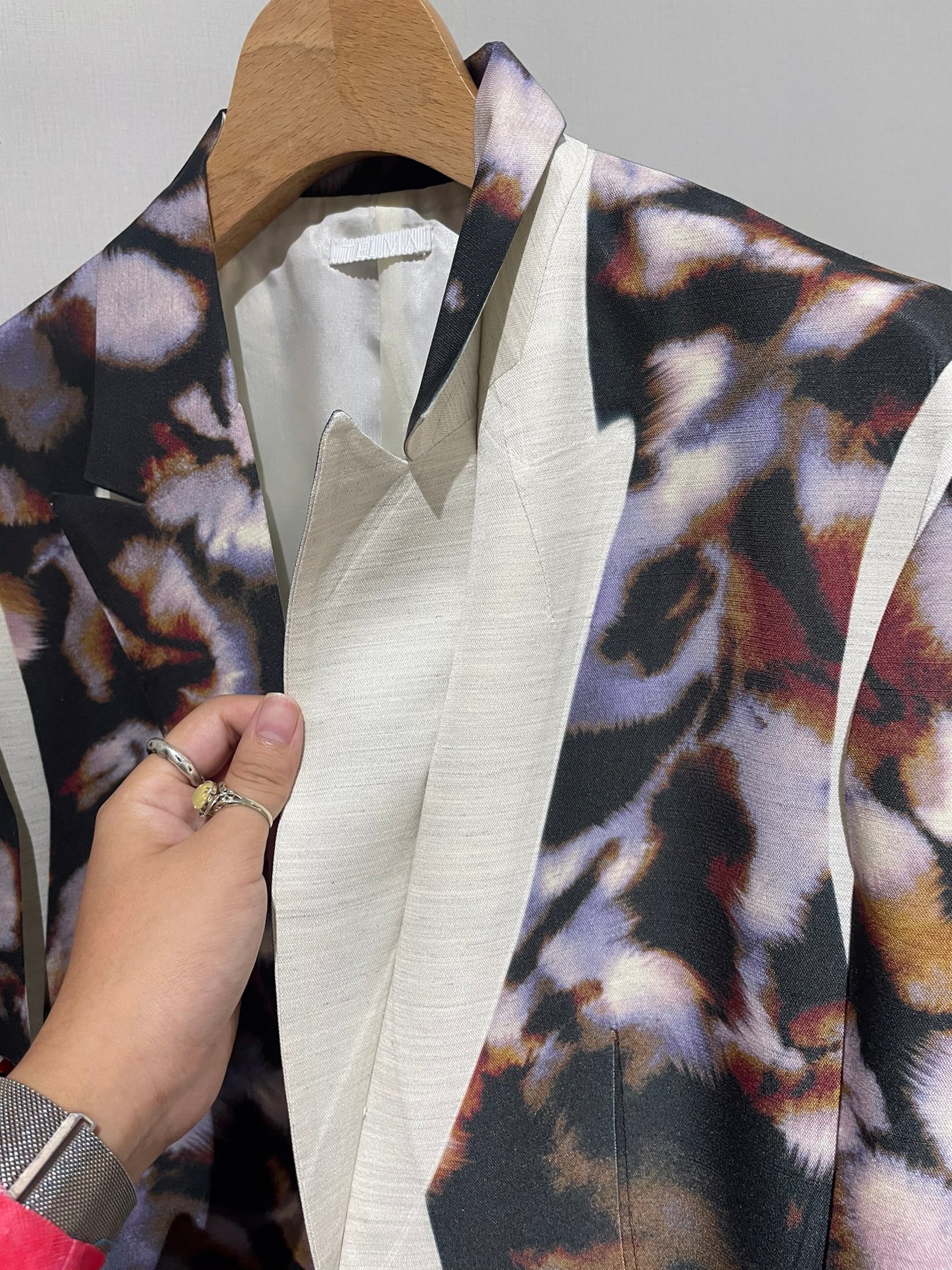 テルマが開発した特殊な両面同時プリント技術は、表地と裏地の色が互いに反映し合う独自の表現を可能にしている。通常のプリント工程では実現困難な、複雑な色の重なりと奥行きが生まれる仕組みだ。この技術を活用したアイテムは、光の当たり方によって見え方が変化するという特徴を持つ。「見る角度によって色のニュアンスが変わっていく」という中島の言葉通り、一度見ただけでは把握できない奥行きが魅力となっており、さながら日本画の裏彩色のような味わいが服となって立ち上がる。このアプローチにより、立体感と奥行きのある表現が生まれ、単に「柄と柄」を組み合わせることで新たな表現領域を開拓した。