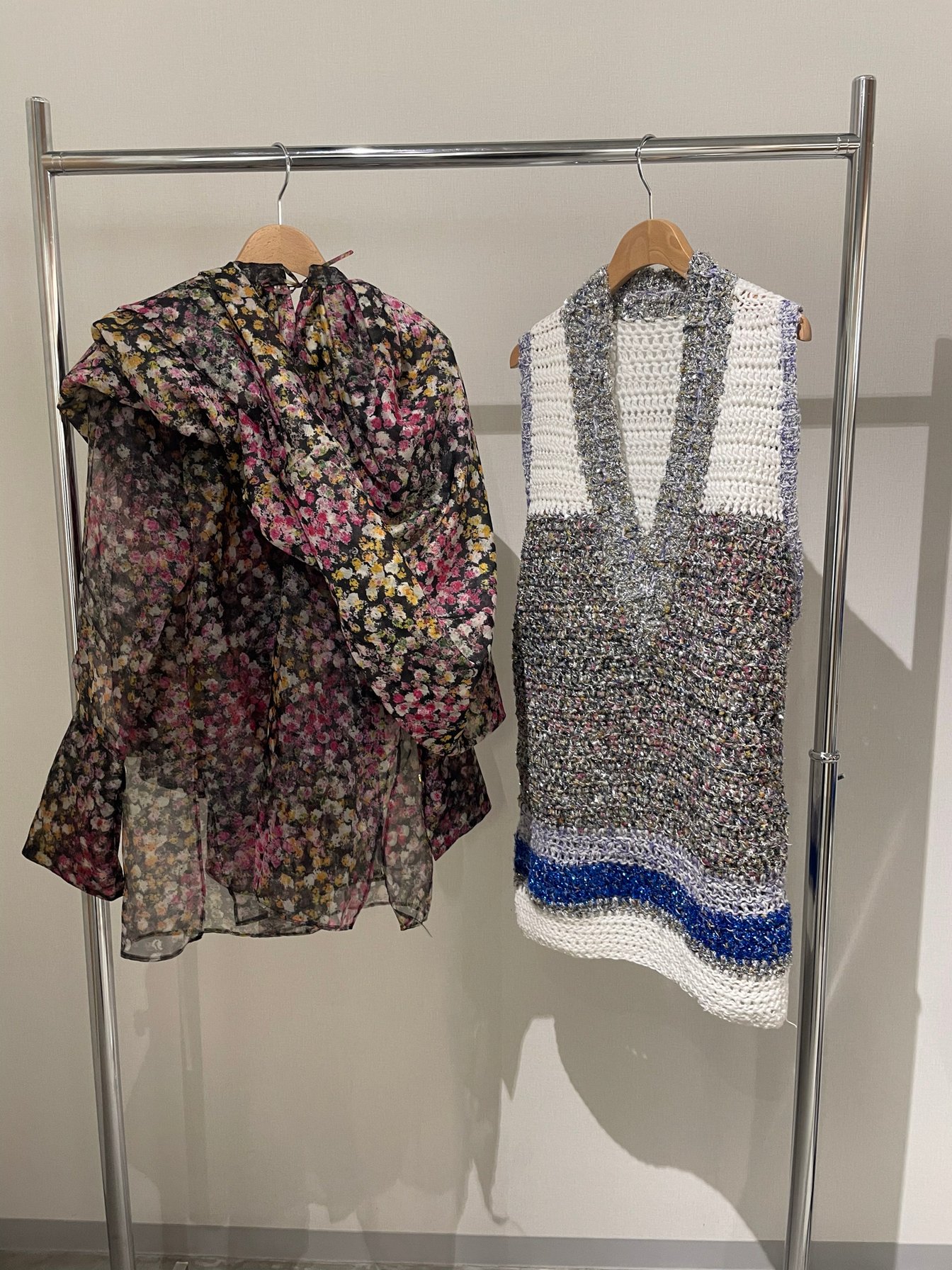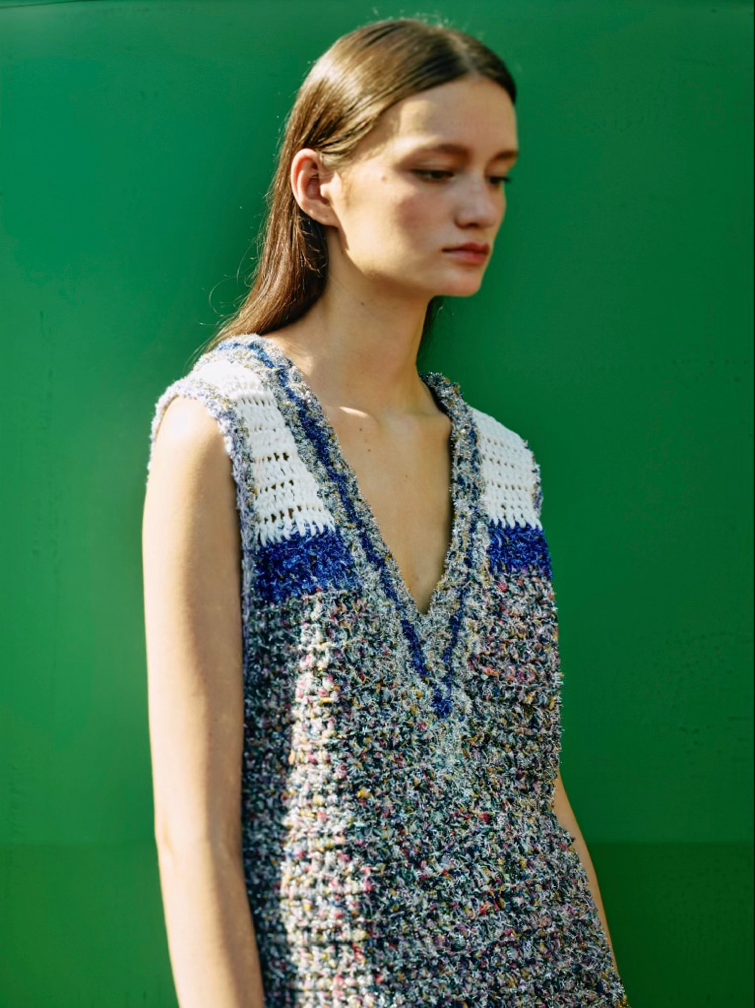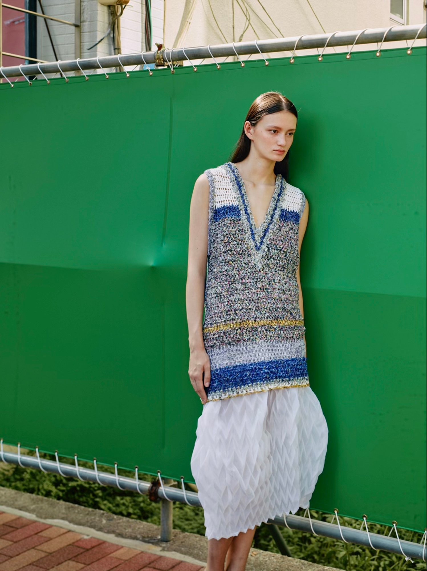 アイテムのアップデートも続けている。今シーズンからテルマが提案するのは、残布を用いたニットだ。2023年春夏コレクションで発表された生地を裂いて糸にし、手編みでニットに蘇らせたという。