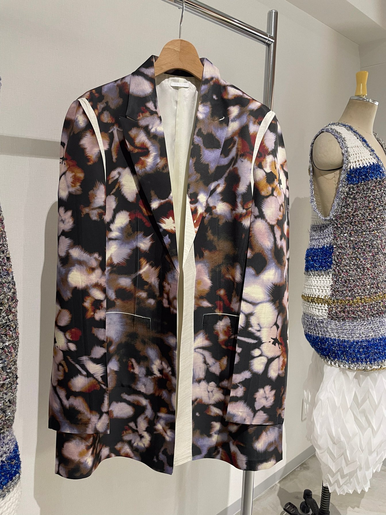 単なる平面的なデザインではなく、半円や四角などの幾何学的な形を取り入れたパターンメイキングや、熱を与えると柔らかくなり冷えると固まるポリエステルの特徴を活かすために感熱剤を用いたジャケットにも注目したい。中島は「ジャケットが好き」と語りながらも、「真面目に作りすぎたジャケットはどこで着ればいいのかわからない」という現代的な課題を認識しており、その解決方法として、平面でも立体でもないジャケットを製作。「平面っぽくもないし、立体ともまた違う」という新たな次元の製品が、特に海外市場で高い評価を得ているという。
