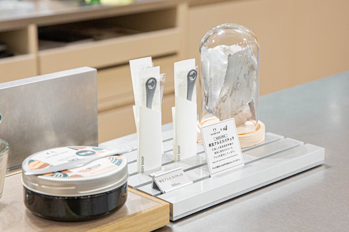 内装を見てサステナブルな素材を使用しているかどうかは、お客さまには分かりづらいですよね。日本人のお客さまに共感いただける素材を使用したいと考えた時、引退した東海道新幹線車両の再生アルミを使用するのはどうかとーー。役割を終えた素材に新しい命を吹き込むことで、よりサステナブルな店舗内装の開発を実現しました。東海旅客鉄道(以下JR東海)の提供する、新幹線再生アルミを店舗内装用建材として使用するのは、JR東海グループ以外では初めてで、ザボディショップが持つDNAに共感してくれたと思います。そして再生アルミを他のアイテムにも広げられないかと考え、クリームタイプの製品を取る際に使用するスパチュラも展開しています。今後も再生アルミを採用したアイテムを検討しています。