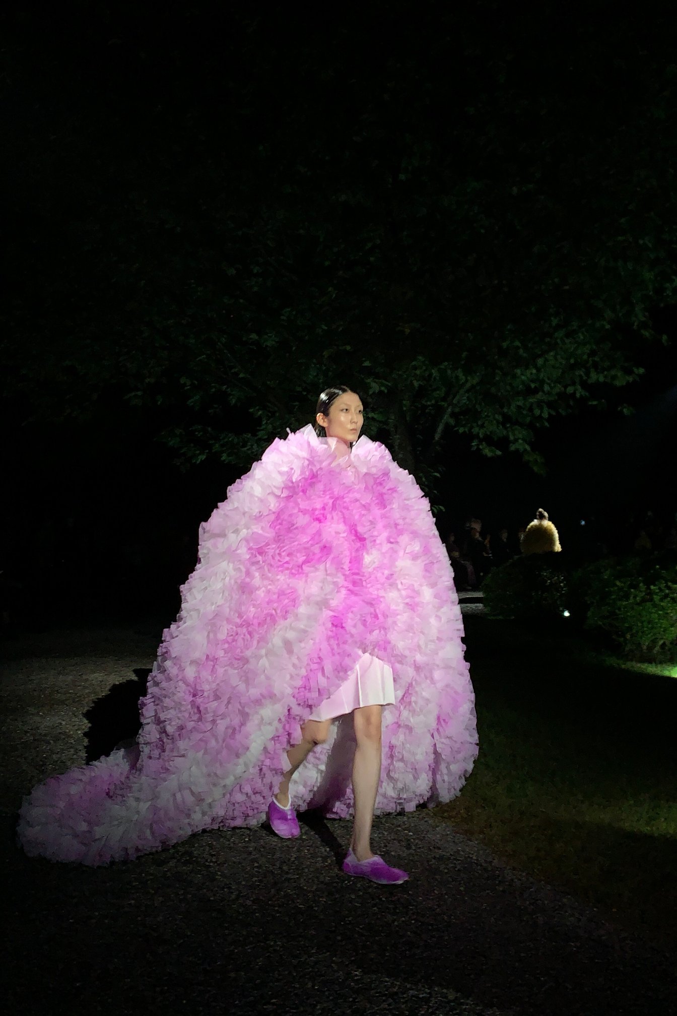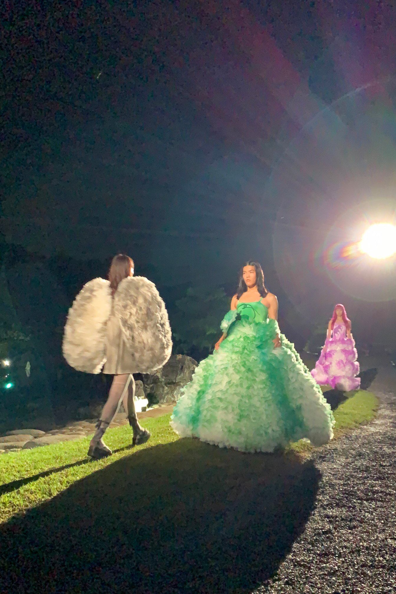 招待状にはブランドの象徴的なフリルがあしらわれており、当日は約100人の招待客が様々なカラーのフリルを手に二条城の東大手門をくぐった。雨上がりの三日月と提灯の明かりに照らされた砂利道を進んで清流園へ。池の周りにクリアチェアが置かれ、ゆったりとした音楽と蛙の鳴き声がこだまする。
