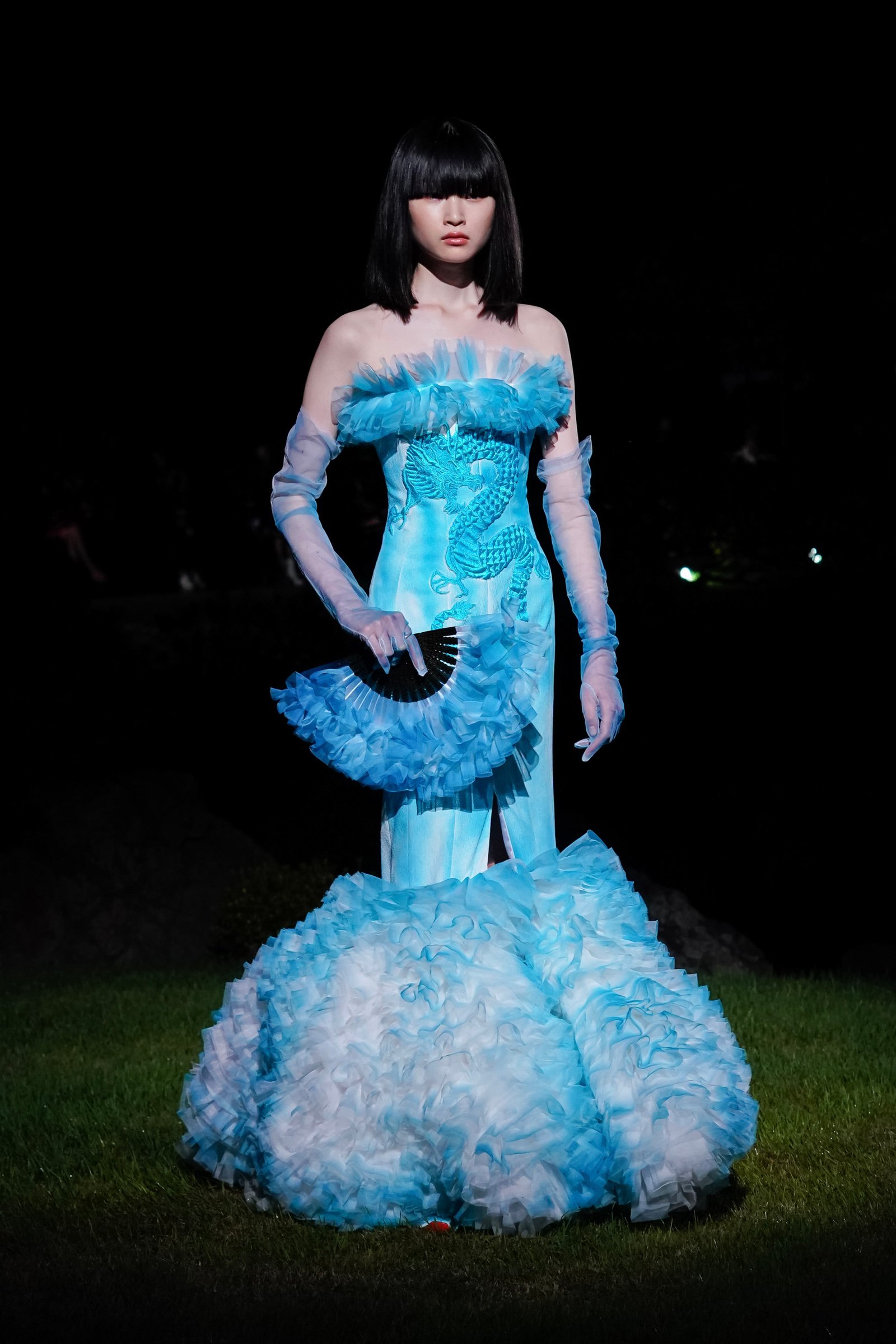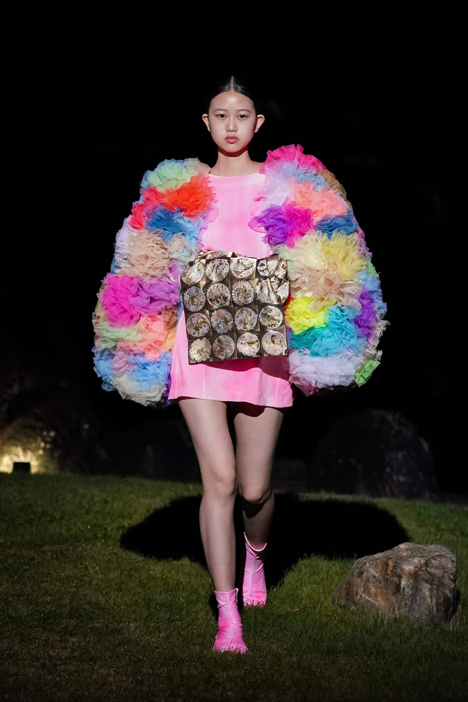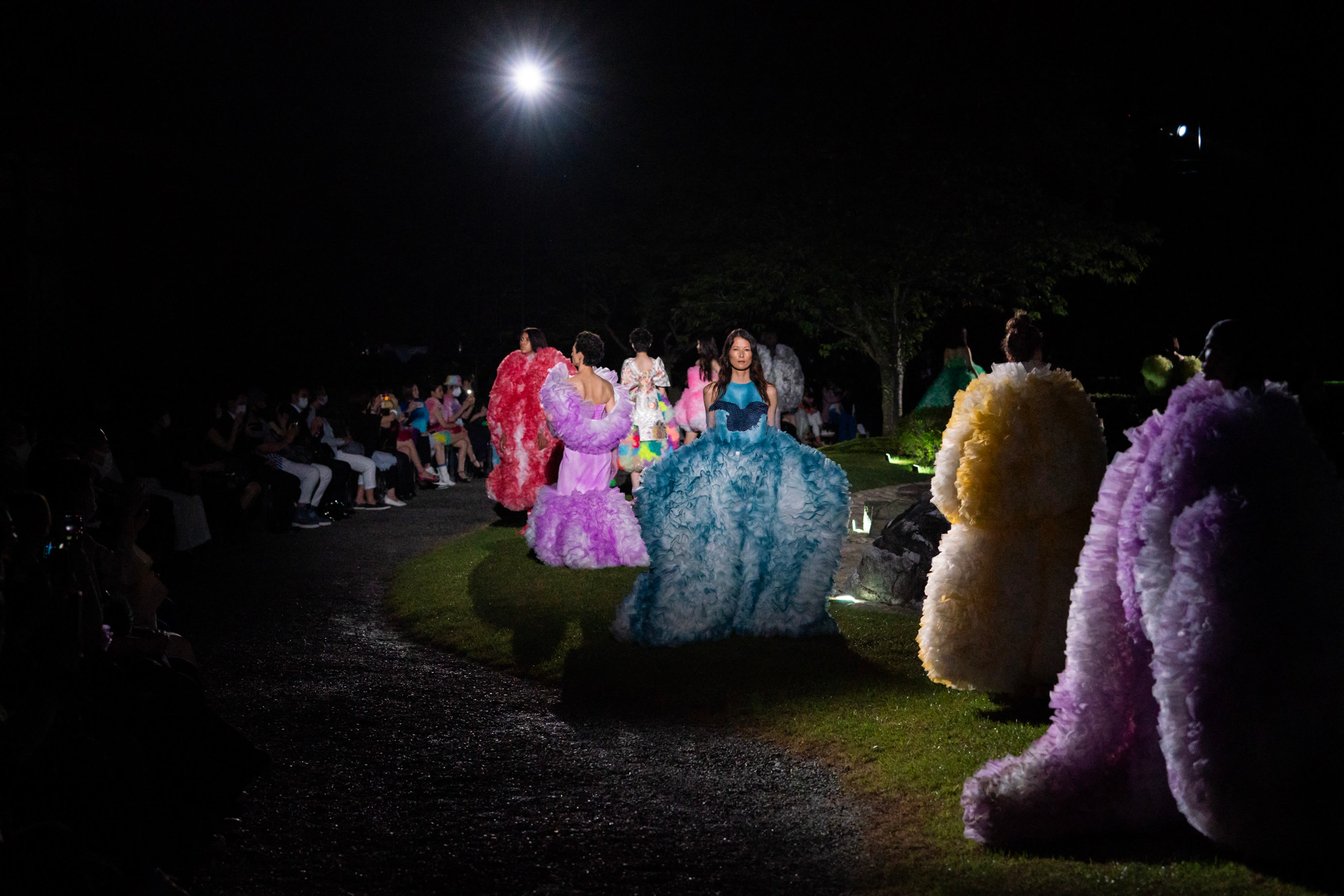 神聖なムードに包まれた庭園に登場したファーストルックは、白地に朱赤が混じったフリルドレス。フィットしたボディとボリュームのあるフリルのコントラストが優美なプロポーションを生み出している。続くスタイルもフィット&フレアをベースとしながら多様なシルエットで、帯を用いたり日本人形のようなメイクなど和洋折衷。ペットボトルのリサイクル素材を用いているというフリルの色は、単色からマルチカラーへと変化していった。