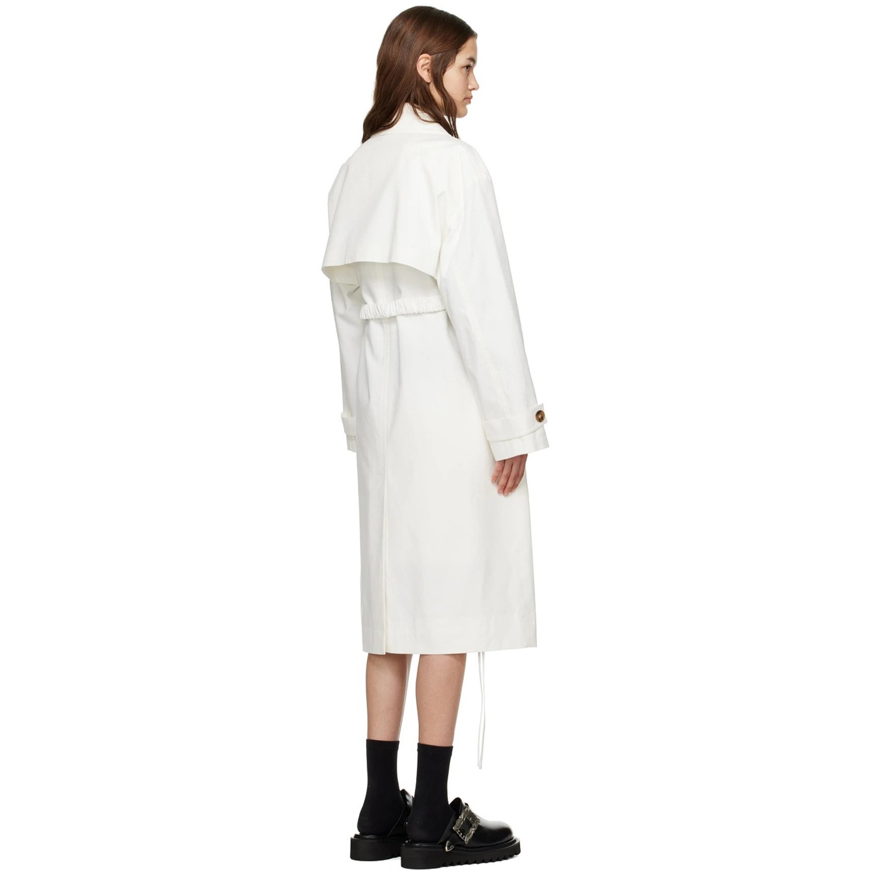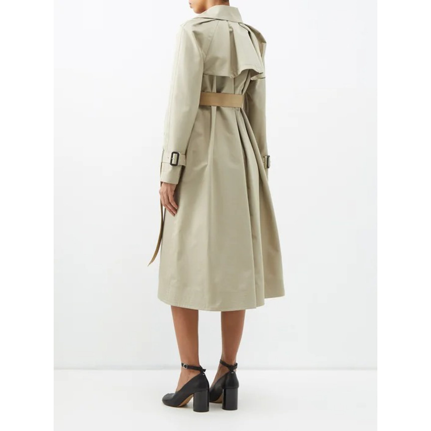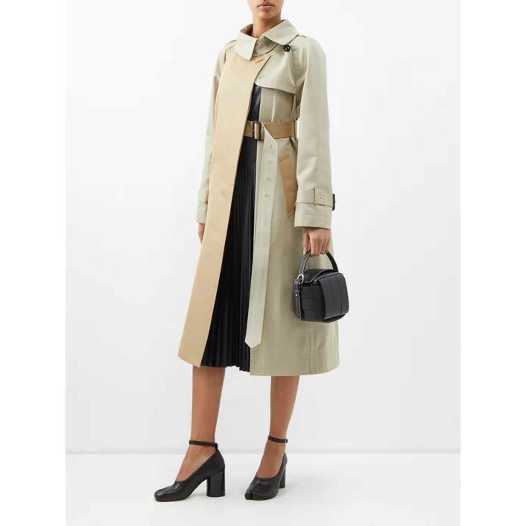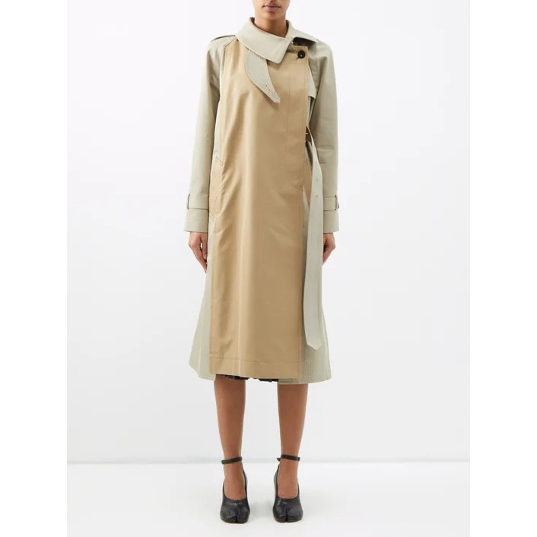 異なるベージュのカラーブロック、アシンメトリーなディテール、大きめのギャザーが入った背面フラップなど、全方位可愛く見せてくれる「サカイ(sacai)」のトレンチコート。まとうだけで気分の上がるデザインです。