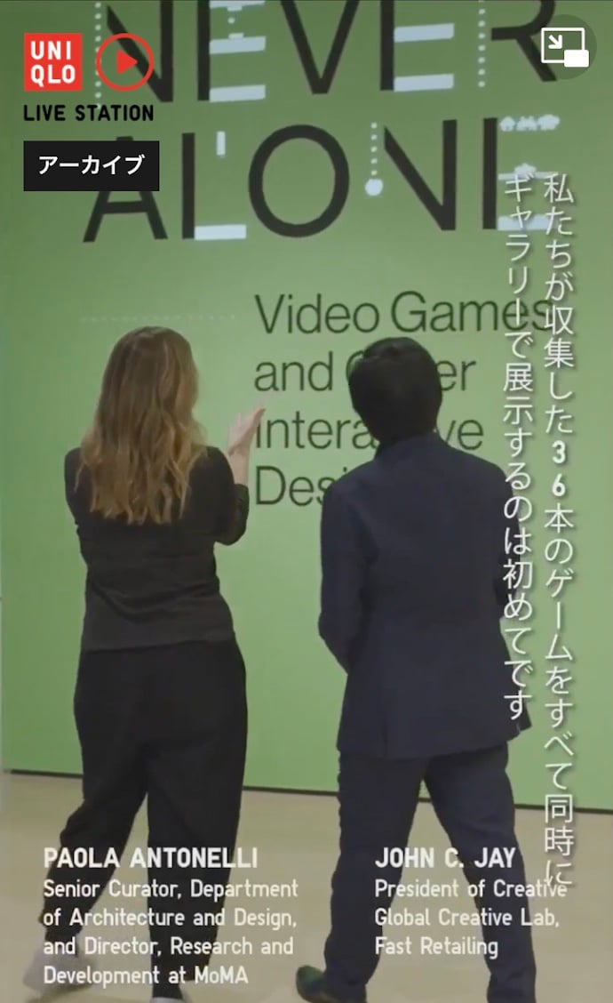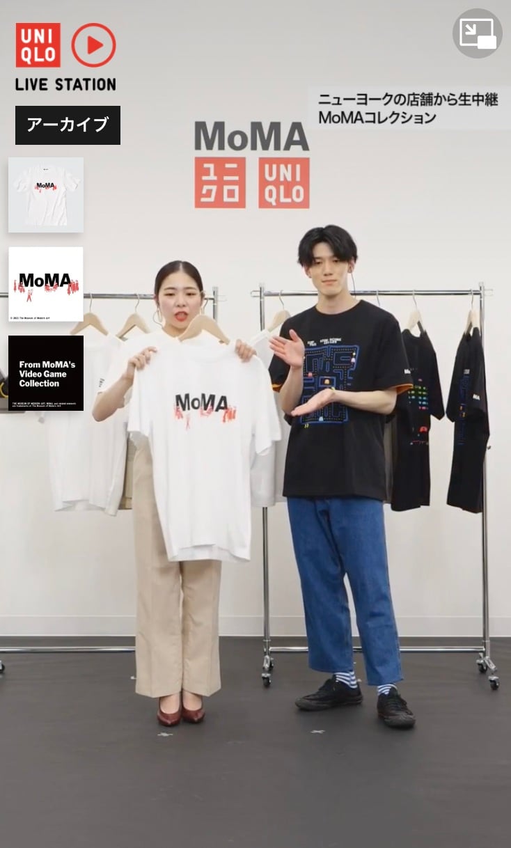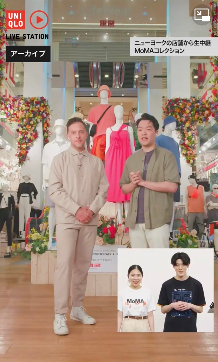今回の配信では、なんとニューヨーク最大のグローバル旗艦店「ユニクロ ニューヨーク 5番街店」から生中継を実施!ライブコマース上で海外中継を試みるなど、ダイナミックな取り組みを多角的に行っているのもUNIQLO LIVE STATIONならでは。視聴者に常に驚きと新しい購買体験を提供するアプローチを試みています。登場キャストは、ユニクロ StyleHint StaffのAiraさんとShunsukeさん、ユニクロ ソーホー ニューヨーク店の店長 舟見さん、「UT」シニアディレクター Nickさんの4人が登場。ユニクロとMoMAによる取り組みは10周年を迎え、アートの魅力を服を通して世界へ発信し続けてきました。今回は、MoMA(ニューヨーク近代美術館)の内部へ潜入する特別な映像も大公開!ビデオゲームとインタラクティブデザインに焦点を当てたMoMAの最新の展覧会「Never Alone」を紐解く貴重なインタビュー映像も紹介されました。アート好き必見のトピックが目白押しです。
