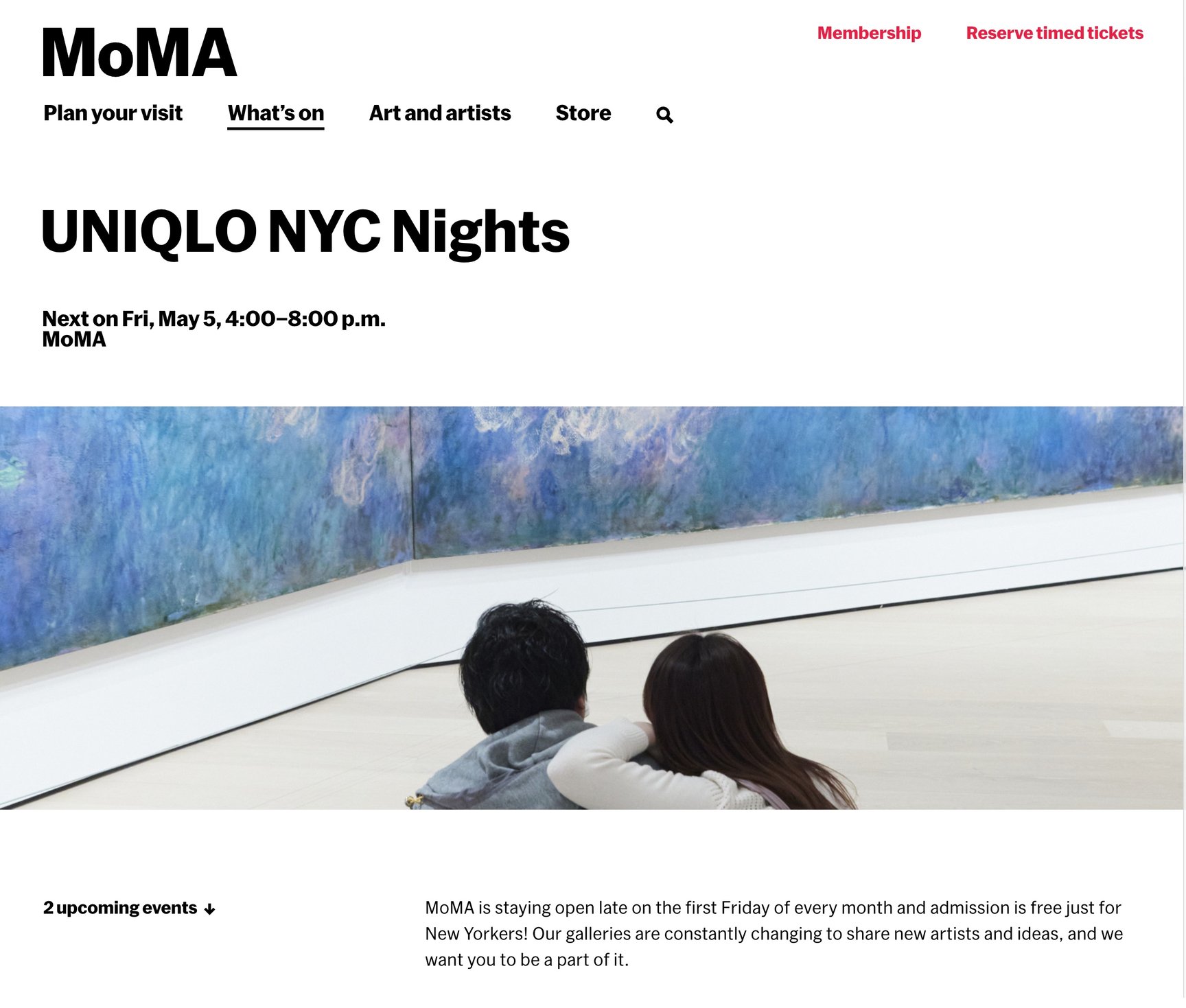 ユニクロは2013年、すべての人がアートに触れることができる機会の創出を目的として、MoMAとパートナーシップを締結。ニューヨーク市居住者を対象に、毎月1回MoMAの入館料が無料になるプログラム「UNIQLO NYC ナイト」の開催をはじめ、デジタル配信の動画シリーズ「UNIQLO Art For All」の公開、MoMAの収蔵作品をモチーフにしたコラボ商品を展開しています。