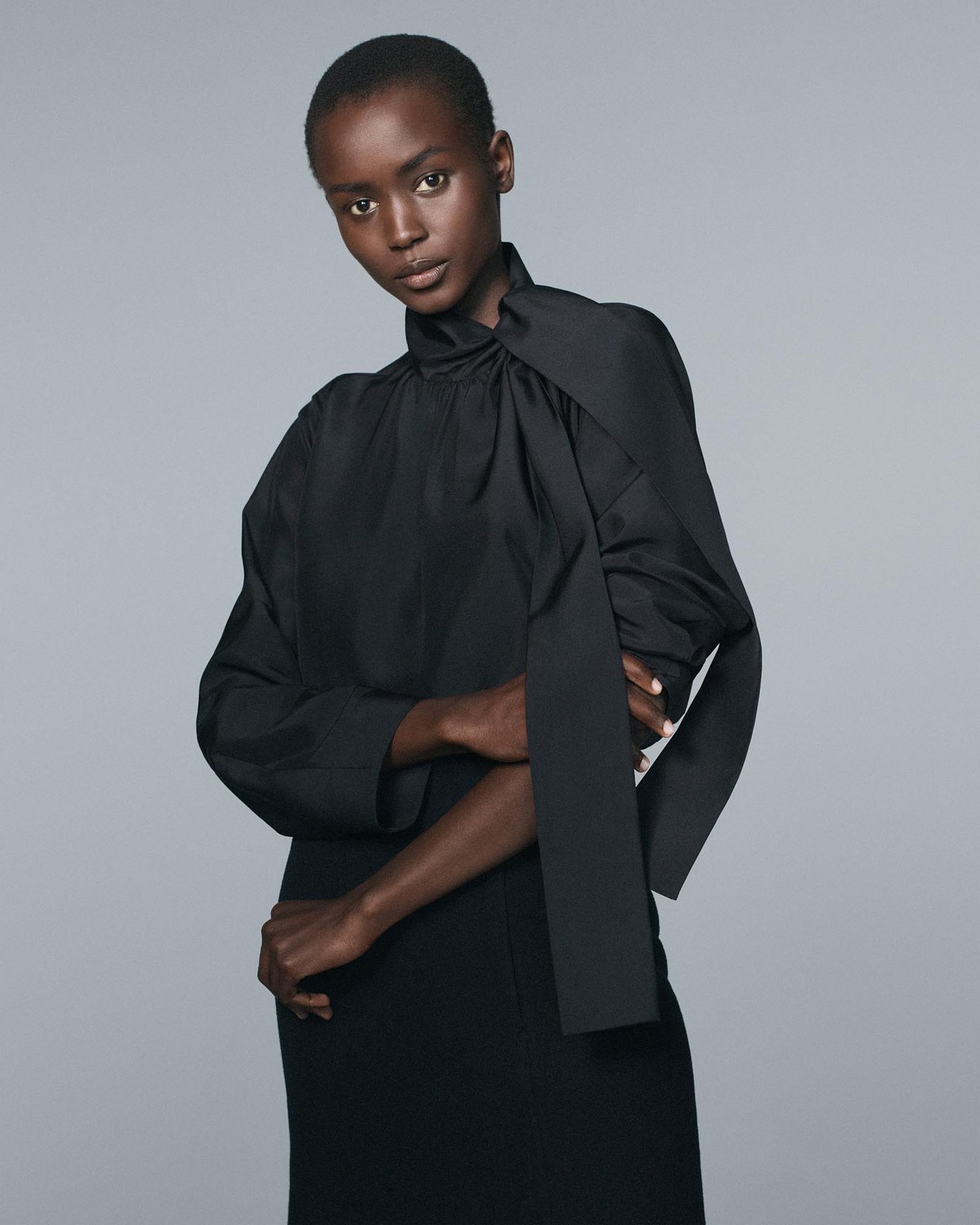 シルク100%で、襟のボウタイと首元のギャザーが特徴の「シルクボウタイブラウス(長袖)」(1万4900円)を着用。ボトムスの「ダブルフェイススカート」(7990円)は、柔らかなウールブレンドのダブルフェイス素材で製作し、フレアシルエットで左前にスリットを入れたアシンメトリーなデザインに仕上げています