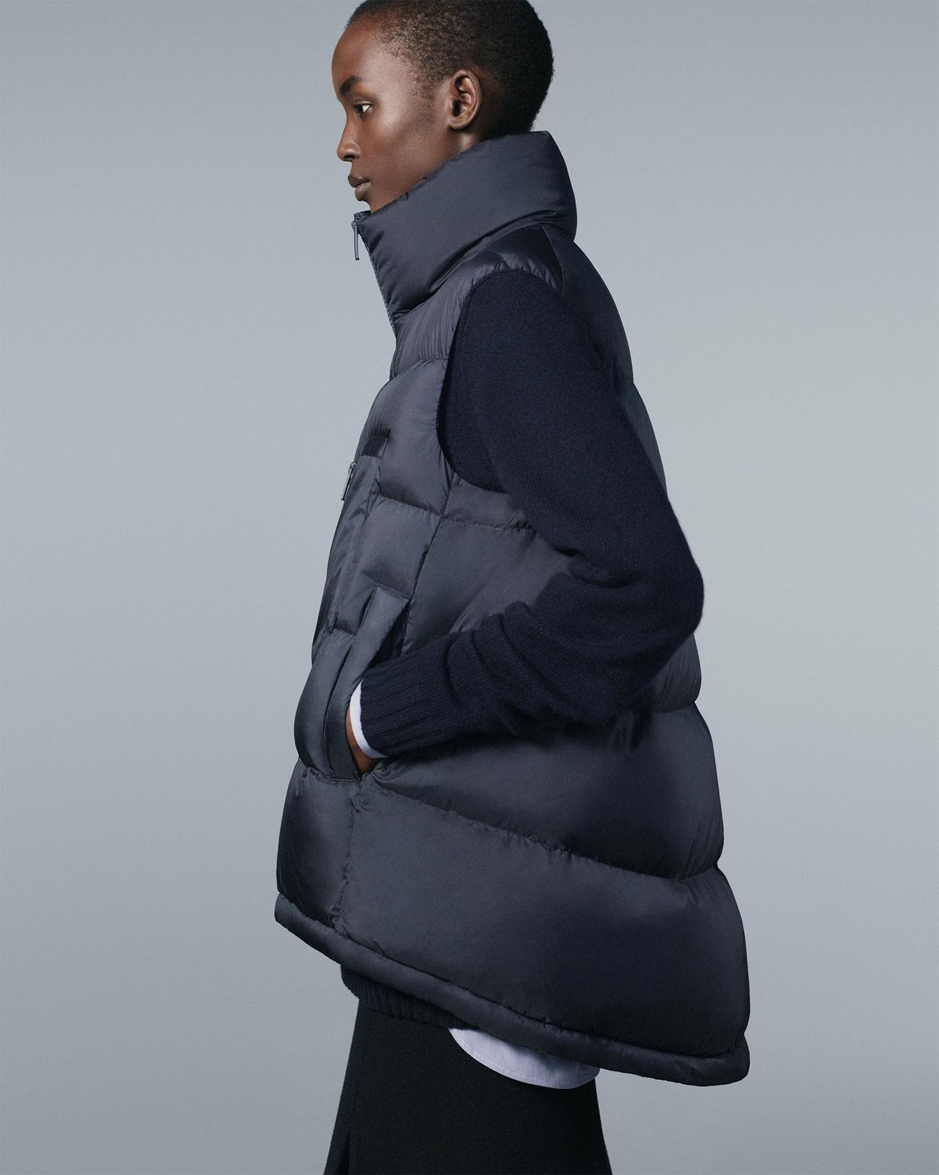 マットな素材で背面の裾がフレアシルエットの「ダウンボリュームベスト」(9990円)。インナーは「ミドルゲージカシミヤブレンドタートルネックセーター(長袖)」(1万2900円)に、裾とカフスが見えるように「スーピマコットンストライプシャツ(長袖)」(3990円)をレイヤードしています。ボトムスは「ダブルフェイススカート」(7990円)。