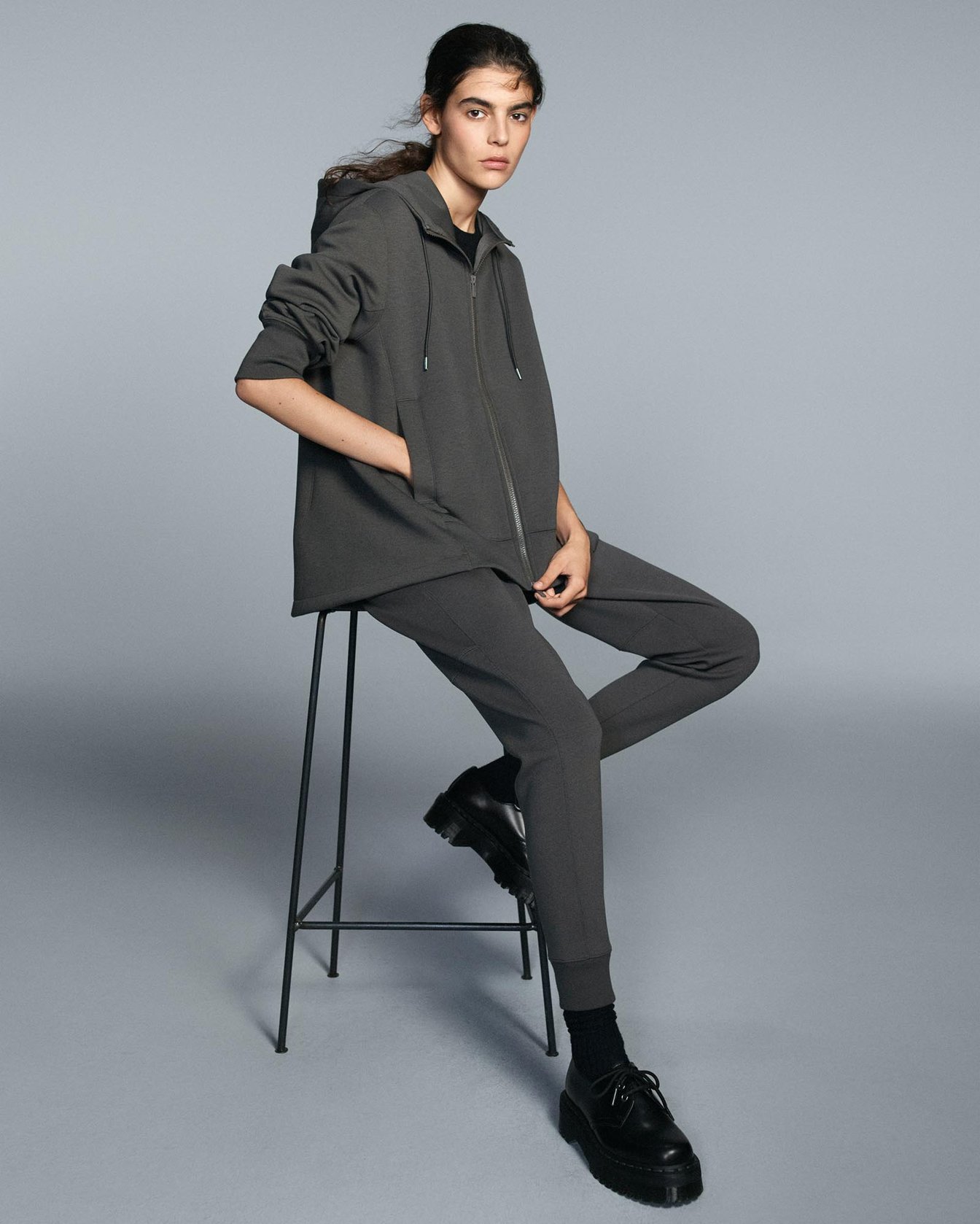 スポーティーなこちらのルックは、後ろ身頃のダーツによって裾を絞ると立体感が出る「ドライスウェットフルジップパーカ(長袖)」(4990円)と「ドライスウェットパンツ」(3990円)をセットアップで着用しています。首元に見えるニットは、二重の後ろ襟とリボンが付いたサイドのスリットが特徴の「ファインゲージカシミヤクルーネックセーター(長袖)」(1万2900円)。