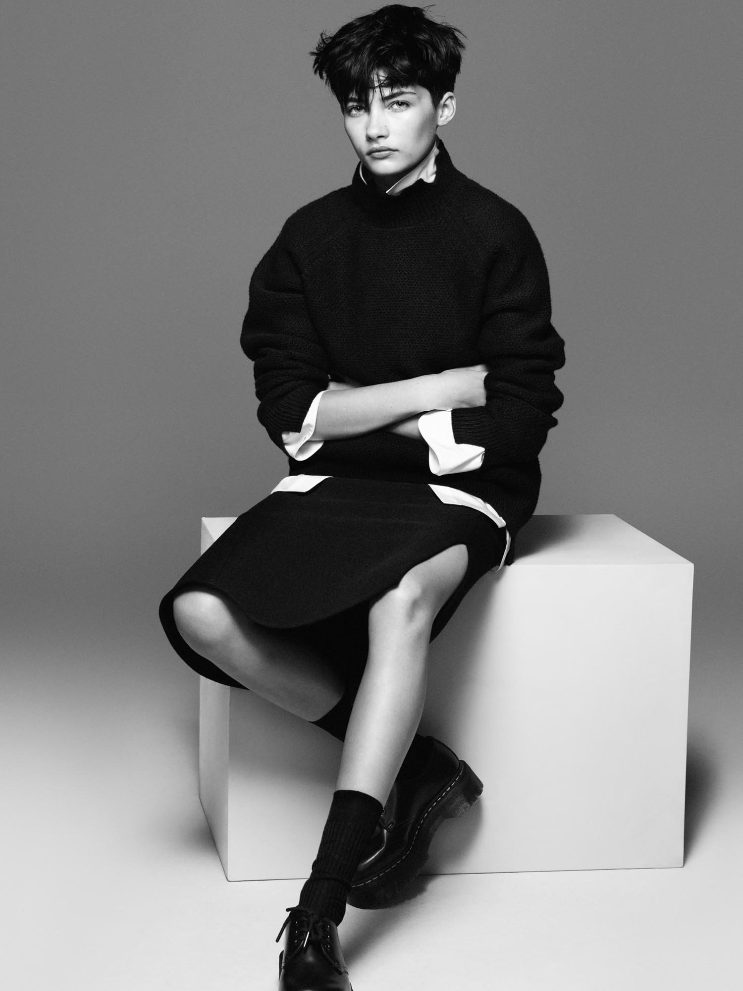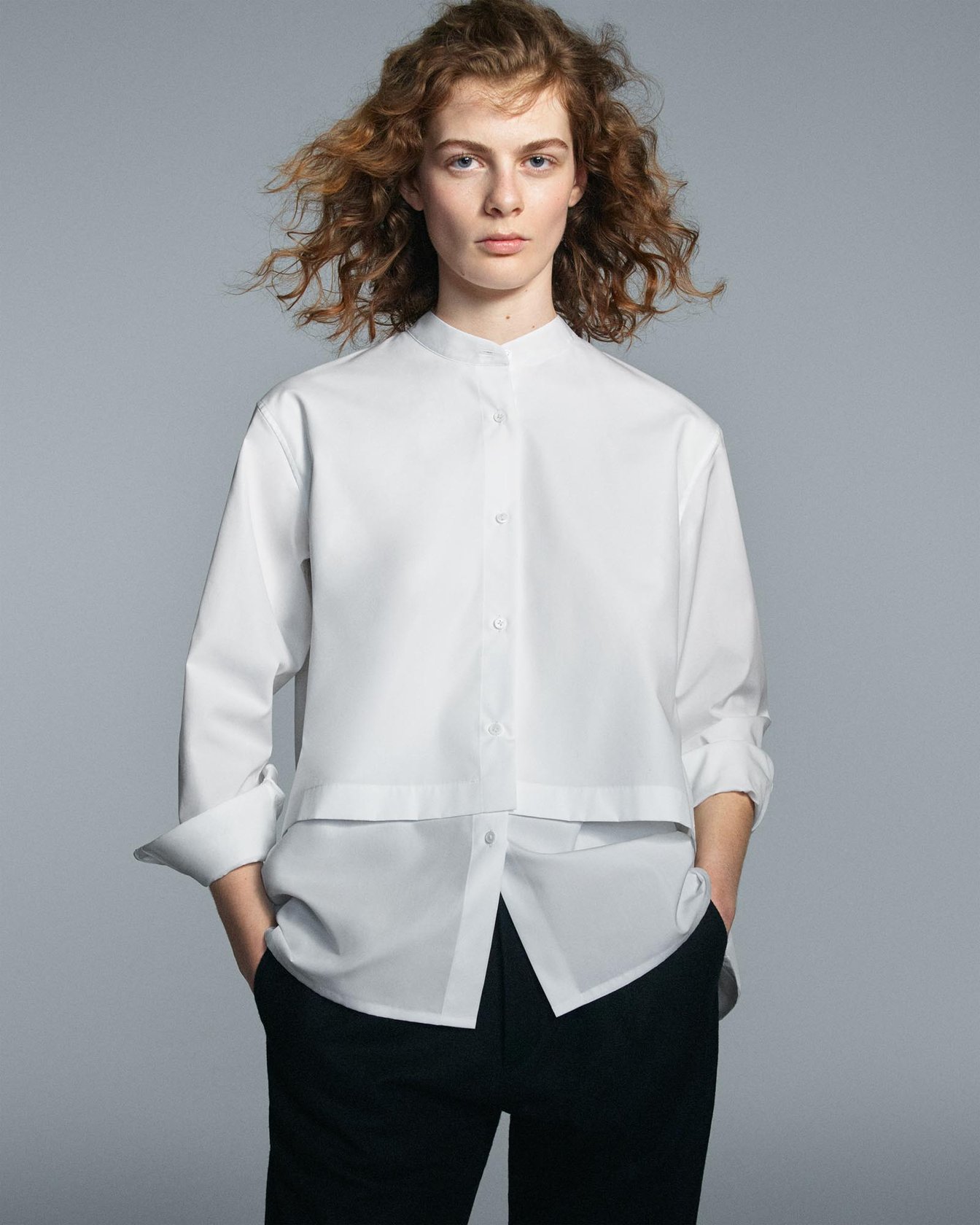 トップスは、ボックスシルエットで比翼仕立てに太めの両玉縁ポケットが特徴の「ダブルフェイスシャツジャケット」(1万4900円)に、「ファインゲージカシミヤクルーネックセーター(長袖)」(1万2900円)と、短めの着丈で細かなピンタックを入れた「スーピマコットンタックシャツ(長袖)」(4990円)を着用。パンツは「コットンテーパードパンツ」(4990円)です。